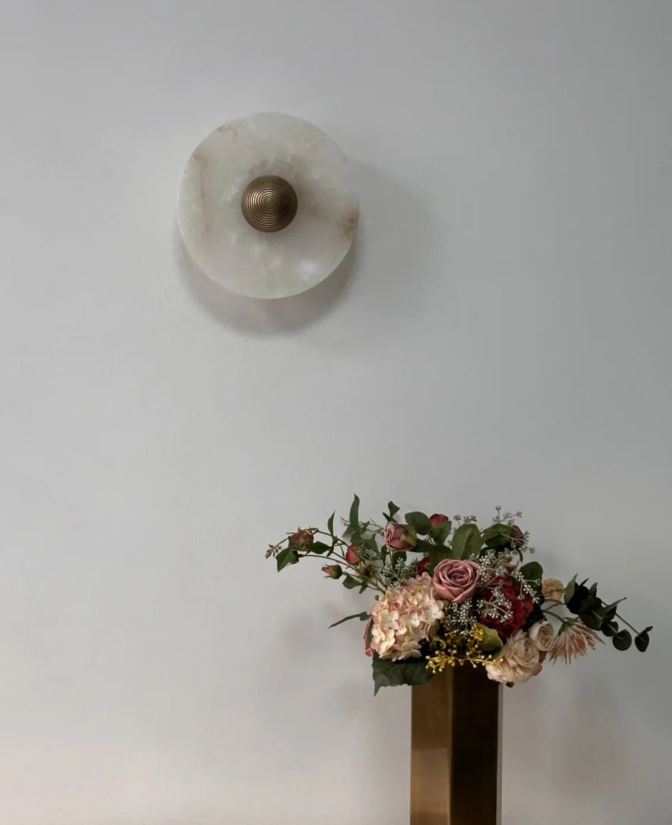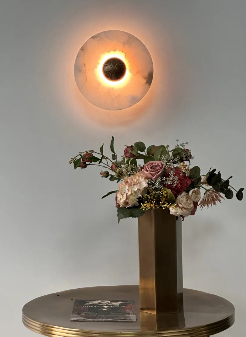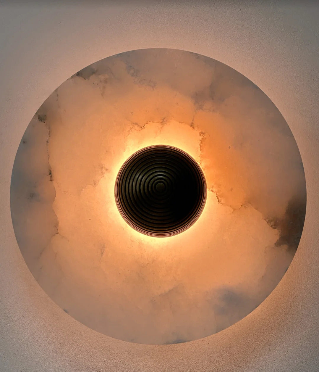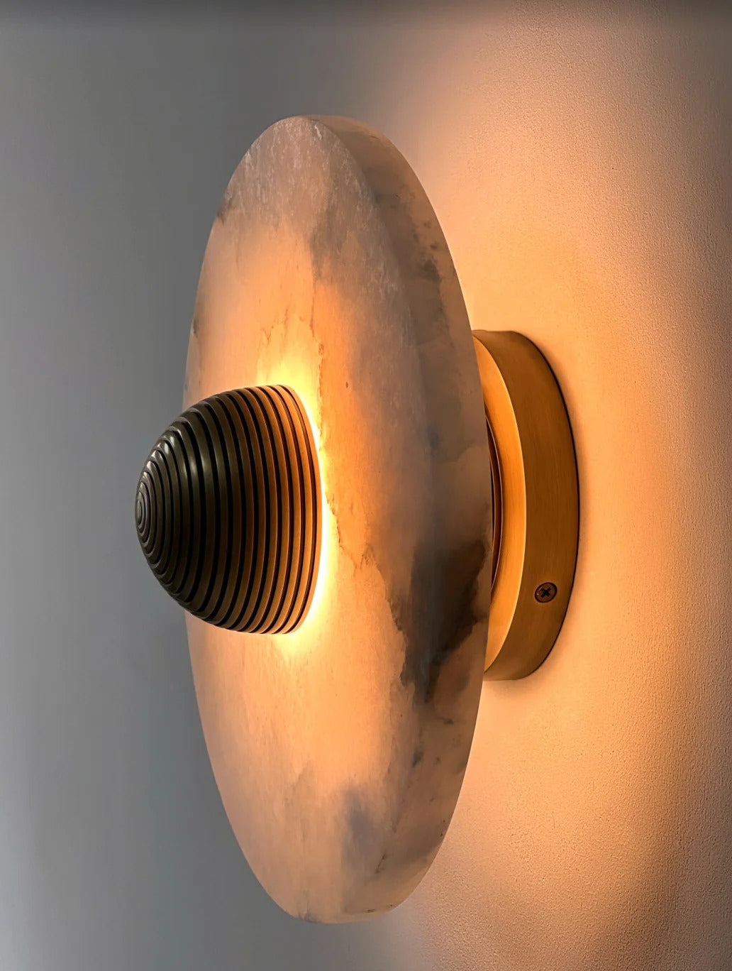 - The hidden light source within the sconce illuminates the alabaster, highlighting its translucency and the interplay between solid and permeable forms. The Median Surface Sconce Single is a stunning addition to any space, adding a touch of sophistication and artistic flair.