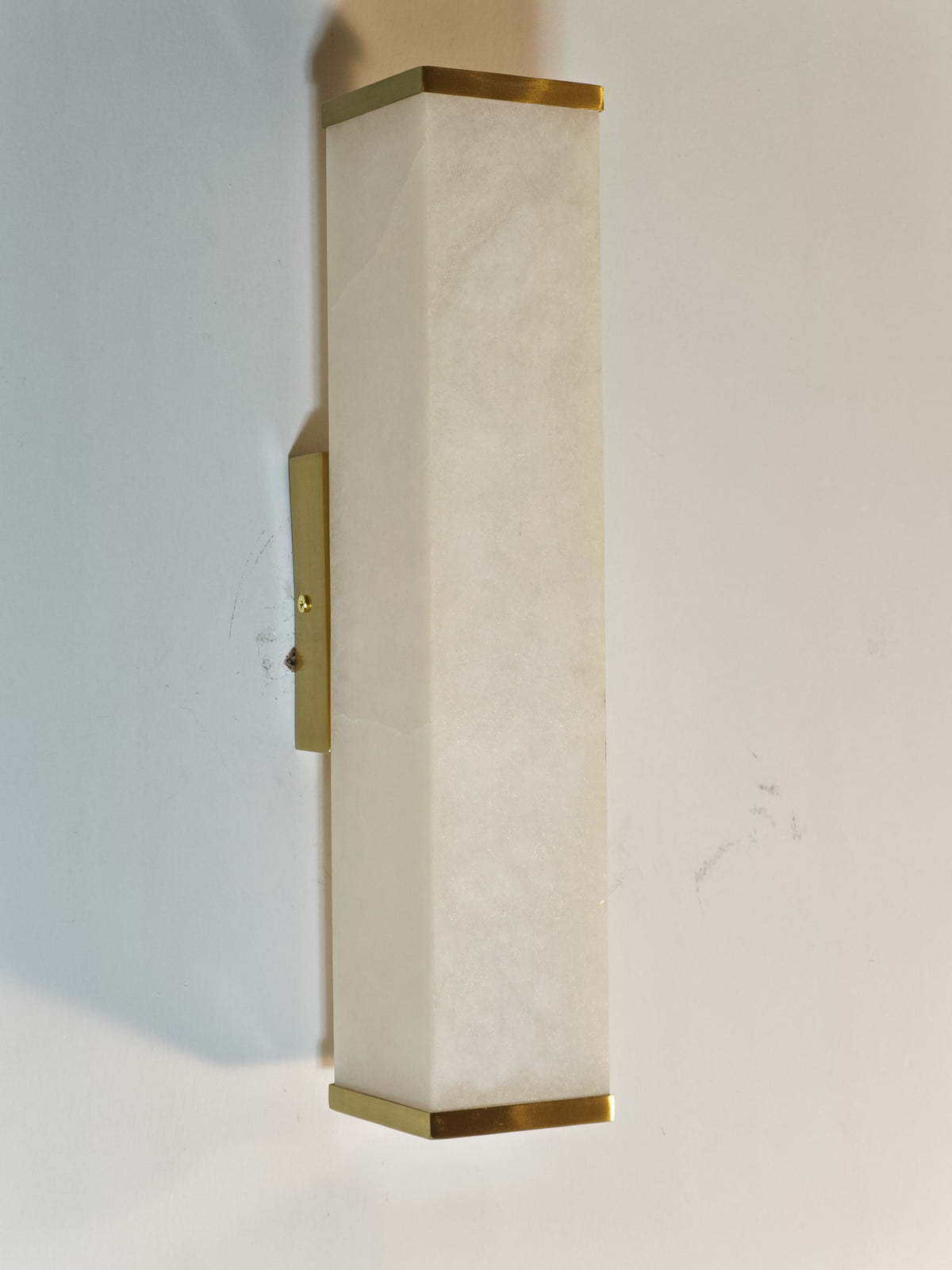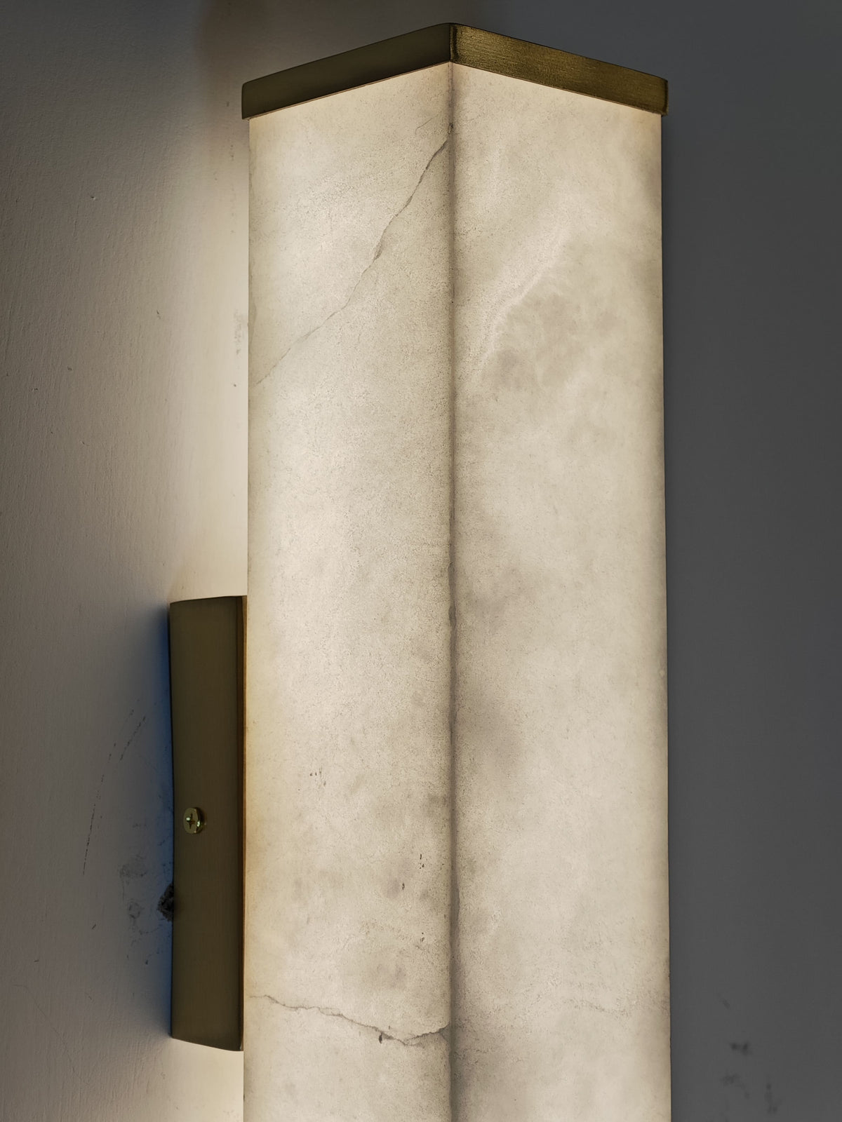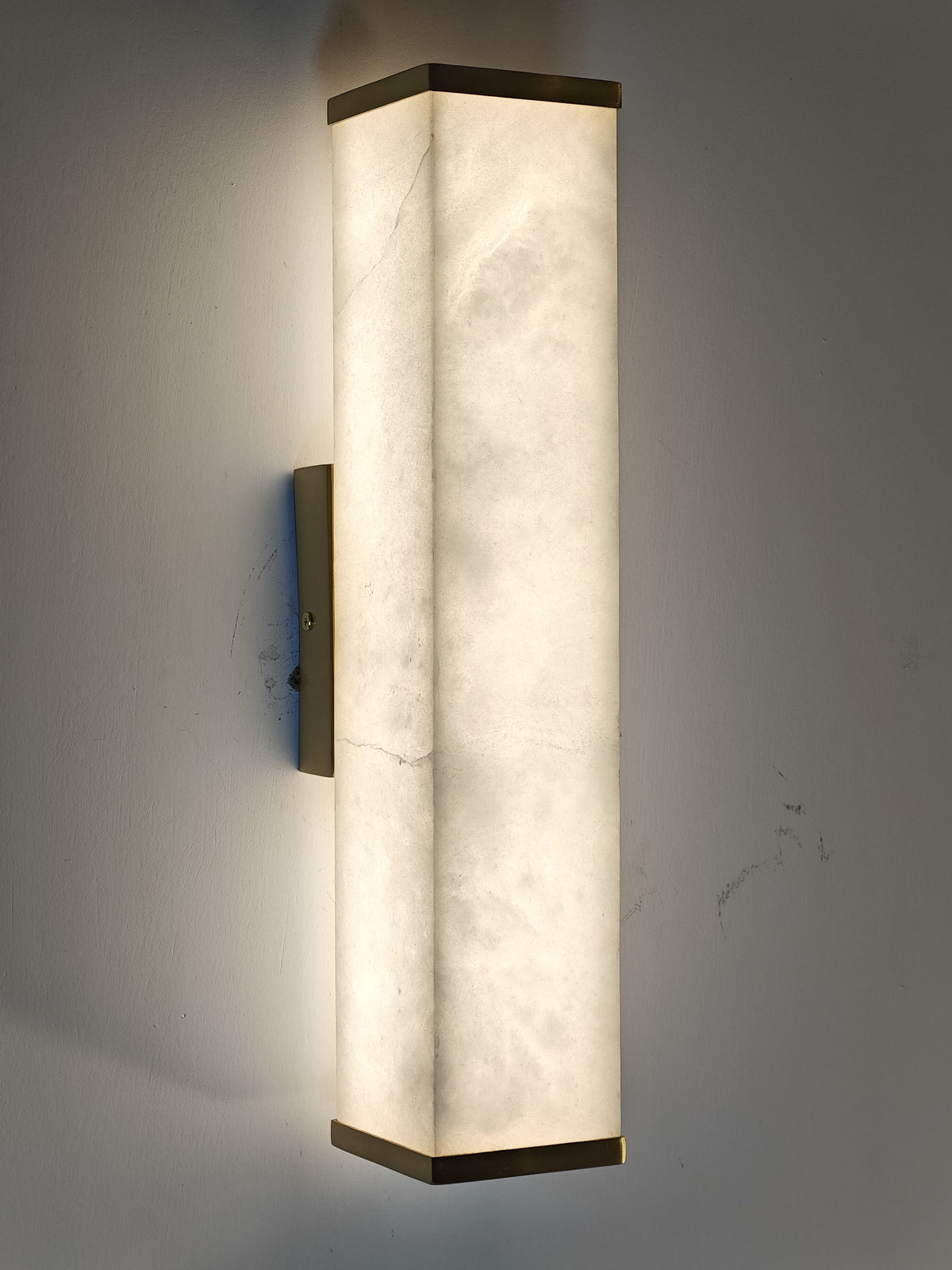 - The Moore Alabaster Wall Sconce features a single, beautiful rectangular slab of genuine alabaster that serves as the diffuser. When illuminated, the stone's delicate, natural veining and soft translucency create a warm, inviting glow, making every piece genuinely unique. Minimalist brass components—expertly polished or finished—anchor the alabaster to the wall, adding a subtle yet sophisticated touch of luxury that beautifully complements the stone's organic texture.