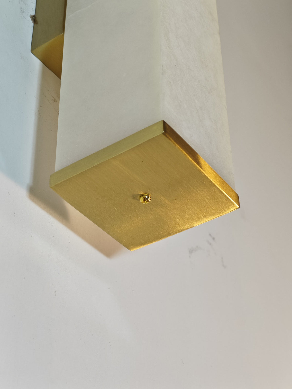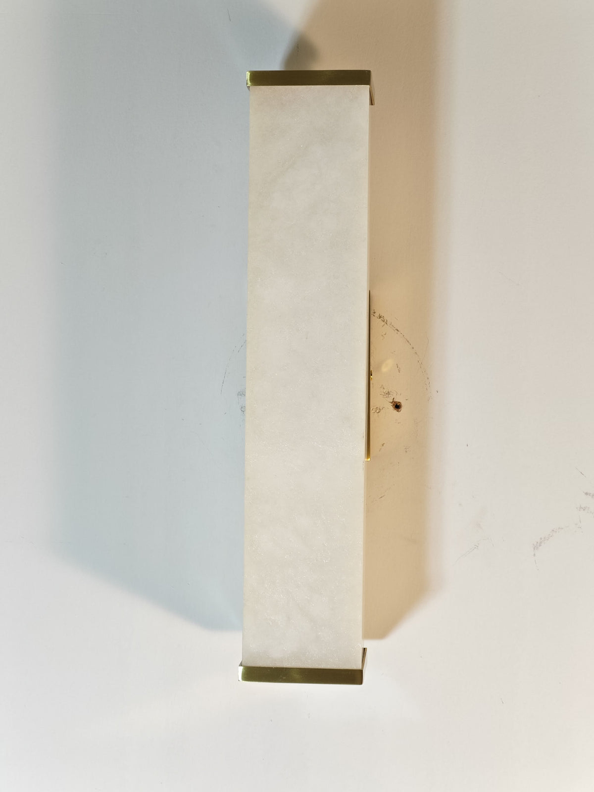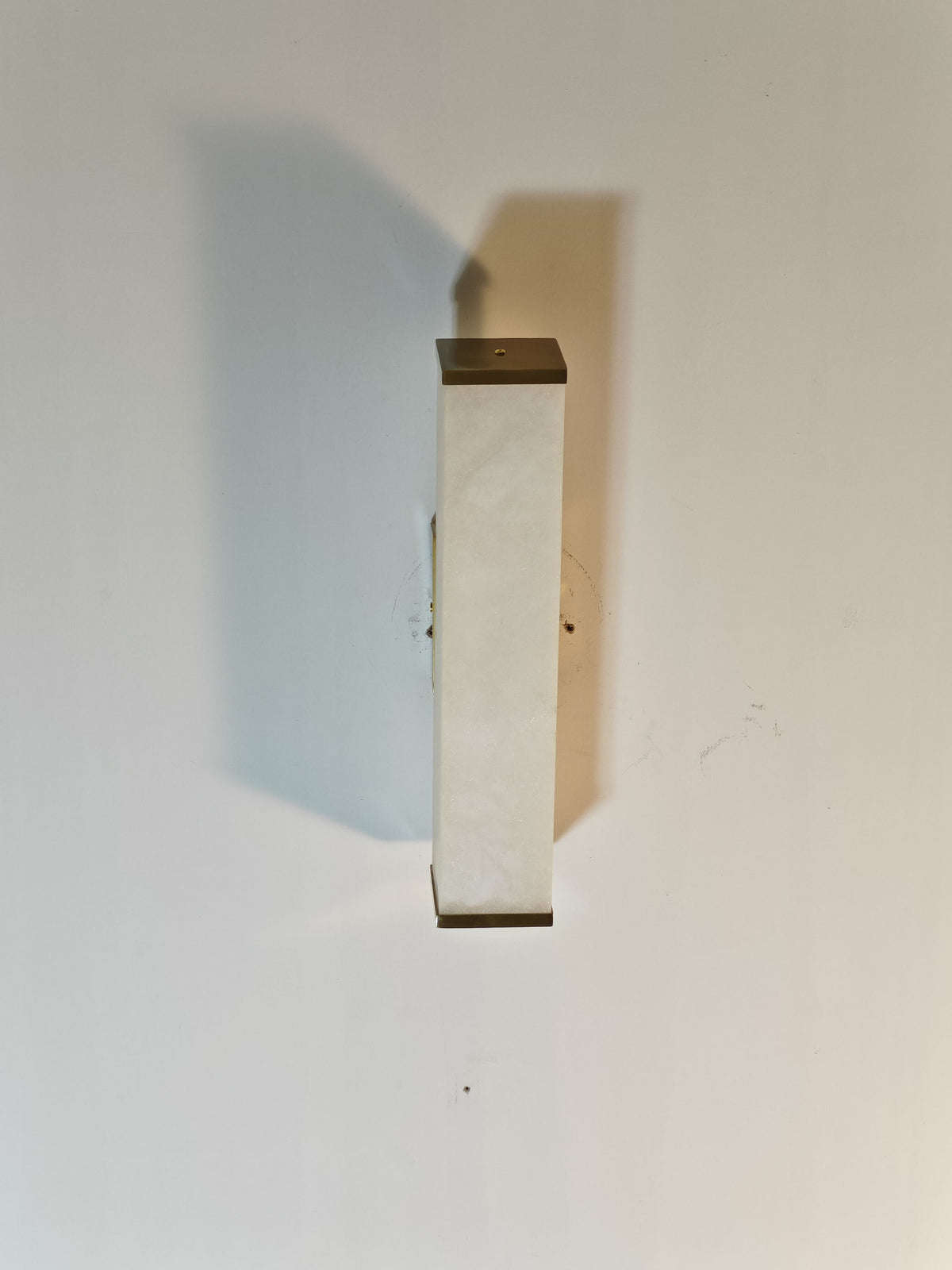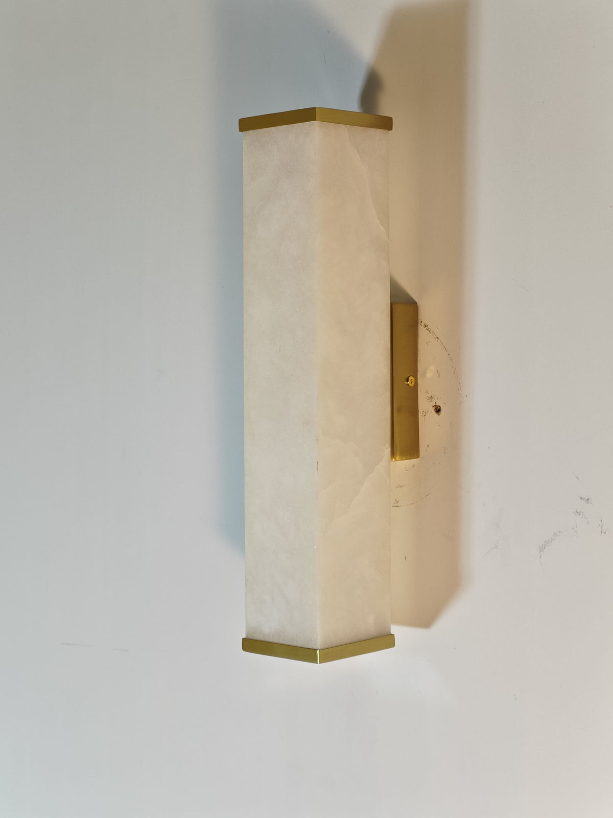 - The Moore Alabaster Wall Sconce features a single, beautiful rectangular slab of genuine alabaster that serves as the diffuser. When illuminated, the stone's delicate, natural veining and soft translucency create a warm, inviting glow, making every piece genuinely unique. Minimalist brass components—expertly polished or finished—anchor the alabaster to the wall, adding a subtle yet sophisticated touch of luxury that beautifully complements the stone's organic texture.