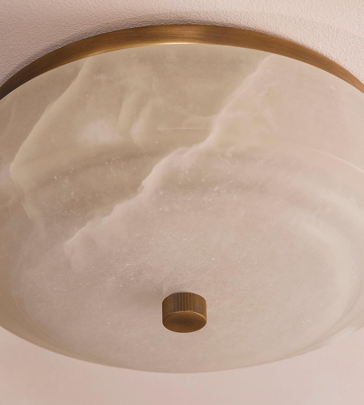 - Introducing the Odessa Flush Mount Light, where art meets illumination. Meticulously handcrafted from turned white alabaster, each ceiling light is entirely unique, boasting a captivating marbled effect that ensures no two pieces are exactly alike.