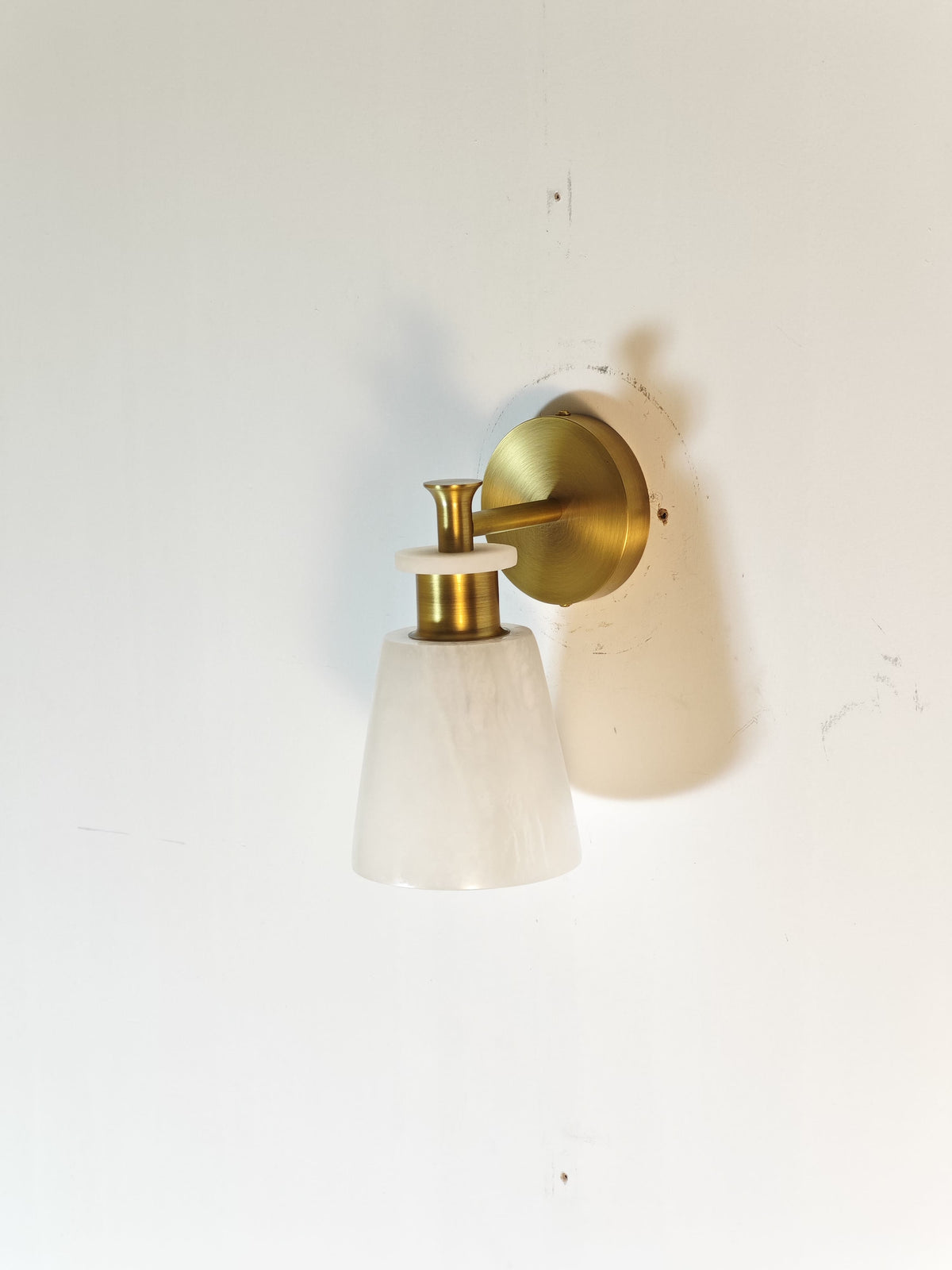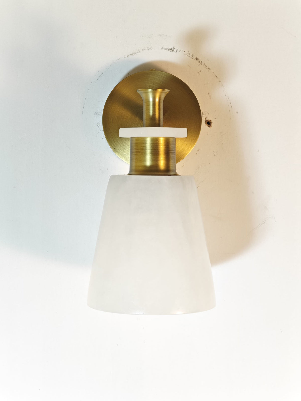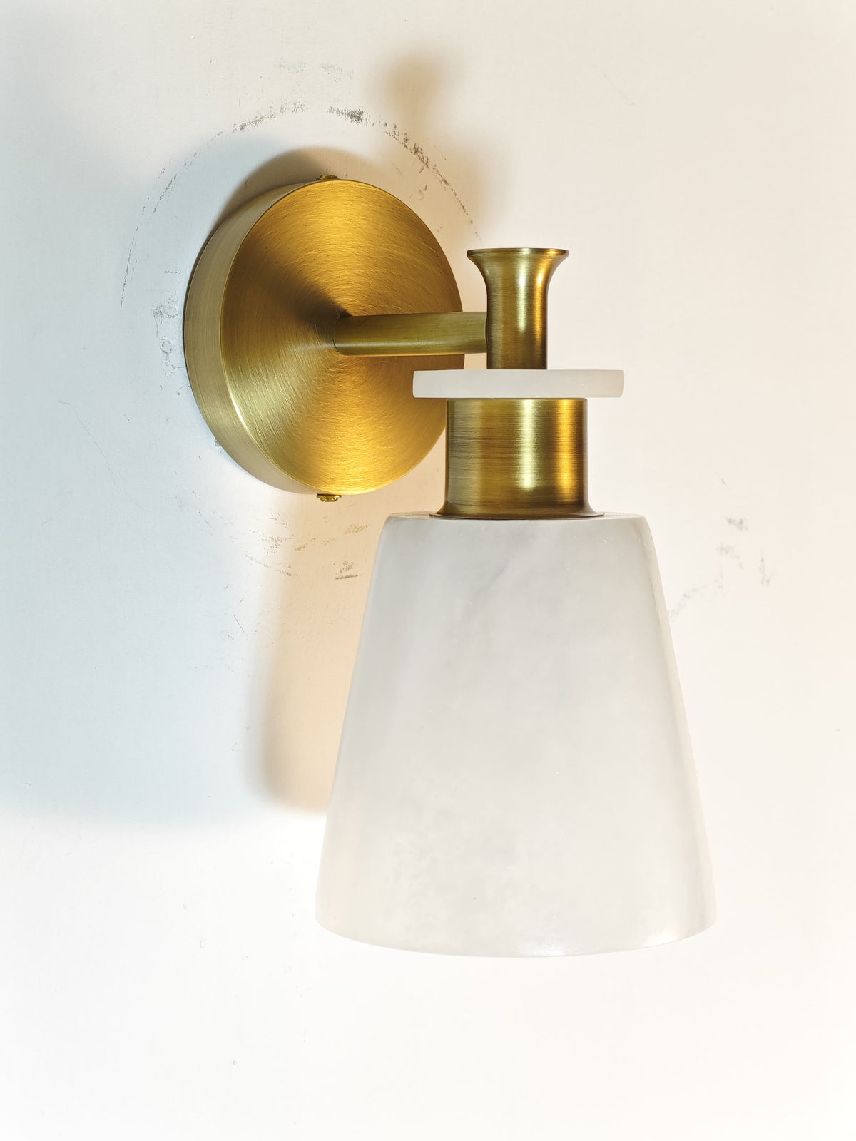 - Experience the beauty of natural light with the Polly Alabaster Wall Sconce. The unique tapered alabaster shade, paired with a sleek brass frame, casts a warm, inviting glow. This stunning piece is not just a light fixture; it's a work of art that will elevate your home decor.