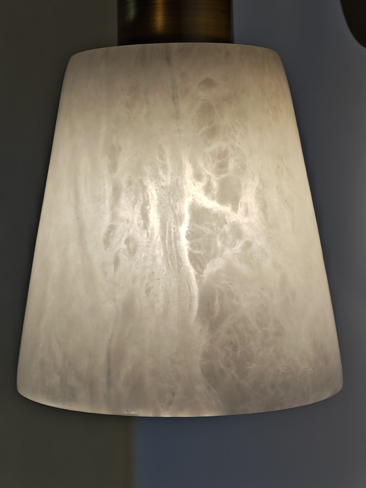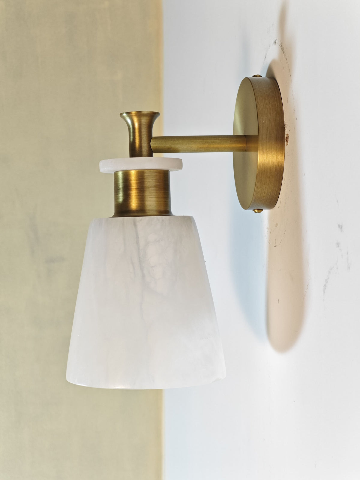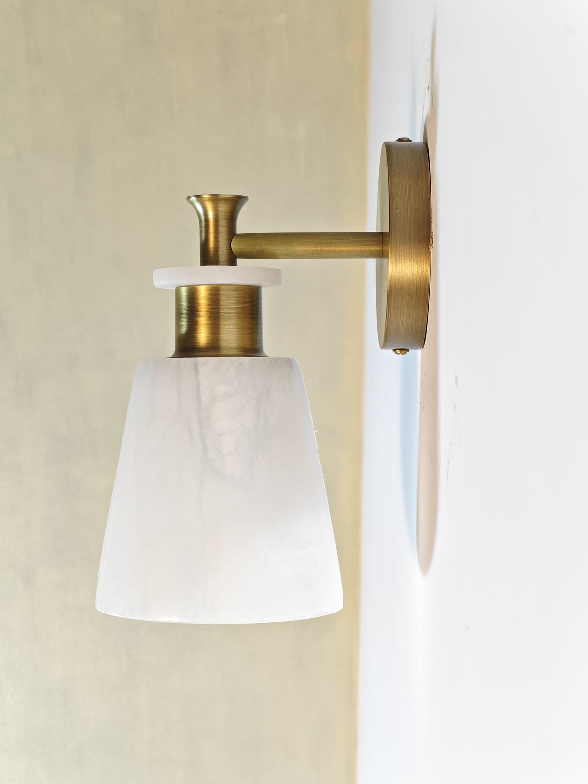 - Experience the beauty of natural light with the Polly Alabaster Wall Sconce. The unique tapered alabaster shade, paired with a sleek brass frame, casts a warm, inviting glow. This stunning piece is not just a light fixture; it's a work of art that will elevate your home decor.
