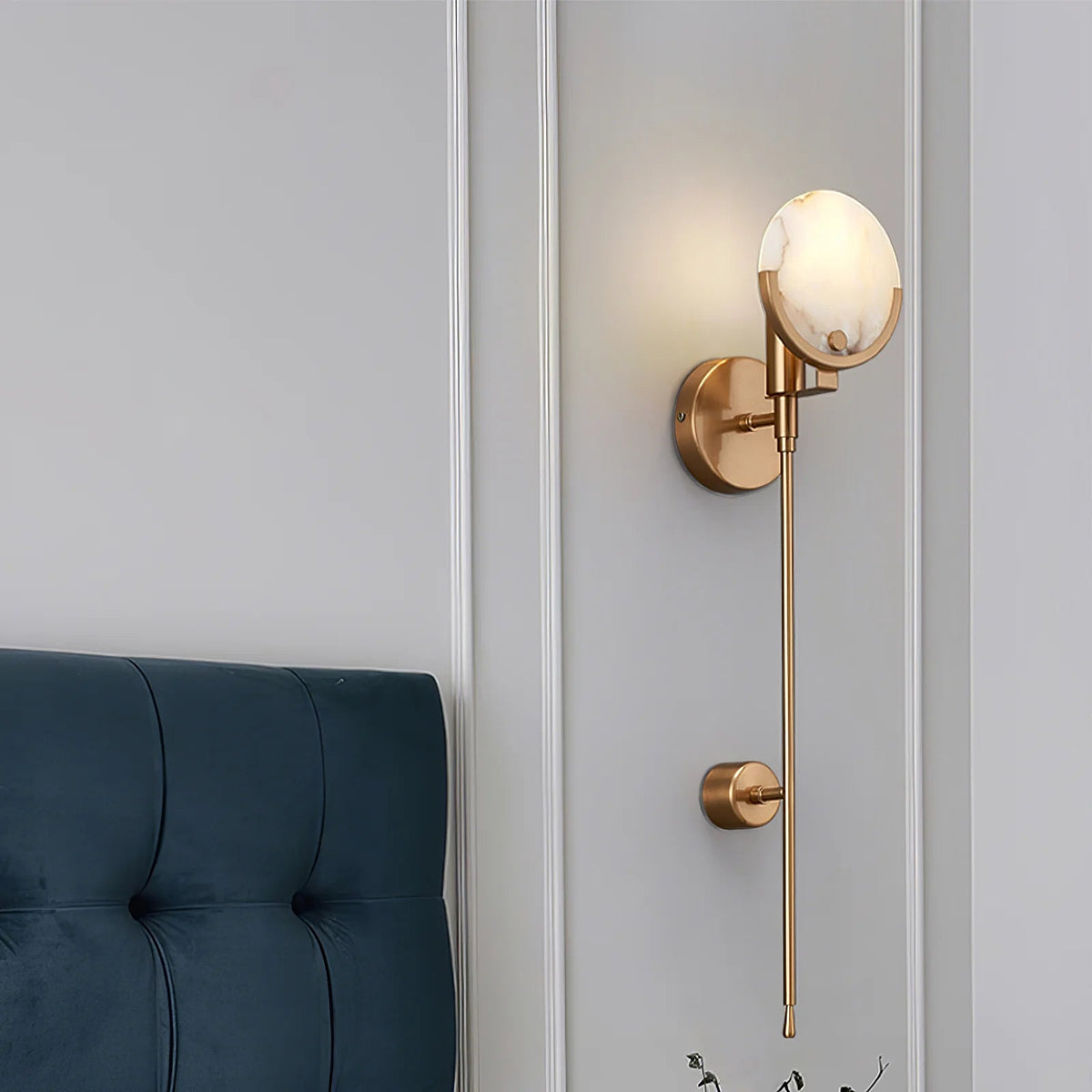 - Enhance your space with the Tail Alabaster Wall Sconce, a perfect blend of refined craftsmanship and organic beauty. Its sleek brass tail structure adds a touch of understated elegance, while the translucent Spanish marble light diffuser creates a warm, inviting glow. Each alabaster shade features unique, naturally formed patterns, ensuring a one-of-a-kind piece that brings sophistication to any room.