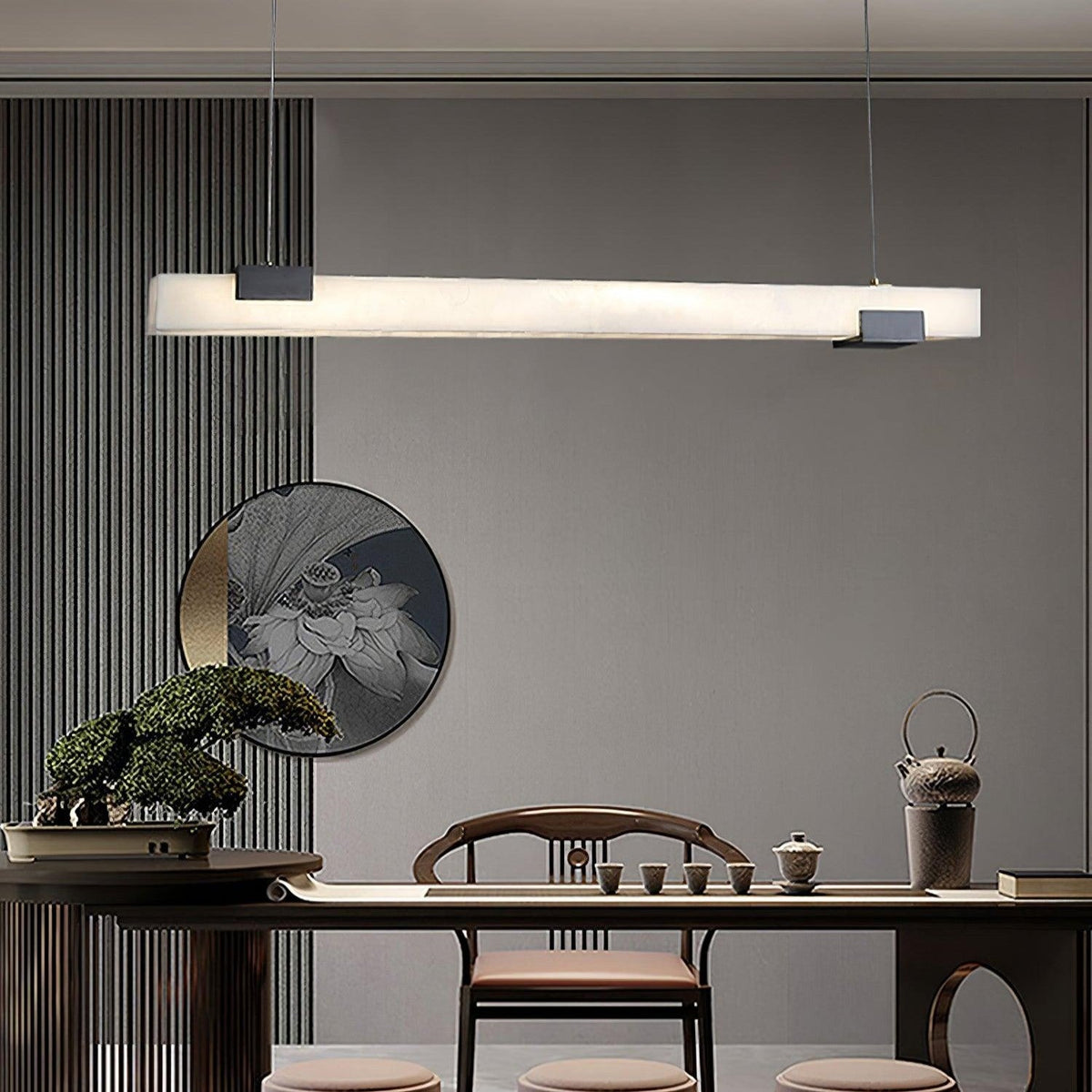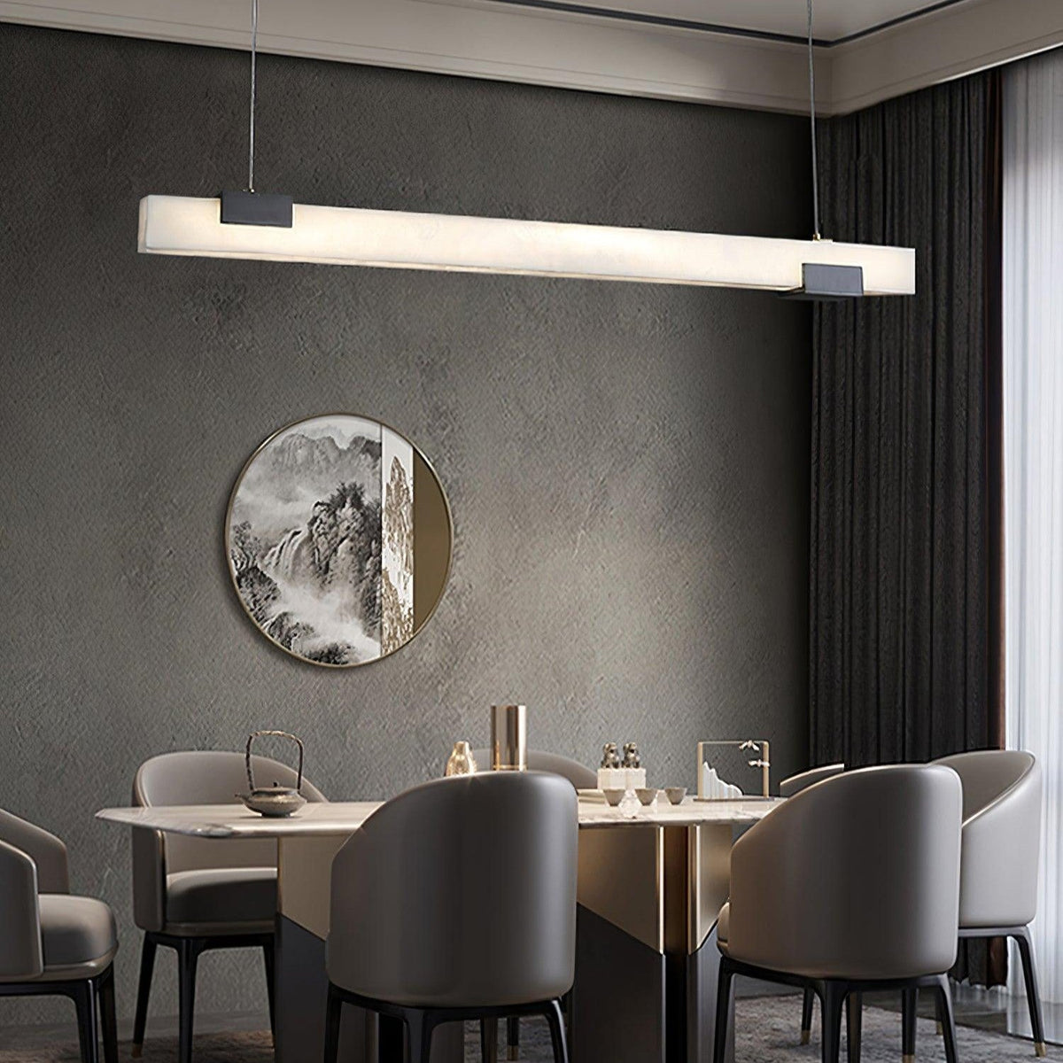 - Elevate your kitchen or dining area with the Trixie Alabaster Island Pendant Lamp, a stunning centerpiece that exudes modern elegance. This pendant light features an elongated alabaster lampshade, creating a captivating visual impact with its natural stone patterns and soft, diffused glow. The Trixie blends luxury with functionality, offering a refined yet contemporary touch to any space.