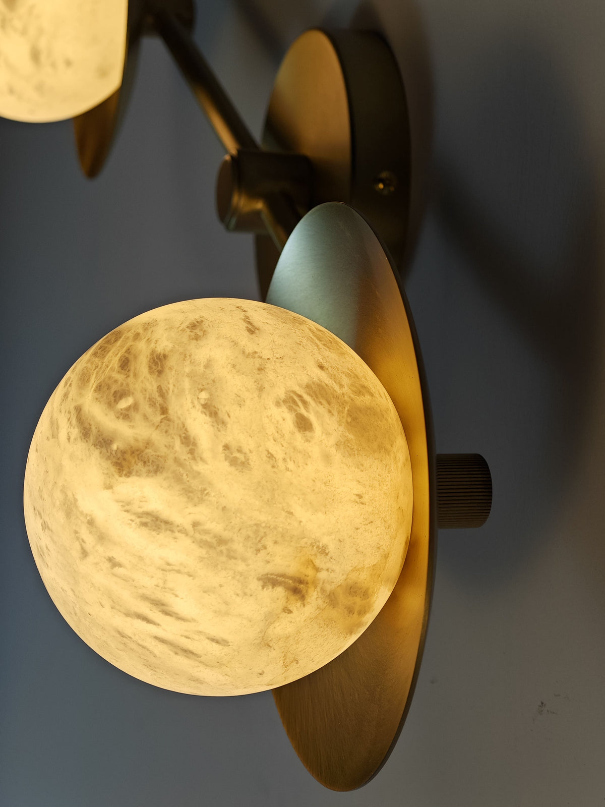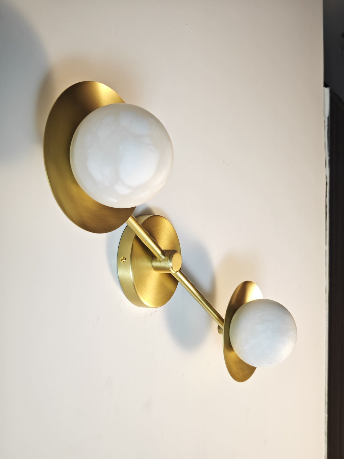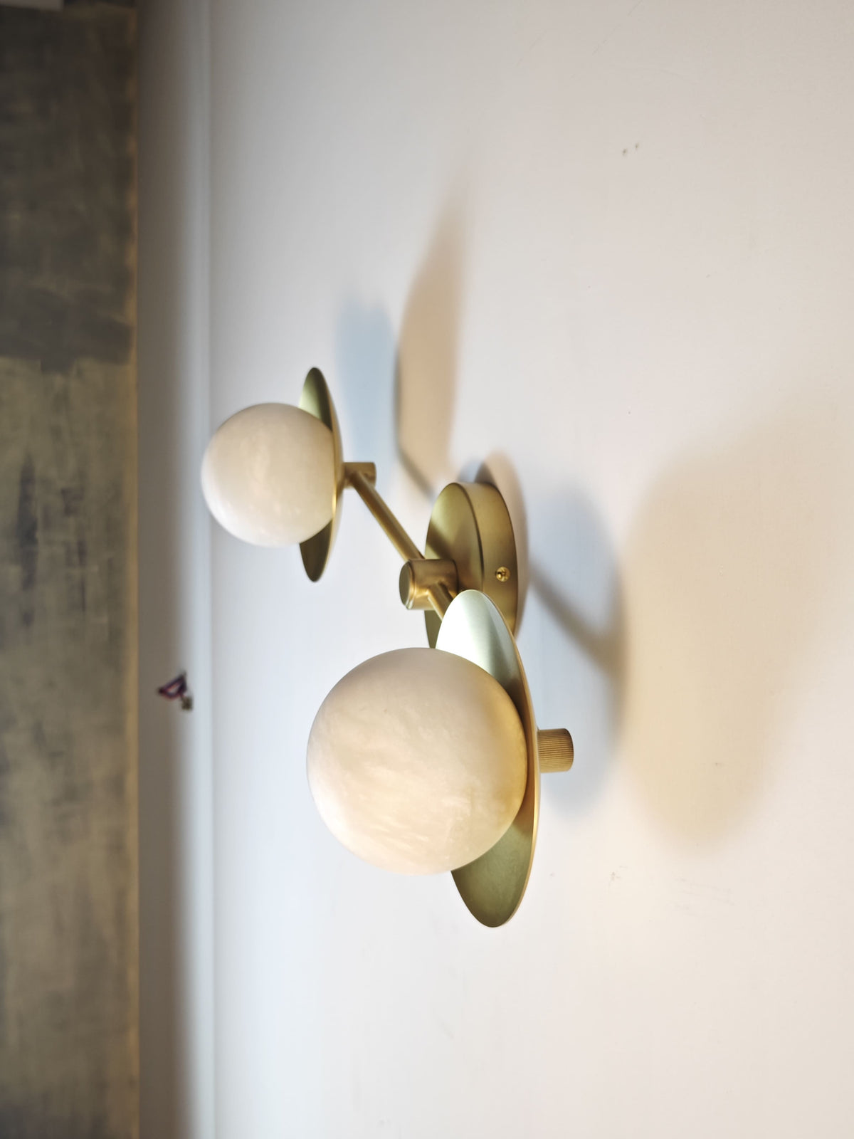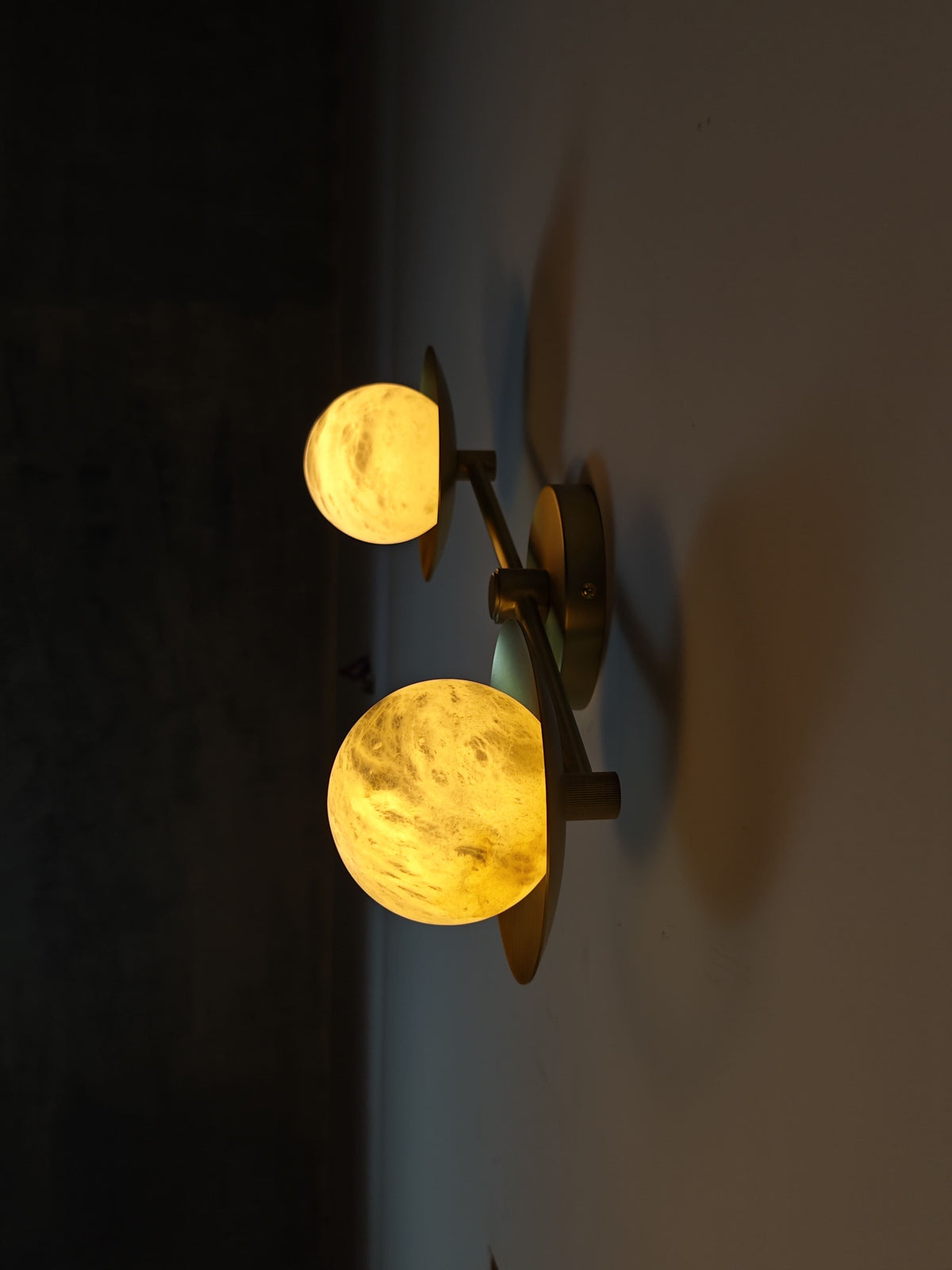 - Illuminate your space with the timeless beauty of the Twin Stars Alabaster Sconce, a stunning wall light that blends natural elegance with artisanal craftsmanship. Each sconce features two hand-carved alabaster globe shades, delicately shaped to diffuse a warm, ambient glow. The smooth, semi-translucent stone showcases subtle veining, ensuring no two pieces are exactly alike.