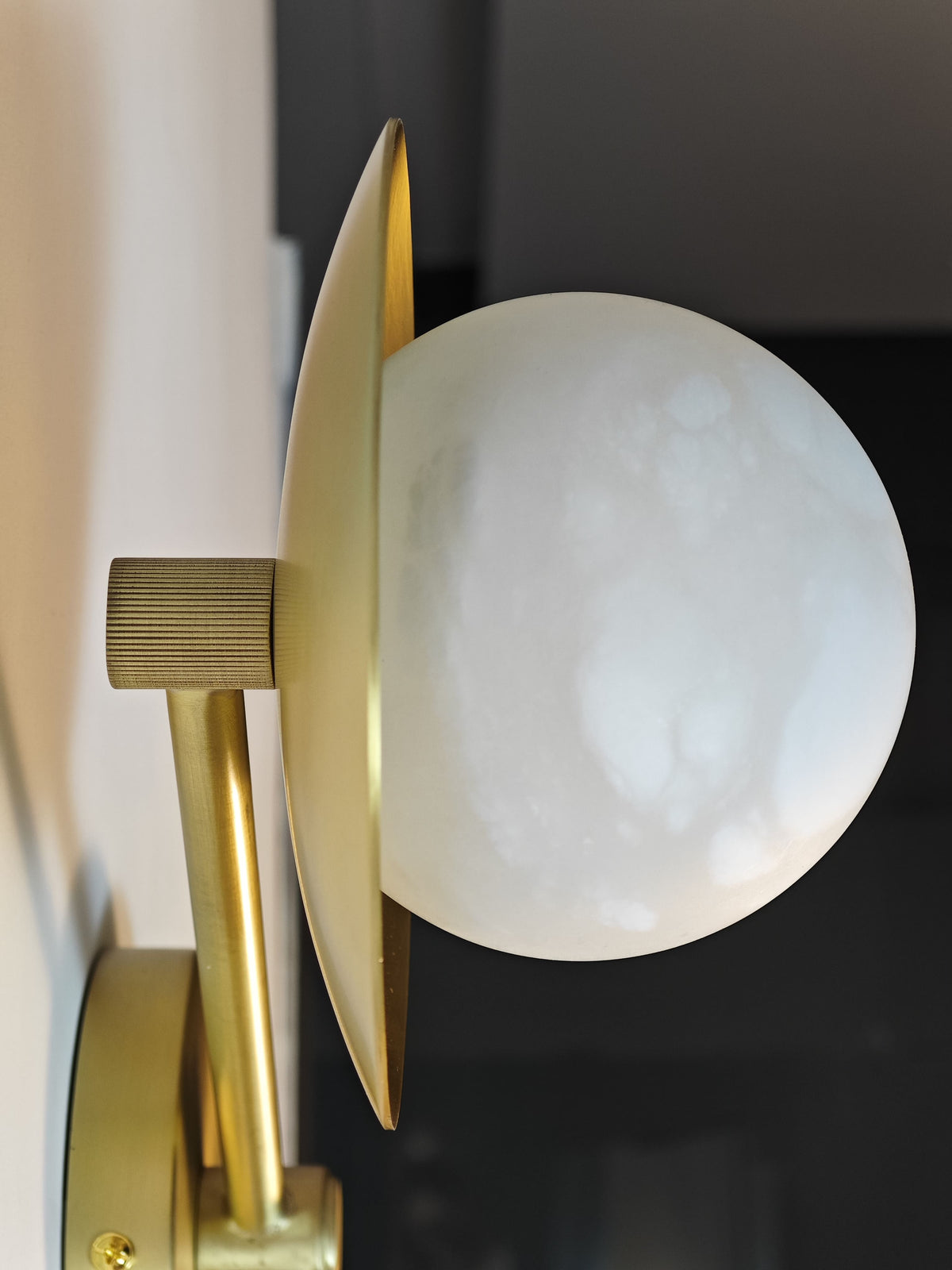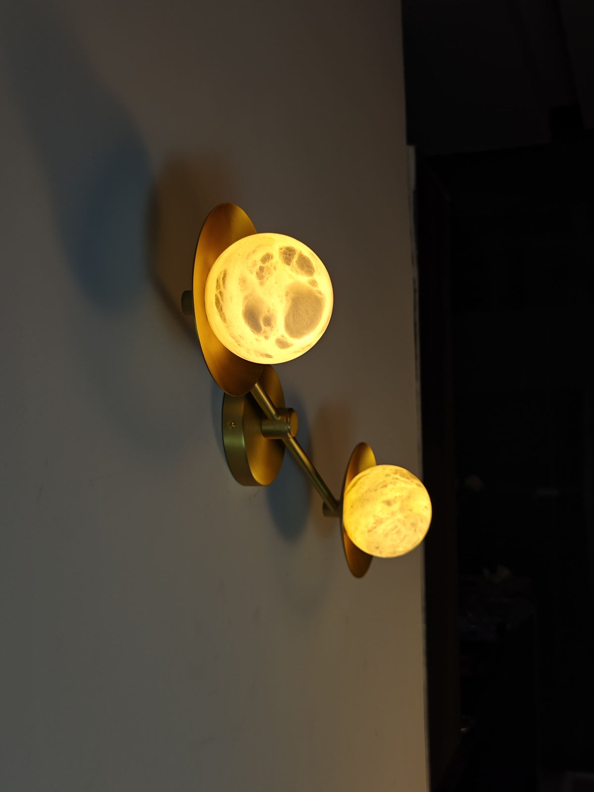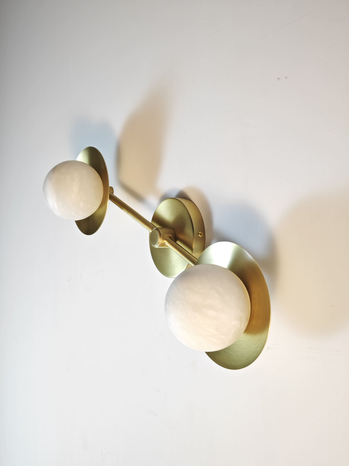 - Illuminate your space with the timeless beauty of the Twin Stars Alabaster Sconce, a stunning wall light that blends natural elegance with artisanal craftsmanship. Each sconce features two hand-carved alabaster globe shades, delicately shaped to diffuse a warm, ambient glow. The smooth, semi-translucent stone showcases subtle veining, ensuring no two pieces are exactly alike.