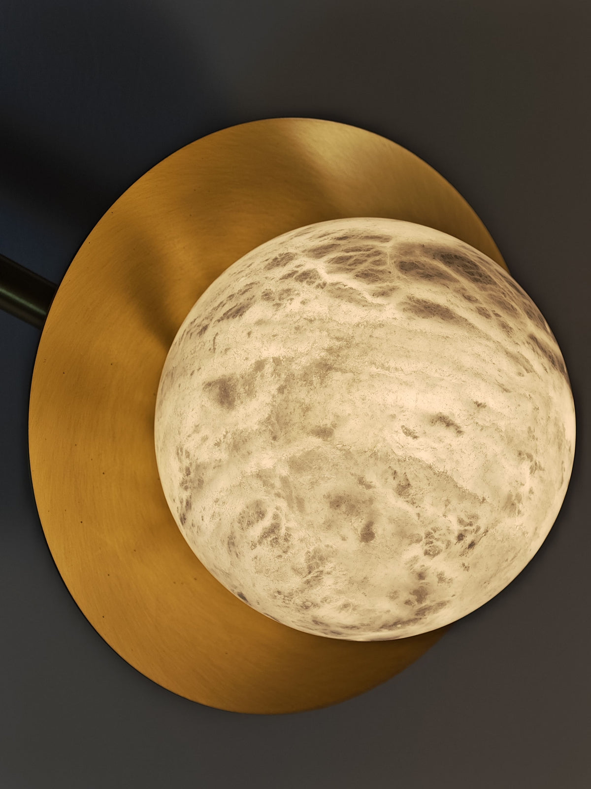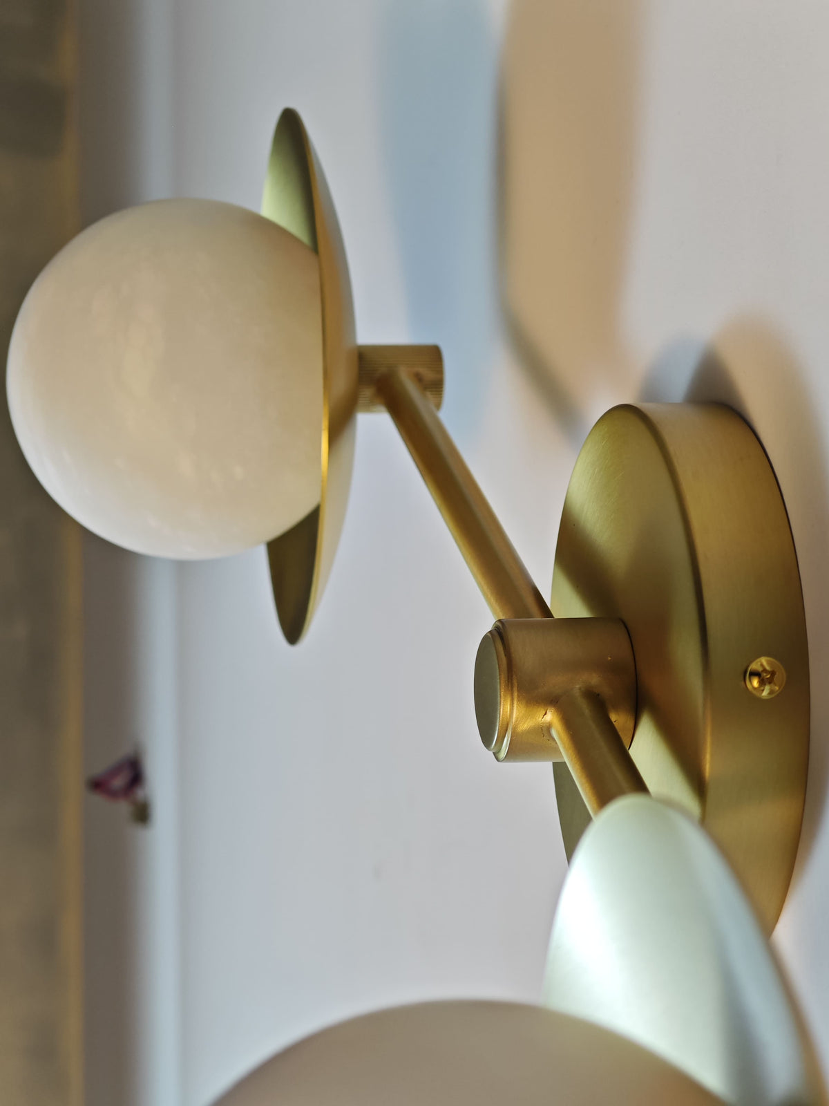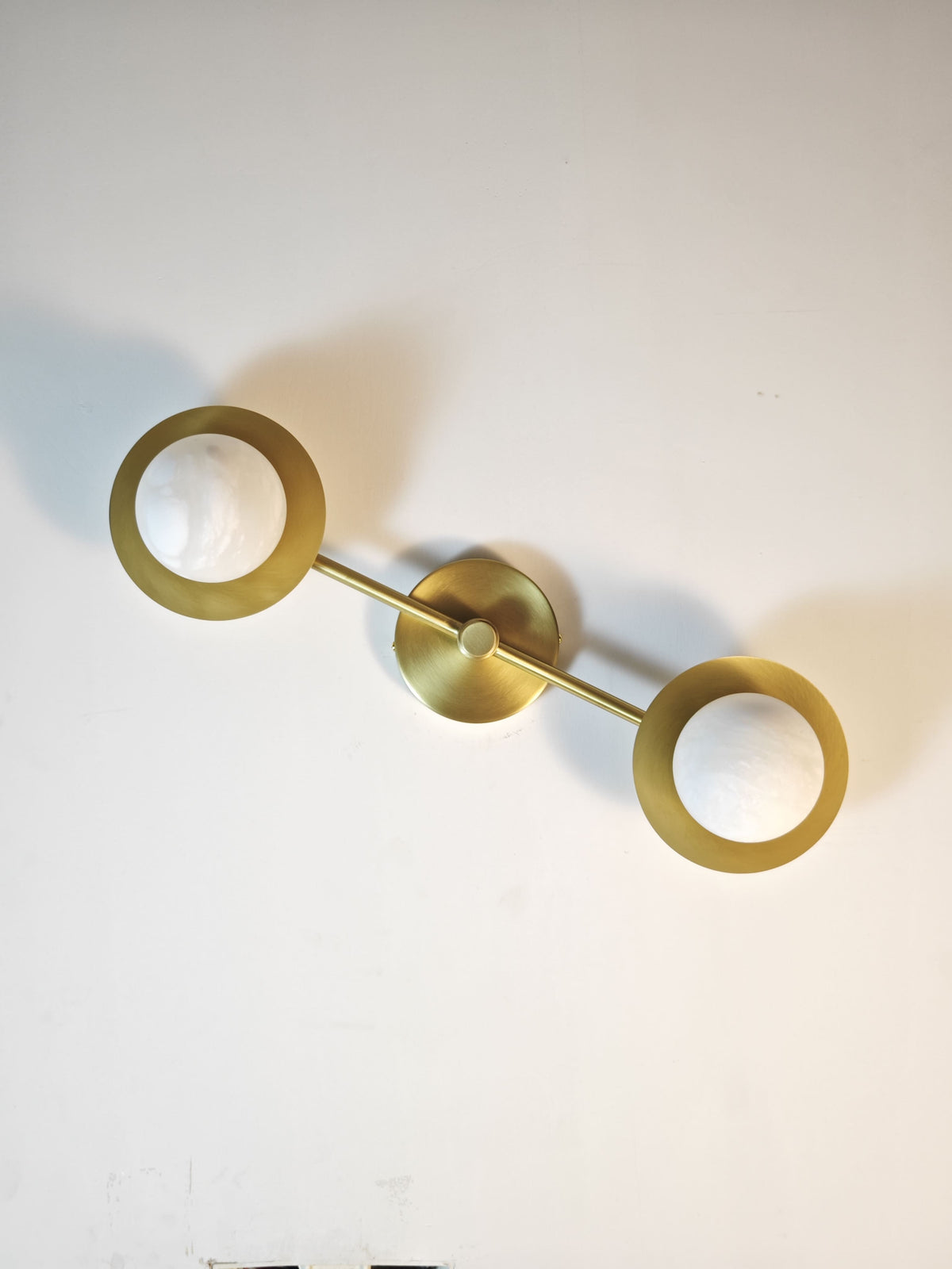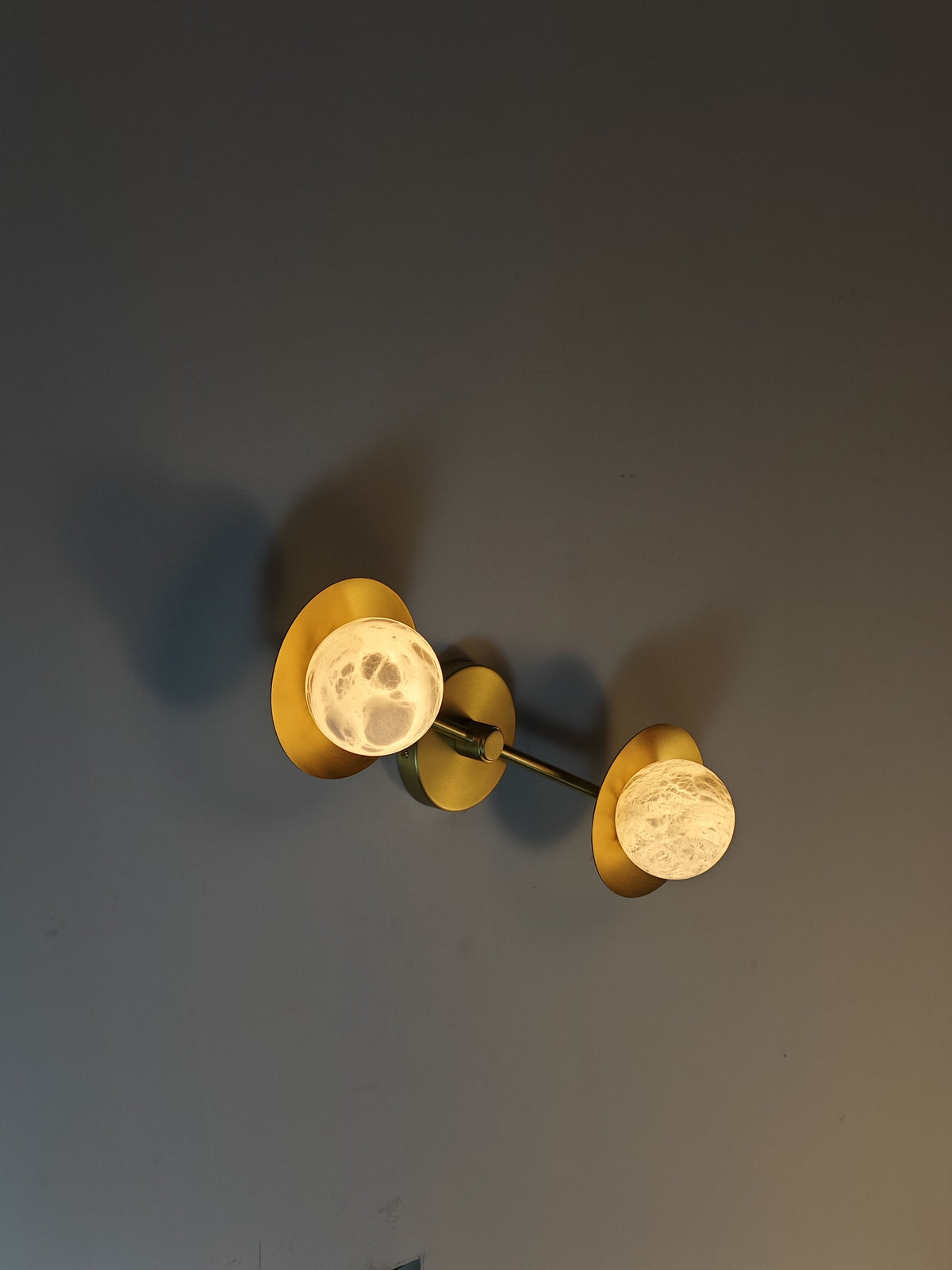 - Illuminate your space with the timeless beauty of the Twin Stars Alabaster Sconce, a stunning wall light that blends natural elegance with artisanal craftsmanship. Each sconce features two hand-carved alabaster globe shades, delicately shaped to diffuse a warm, ambient glow. The smooth, semi-translucent stone showcases subtle veining, ensuring no two pieces are exactly alike.