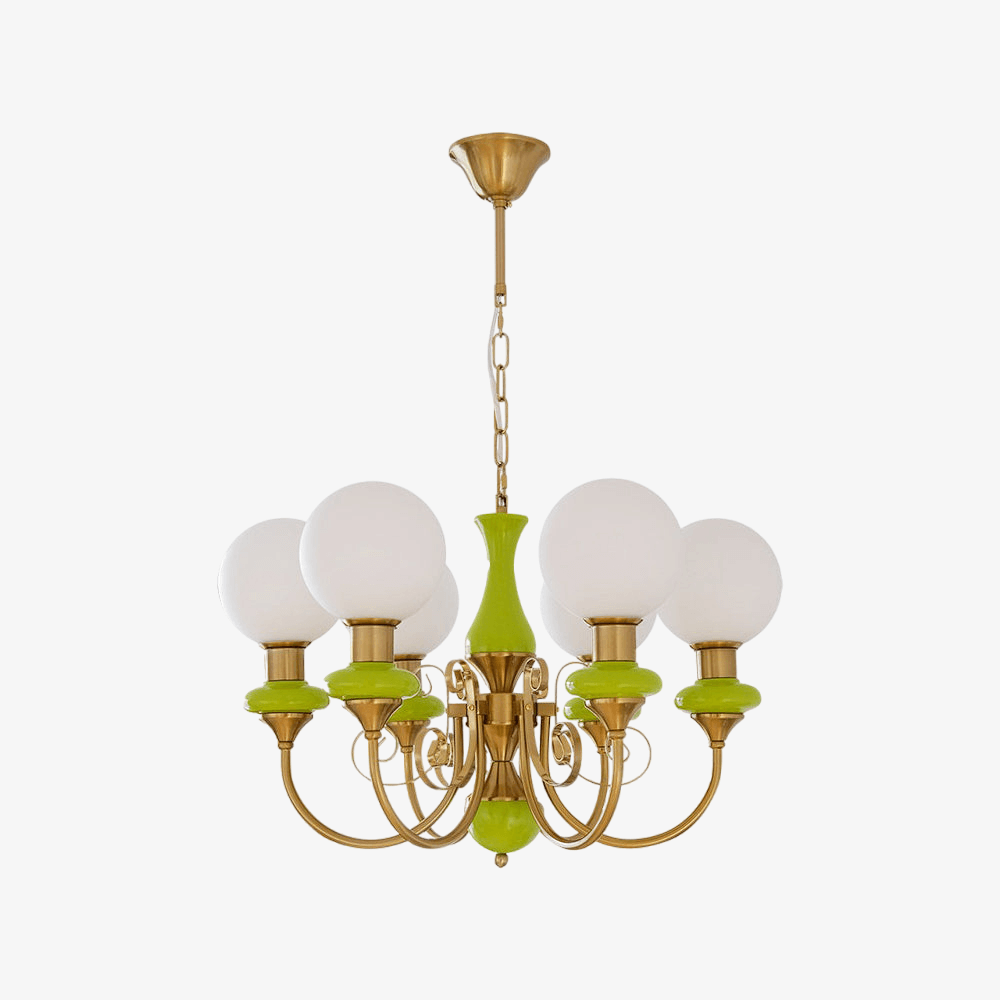 Specifications1. Fixture Type: Chandeliers2. Style: Vintage 3. Body Finishes: Brass & Green / Fade Blue 4. Shade Finishes: White 5. Main Material: Glass (Shade) | Iron (Body) 6. Scenes to be Used: Indoor Only (IP20) 7. Light Source Base: E26 | E27 8. Bulb Included: Yes 9. Number of Bulbs Required: 3 / 6 / 8 10. Kelvin Range: 3000K 11. Dimmable: No 12. Remote Control: No 13. Voltage: AC 110V-240V 14. Warranty: Two Years 15. Assembly Required: Yes 16. Installation Required: Yes 17. Sloped Ceiling Compatible: Yes 18. Adjustable Length: Yes 19. Wiring: Hardwired 20. Length of Chain: 12 inches | 30 centimeters 21. Compatible with Household Dimmer Switch: Yes 22. Product Care: Wipe clean with damp cloth |