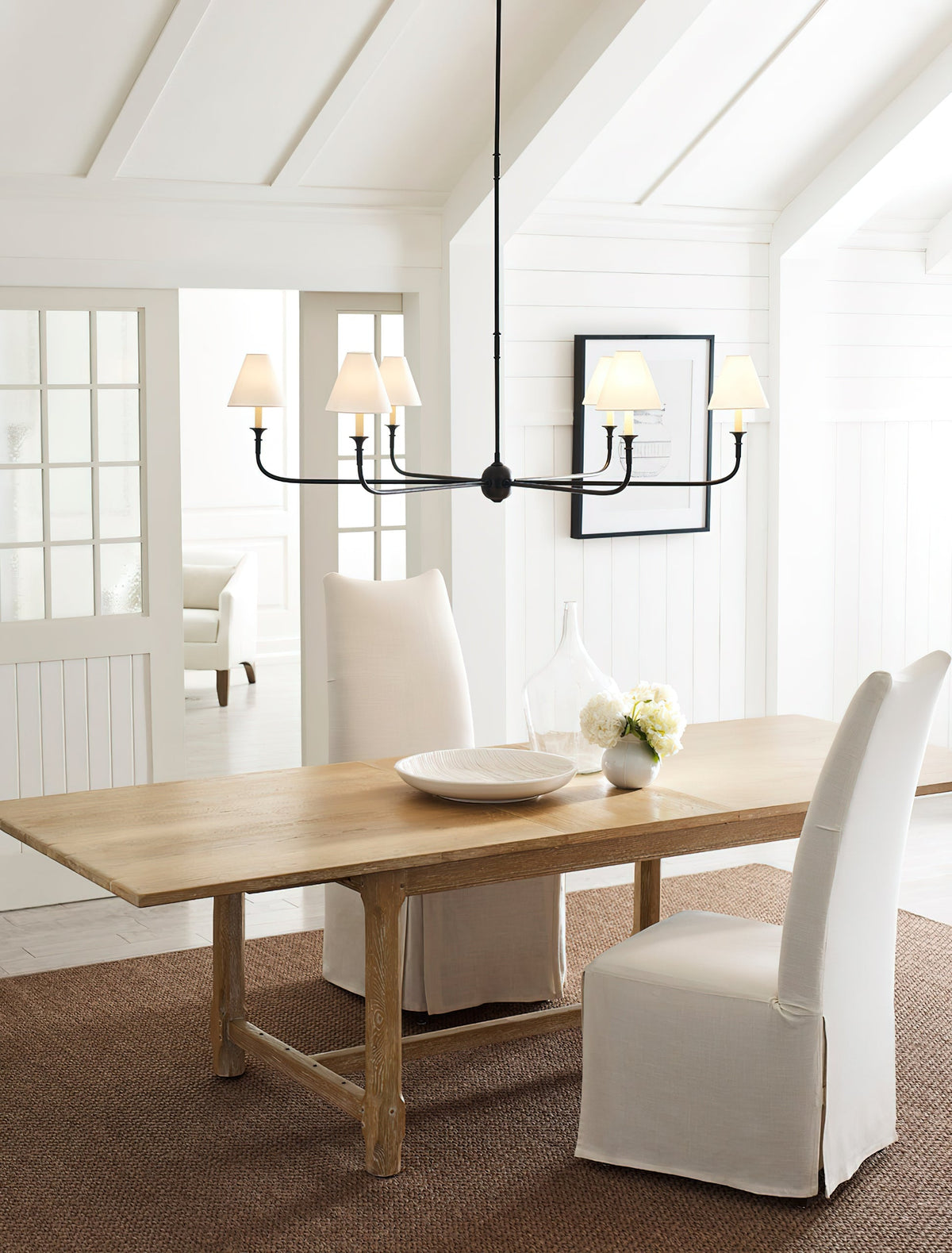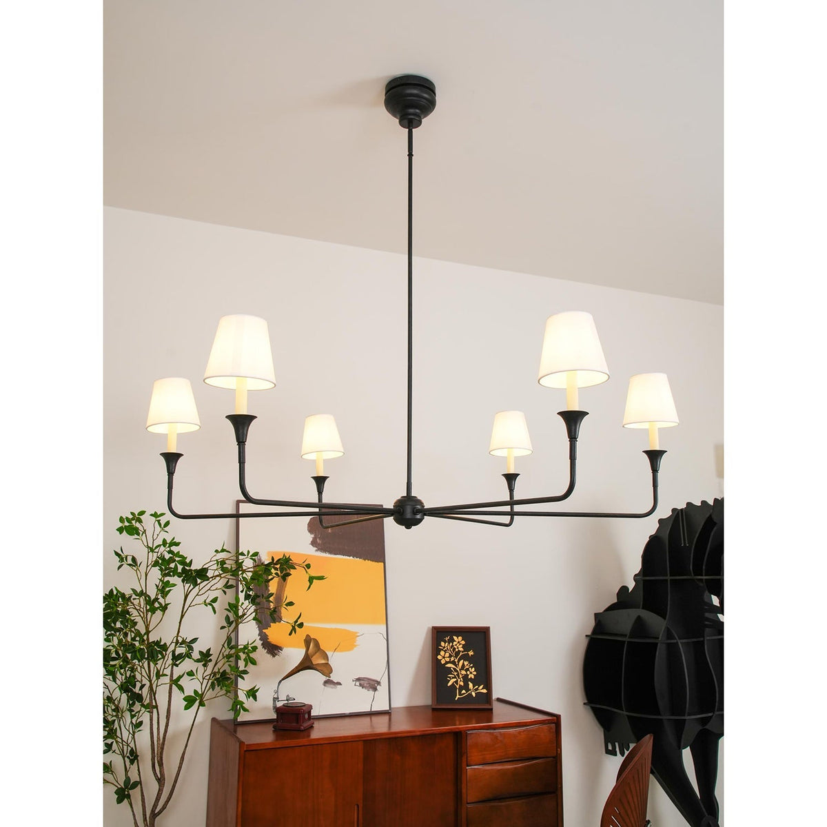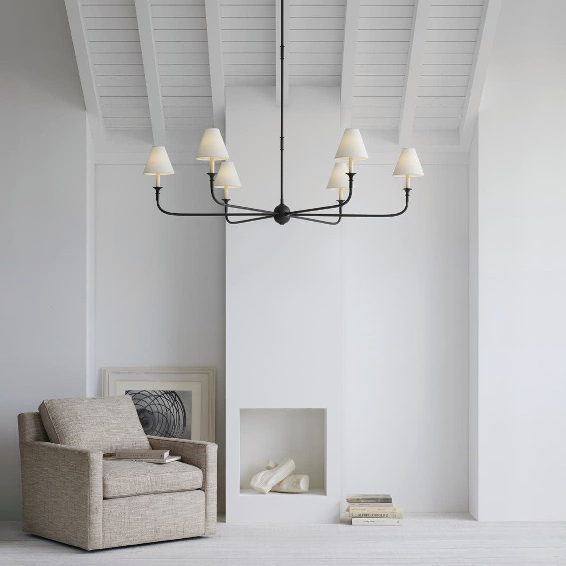 - Experience the timeless elegance of the Raquel Chandelier. This stunning light fixture combines clean, contemporary lines with a touch of classic charm. A sleek canopy supports a single down rod, accented by a spherical element from which gracefully curved metal arms extend, forming flared candle plates. The chandelier's crisp linen shades add a refined touch, while the design offers a simple blend of form and function. Perfect for a variety of interior spaces, the Raquel Chandelier is a beautiful and functional addition to any home.