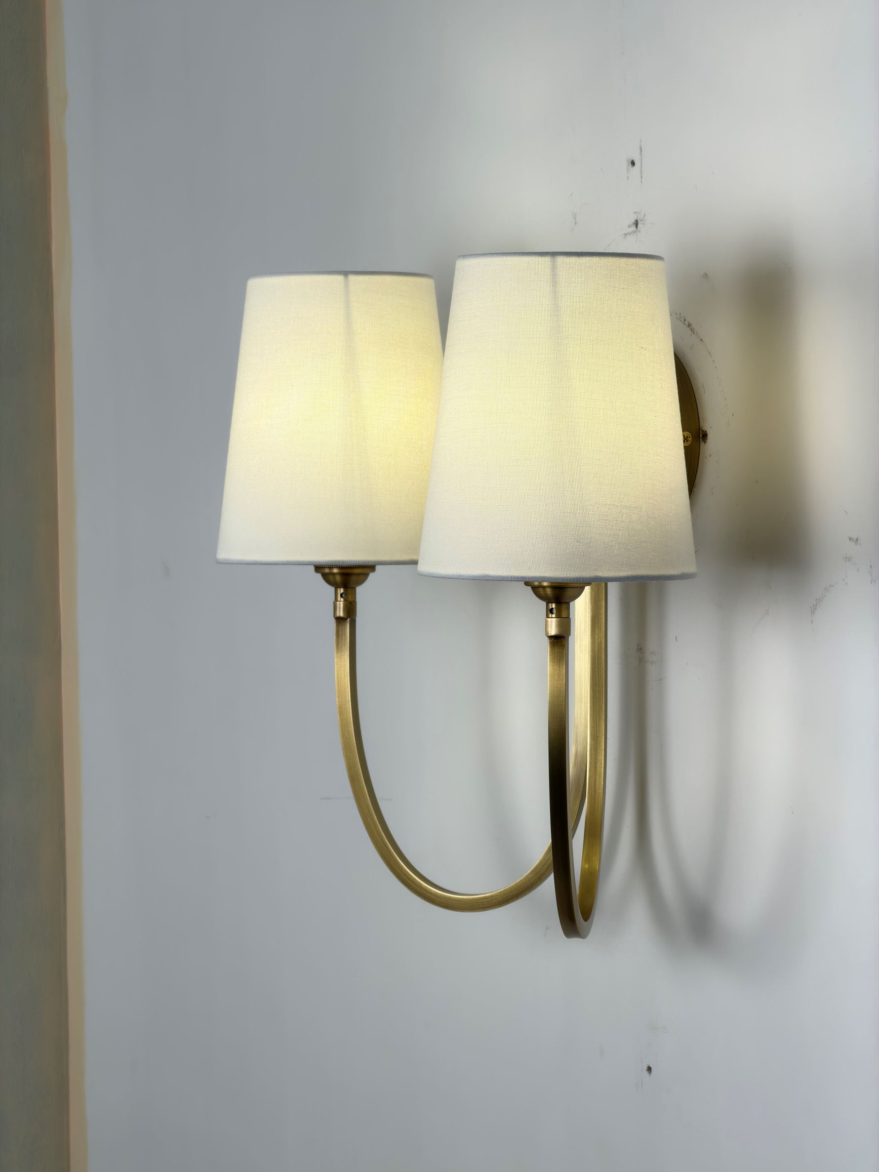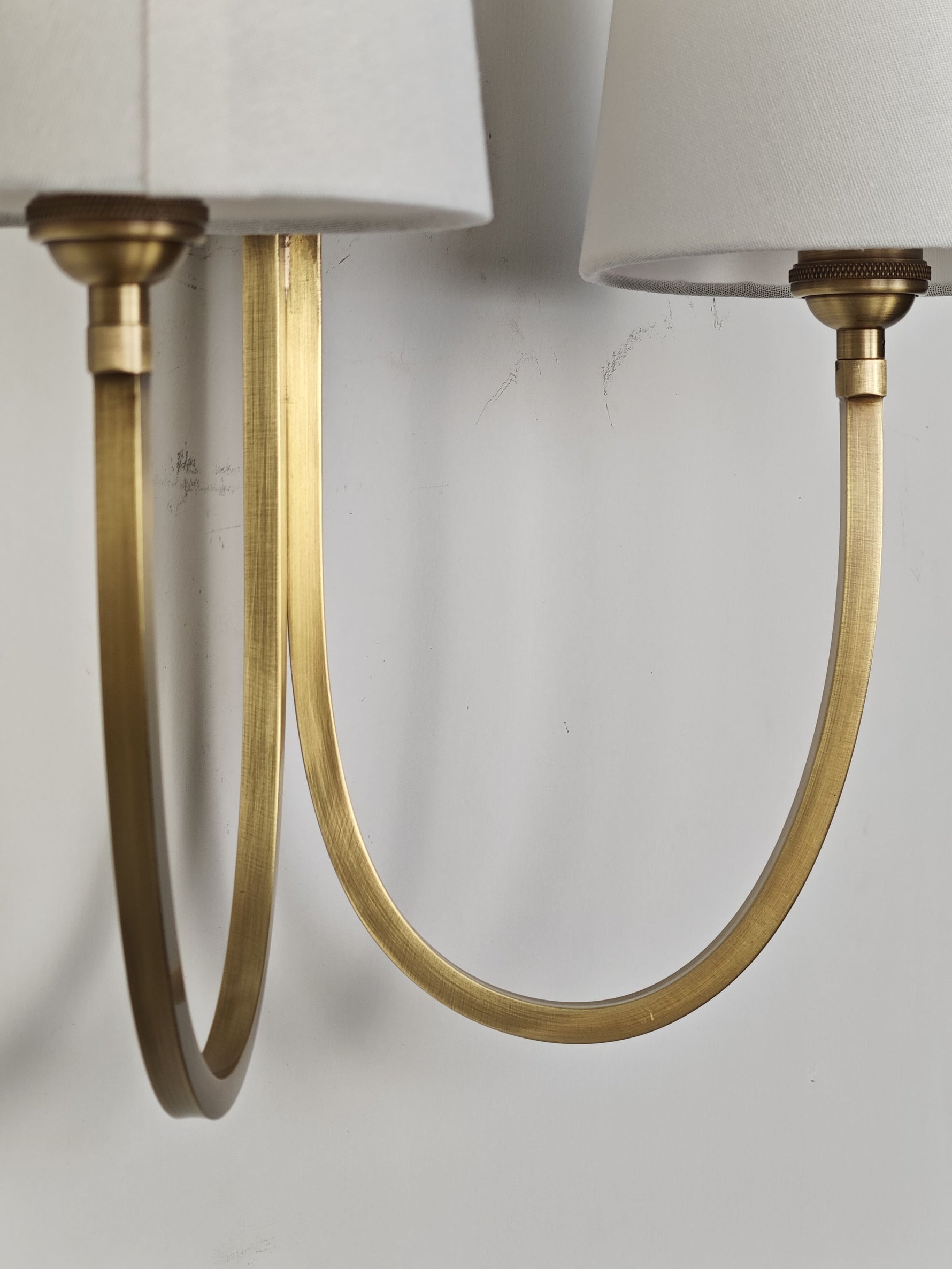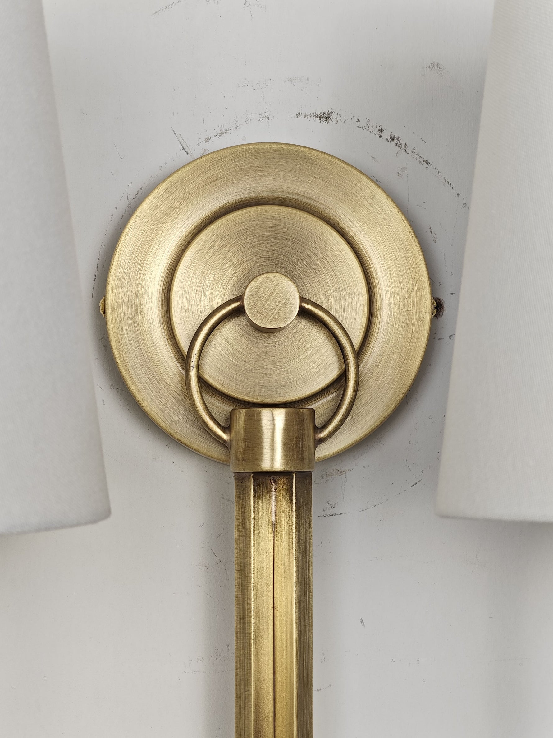 - The elegant brass arms are crowned with soft, neutral linen shades. These carefully selected shades work to gently diffuse light, eliminating harsh glares and casting a warm, inviting glow. Perfect for creating a tranquil and comfortable atmosphere where you can truly unwind after a long day.