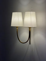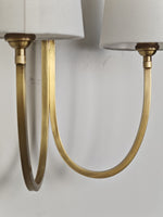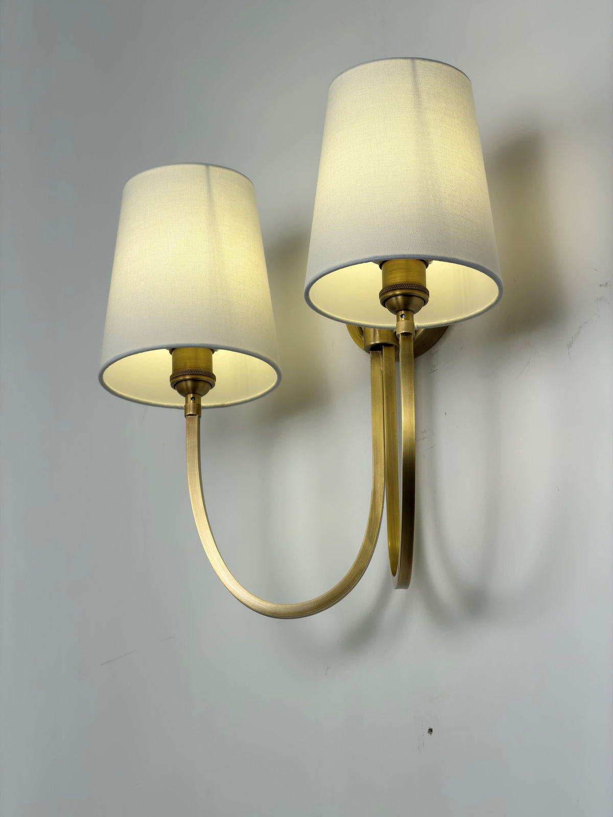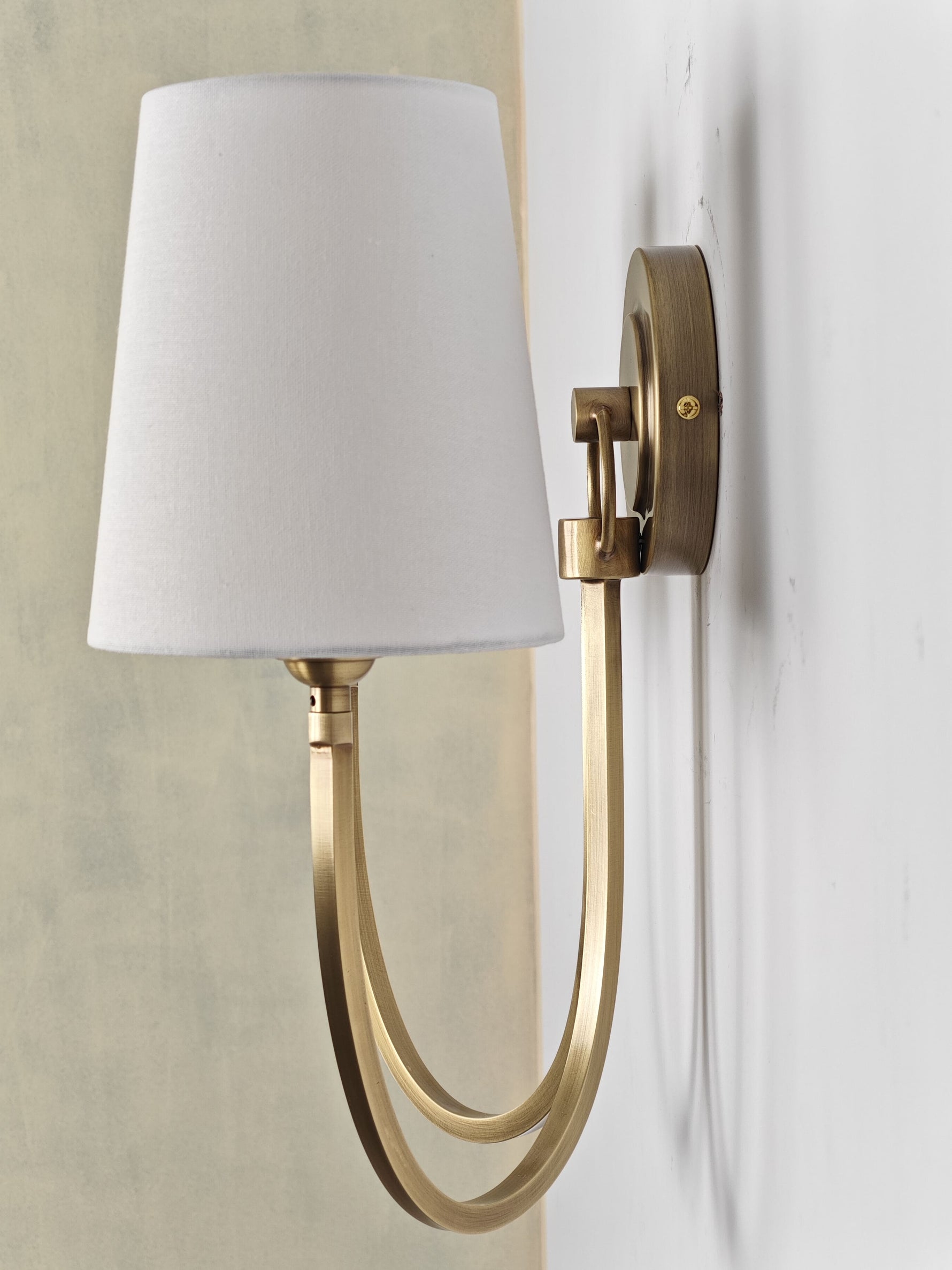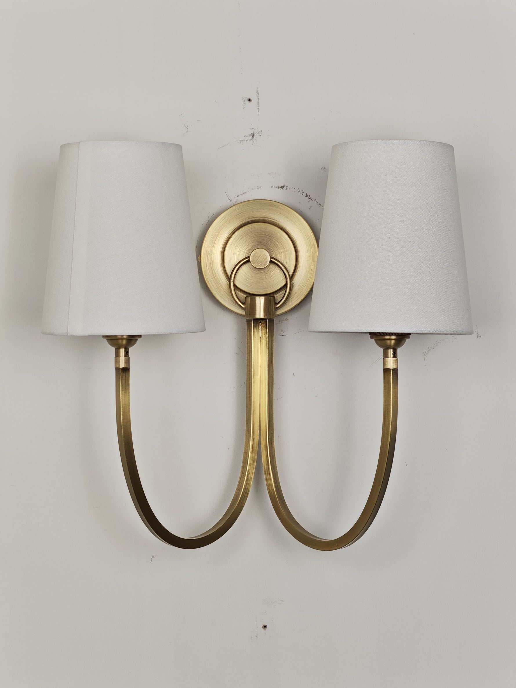 - The elegant brass arms are crowned with soft, neutral linen shades. These carefully selected shades work to gently diffuse light, eliminating harsh glares and casting a warm, inviting glow. Perfect for creating a tranquil and comfortable atmosphere where you can truly unwind after a long day.