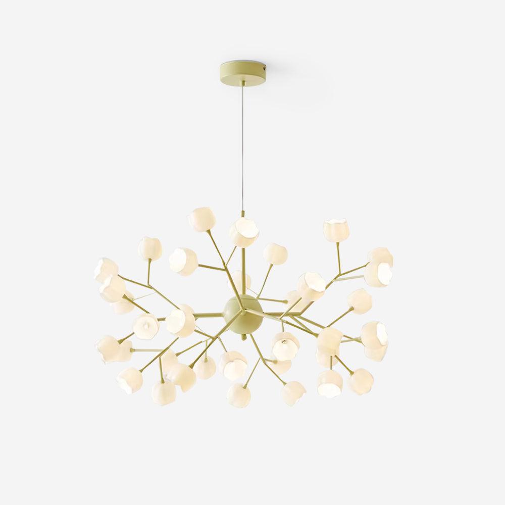 - Illuminate your space with the captivating beauty of the Royce Flower Chandelier, a stunning centerpiece that transforms any room into a whimsical oasis. This exquisite chandelier features a breathtaking array of mini flower lampshades, each delicately crafted to resemble blooming petals, creating a mesmerizing ambiance reminiscent of a cluster of fireflies shimmering in the night.
