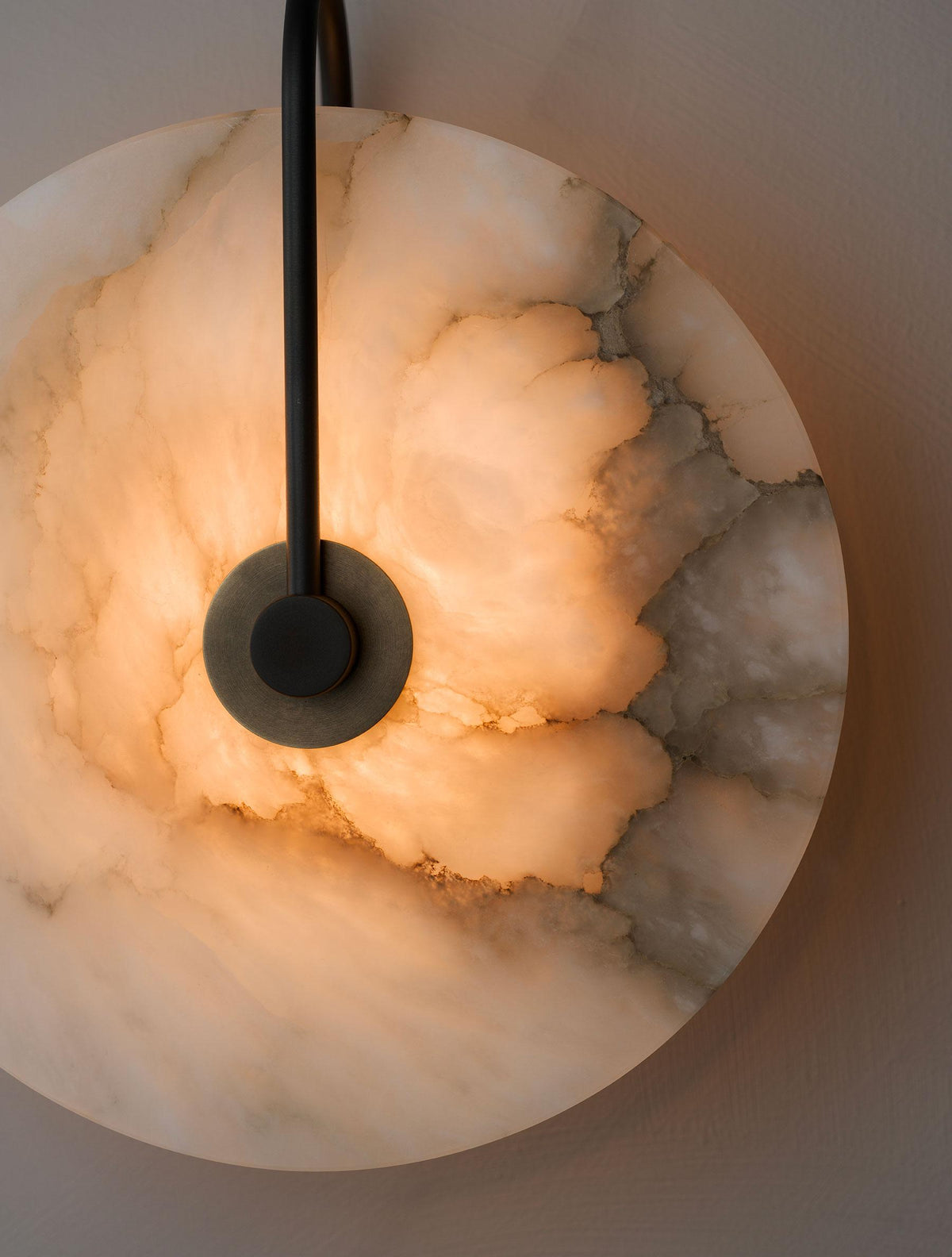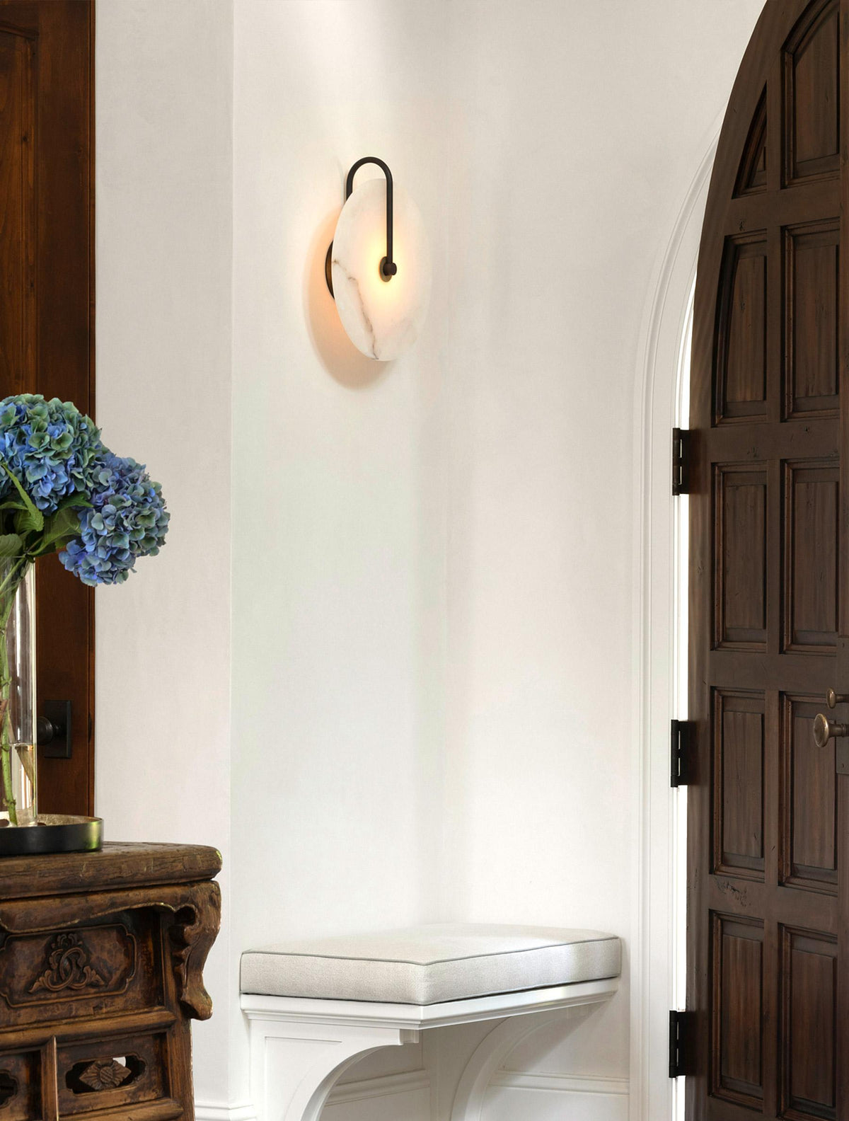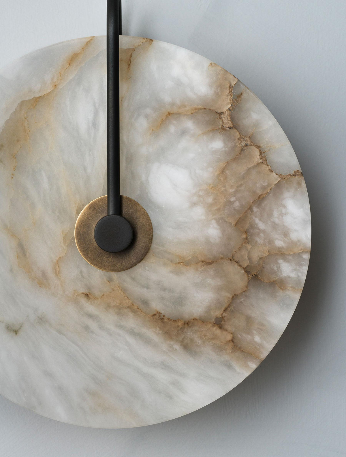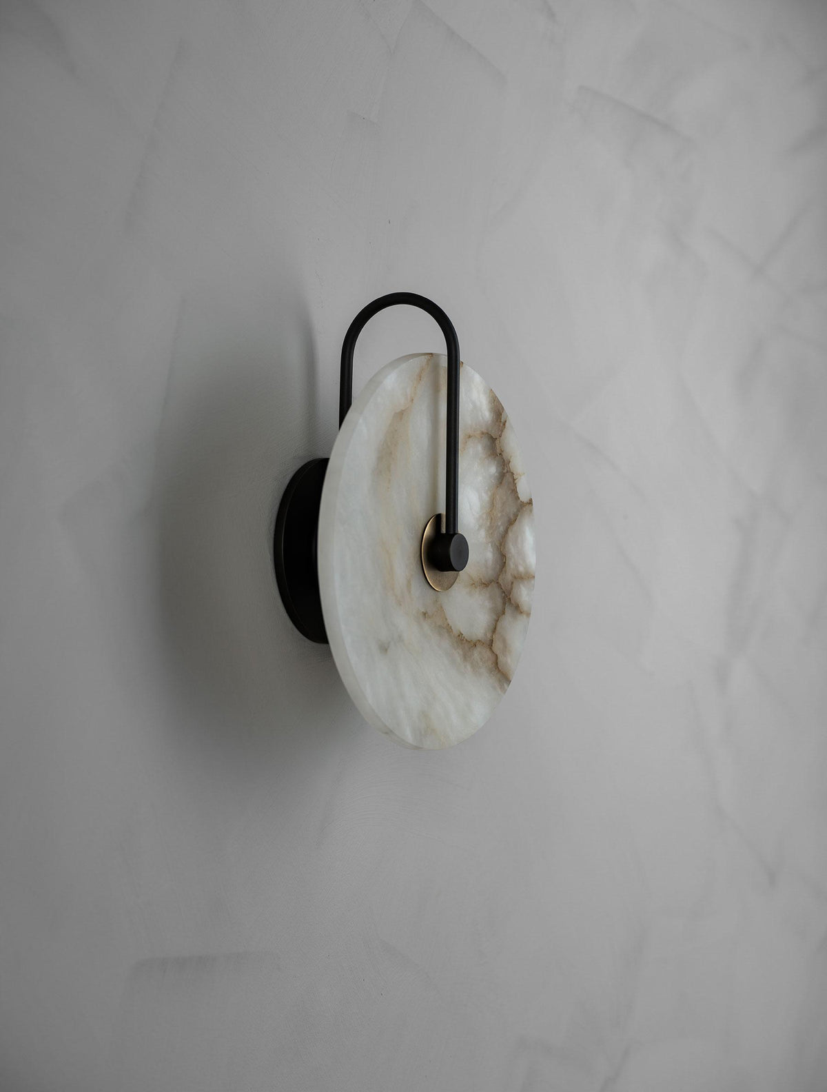 - Introducing the ADA Aperture Alabaster Wall Sconce, where timeless elegance meets minimalist sophistication. Crafted from exquisite alabaster, this sconce transforms any space with its simple yet striking design, instantly earning its place as a beloved favorite. The natural beauty of alabaster shines through, with each piece showcasing unique variations—some featuring richer iron oxide content and bold, deep veining for a dramatic effect, while others boast a purer, more translucent finish with subtle veining.