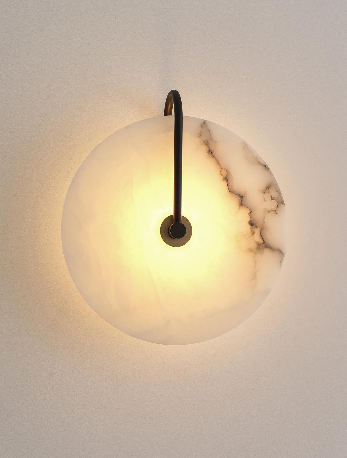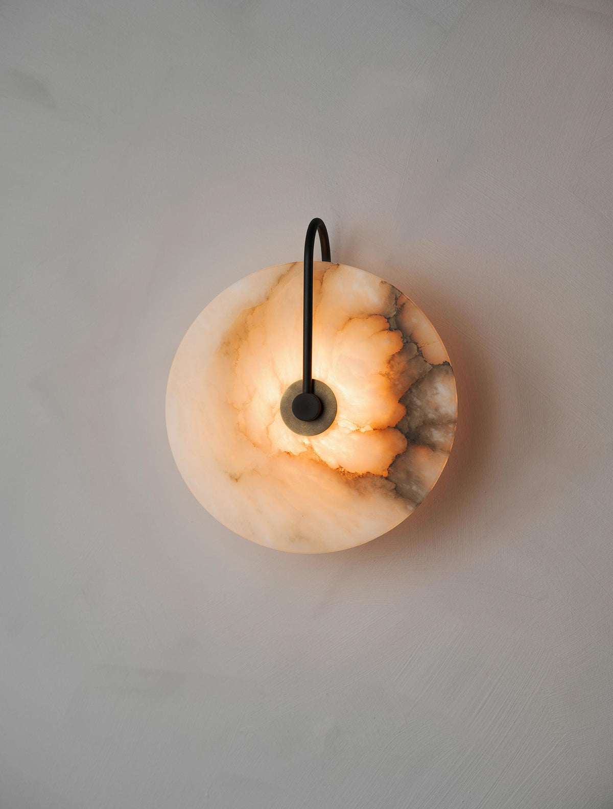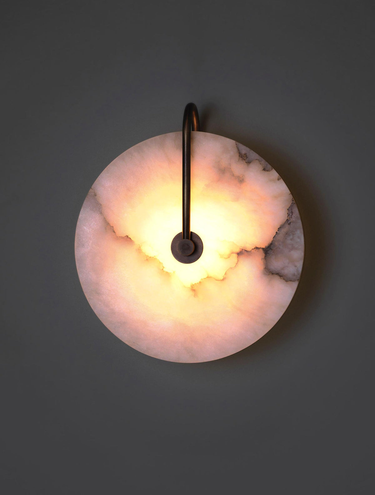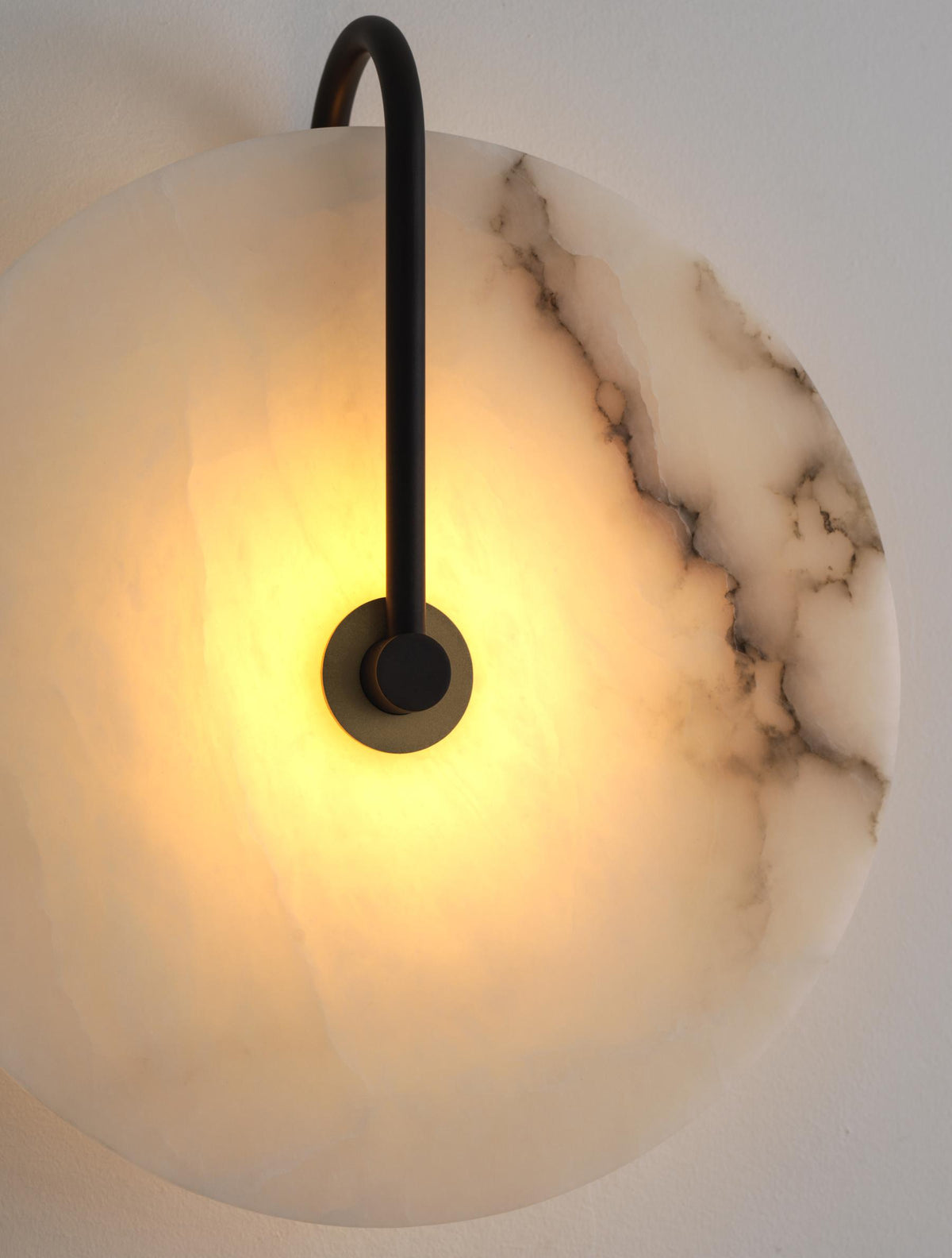- Introducing the ADA Aperture Alabaster Wall Sconce, where timeless elegance meets minimalist sophistication. Crafted from exquisite alabaster, this sconce transforms any space with its simple yet striking design, instantly earning its place as a beloved favorite. The natural beauty of alabaster shines through, with each piece showcasing unique variations—some featuring richer iron oxide content and bold, deep veining for a dramatic effect, while others boast a purer, more translucent finish with subtle veining.