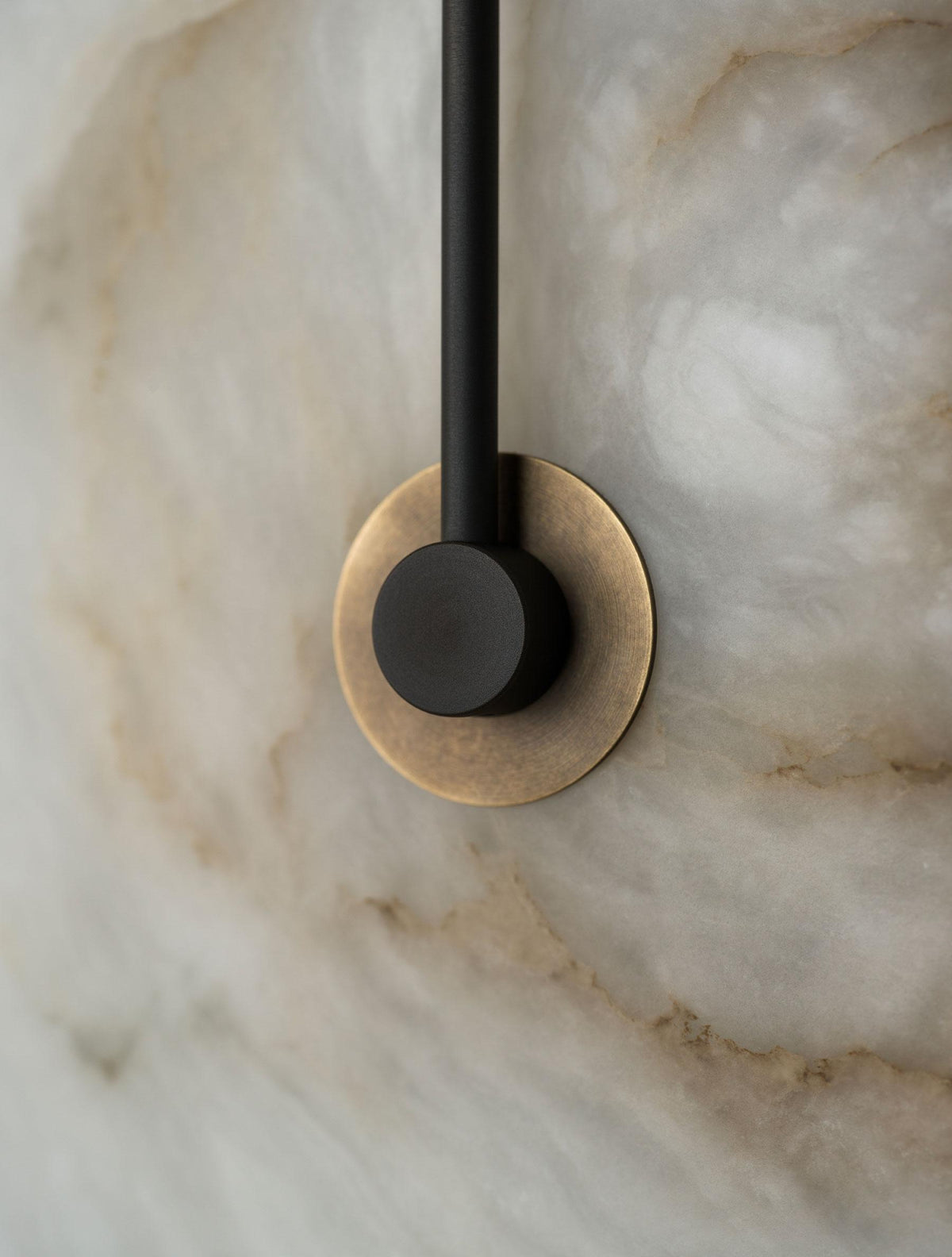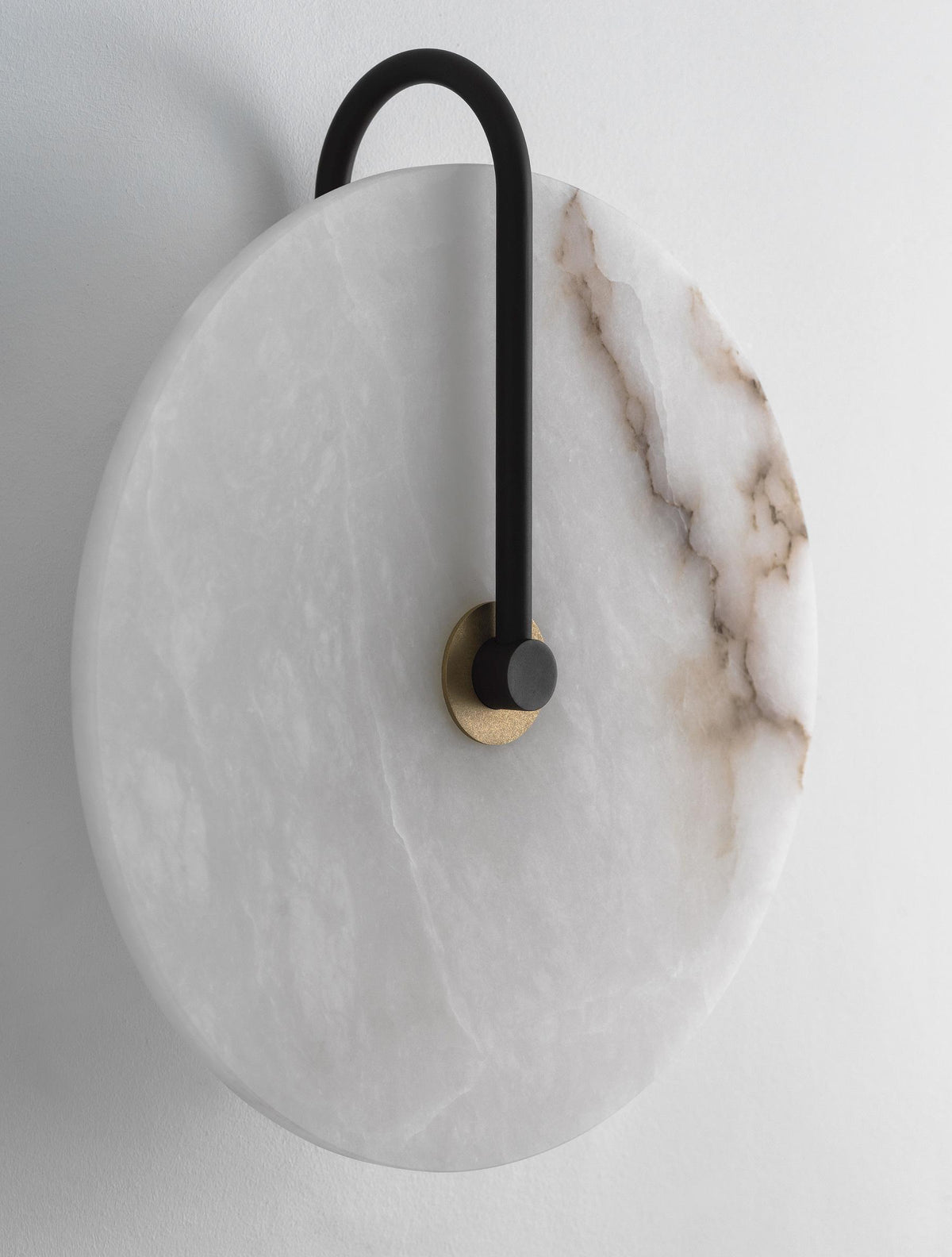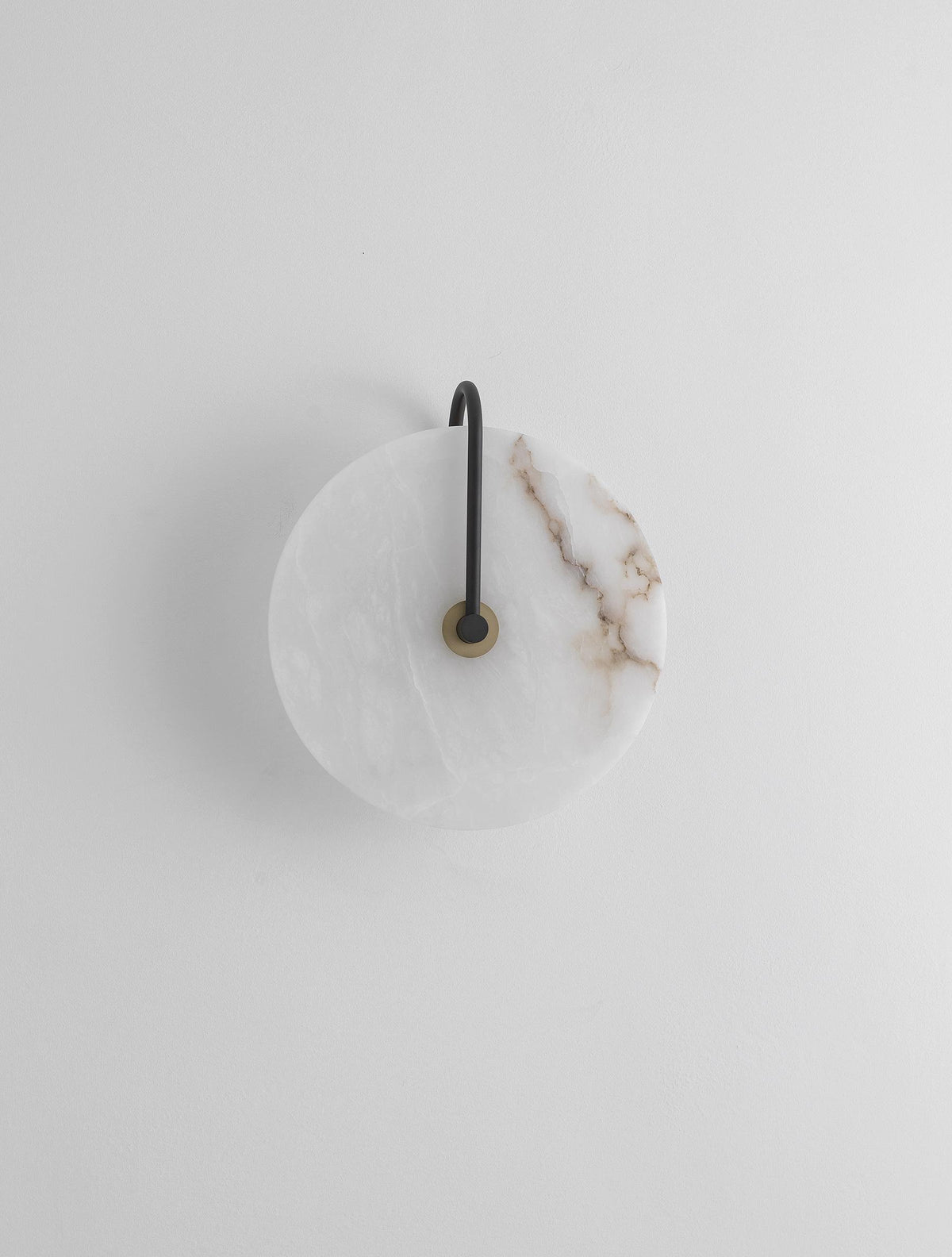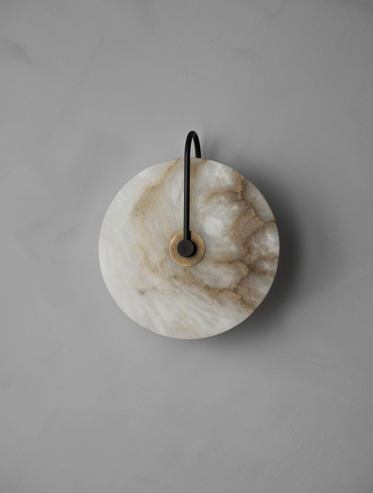 - Introducing the ADA Aperture Alabaster Wall Sconce, where timeless elegance meets minimalist sophistication. Crafted from exquisite alabaster, this sconce transforms any space with its simple yet striking design, instantly earning its place as a beloved favorite. The natural beauty of alabaster shines through, with each piece showcasing unique variations—some featuring richer iron oxide content and bold, deep veining for a dramatic effect, while others boast a purer, more translucent finish with subtle veining.