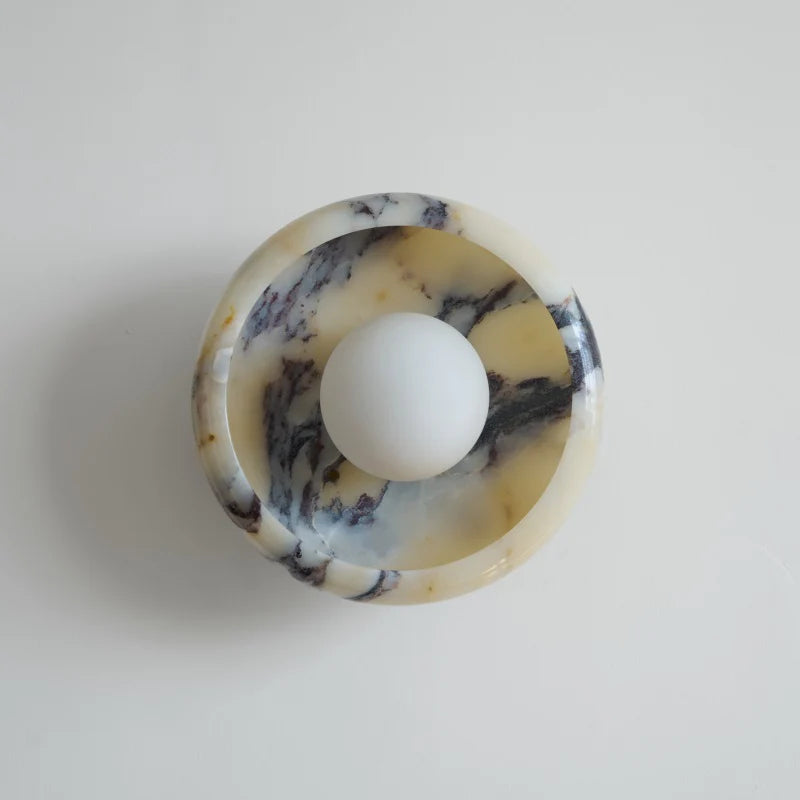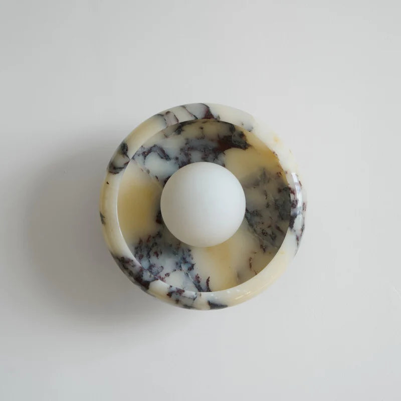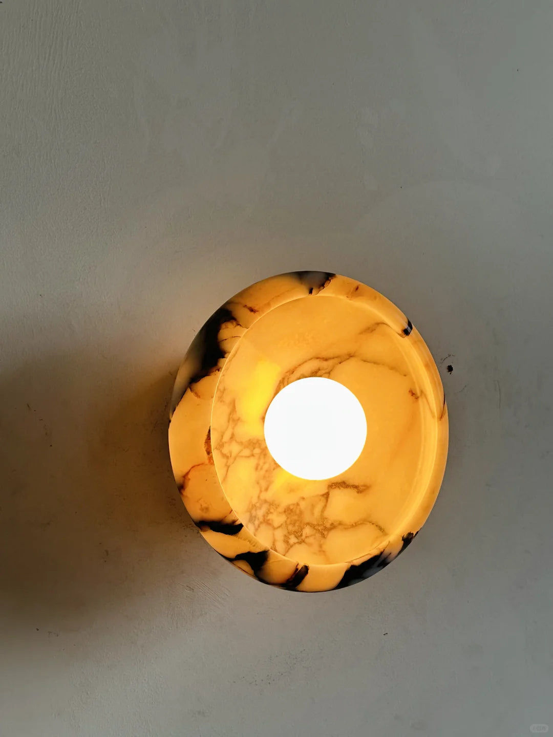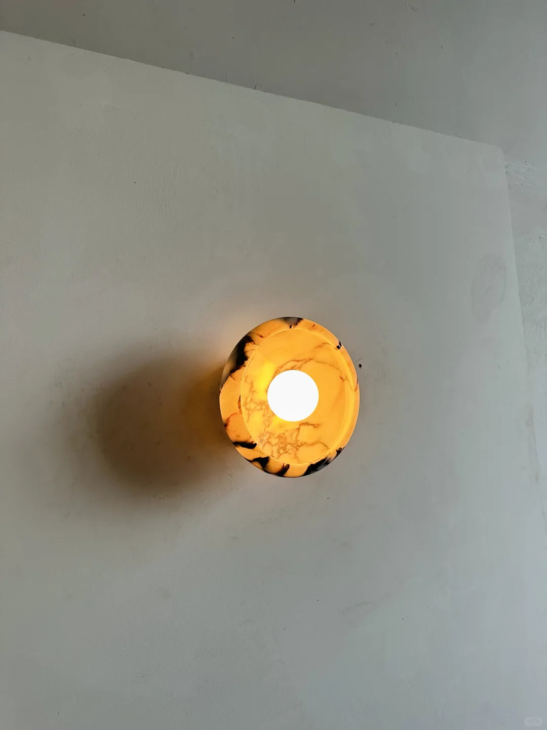 - When illuminated, the marble’s semi-translucent layers come alive, casting a warm, ethereal glow that enhances its luxurious silken sheen. Perfect for creating a focal point in entryways, living rooms, or bedrooms, this sconce transforms walls into canvases of understated opulence.