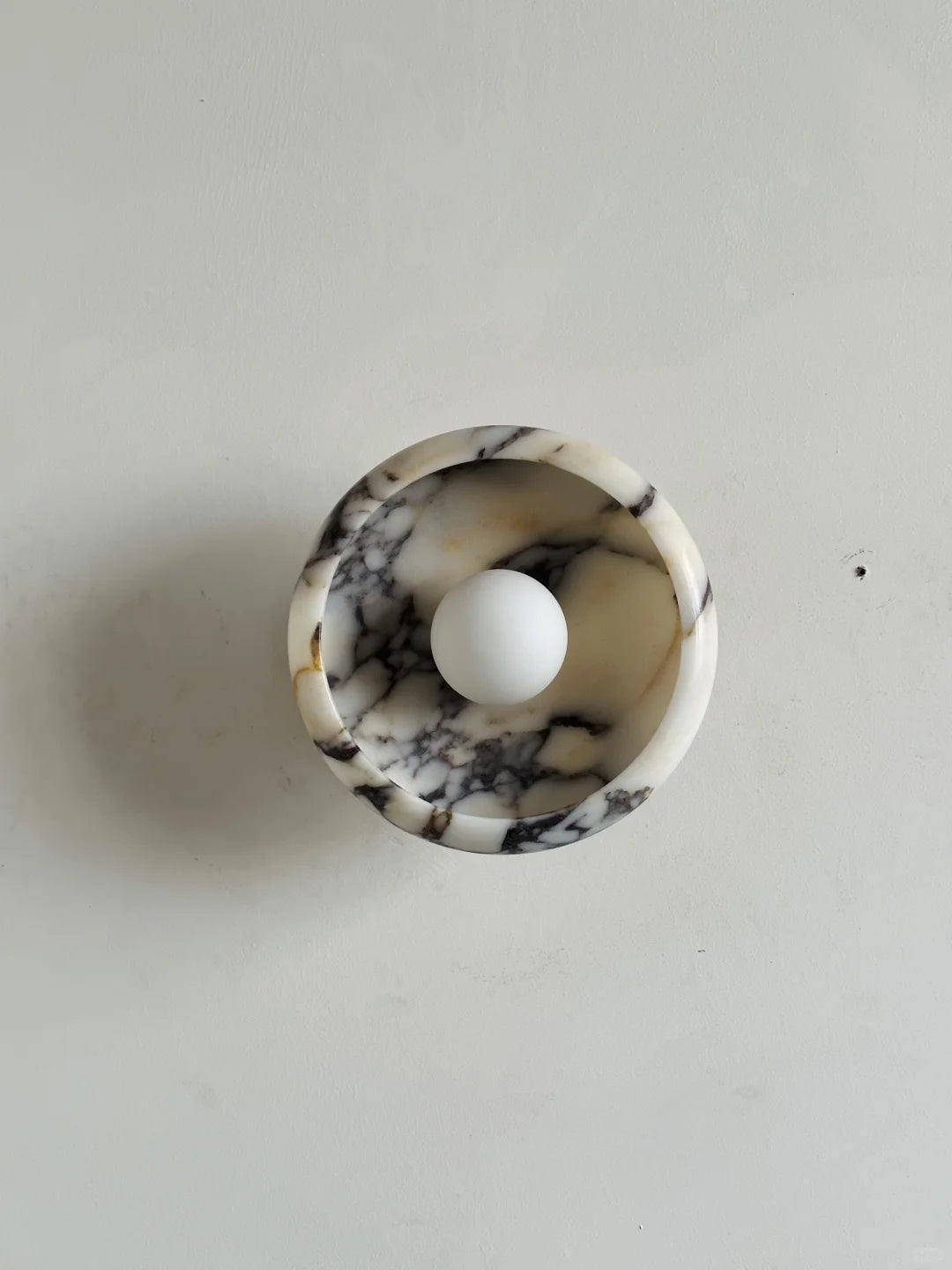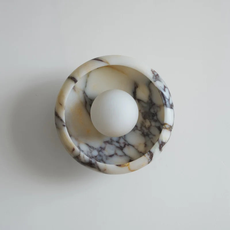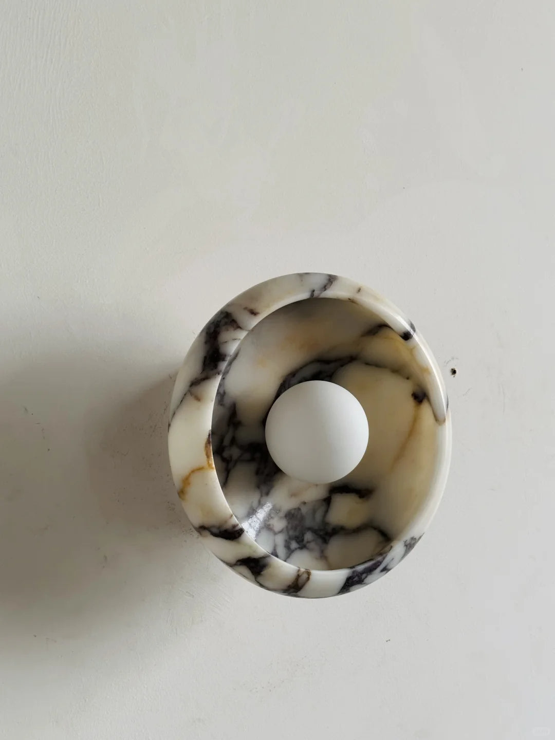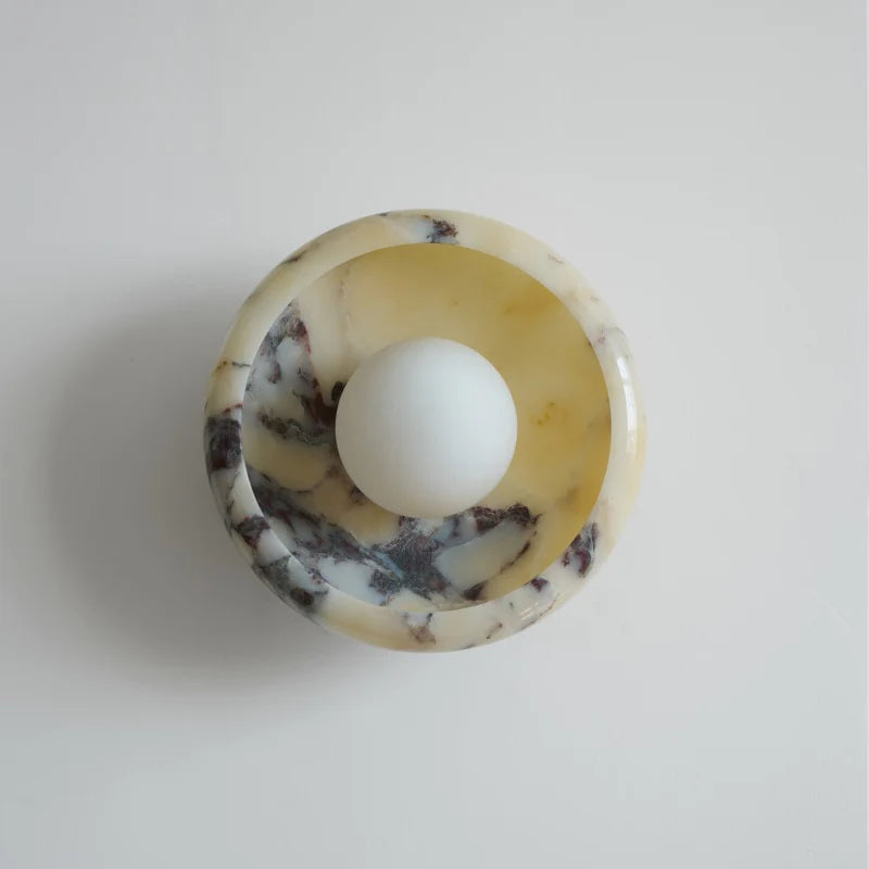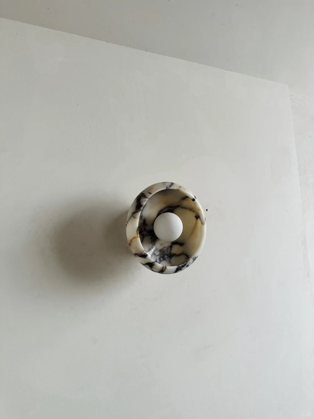 - When illuminated, the marble’s semi-translucent layers come alive, casting a warm, ethereal glow that enhances its luxurious silken sheen. Perfect for creating a focal point in entryways, living rooms, or bedrooms, this sconce transforms walls into canvases of understated opulence.