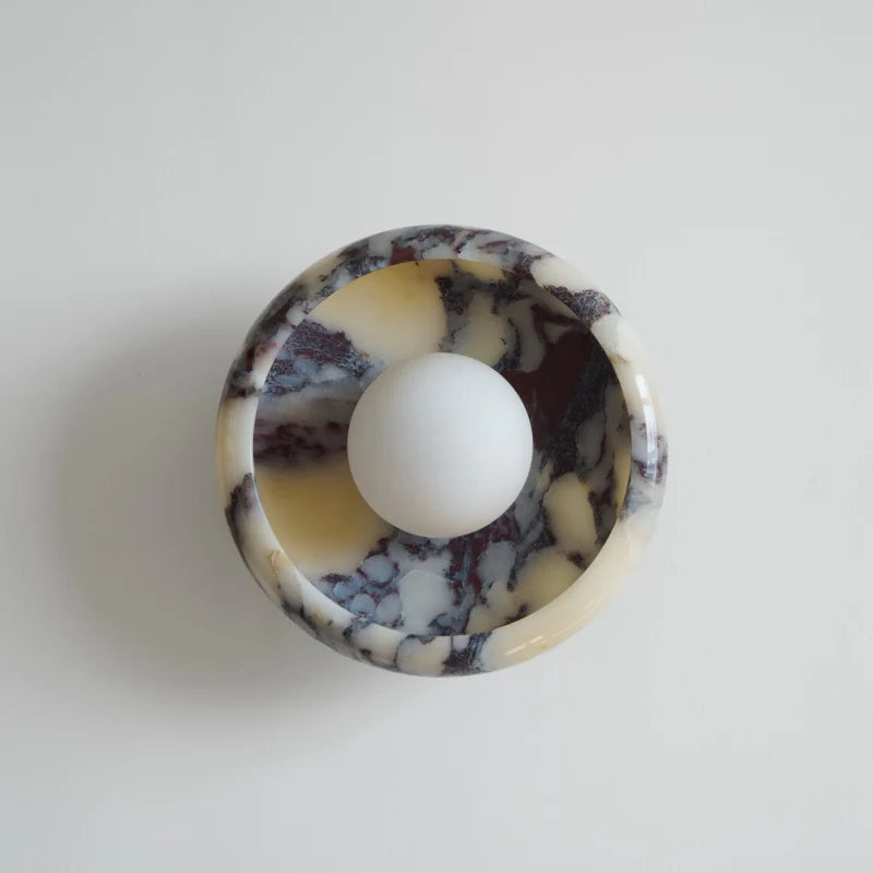 - Celebrate the mesmerizing beauty of Afyon Violet Marble with this exquisite sconce, a harmonious blend of natural elegance and refined craftsmanship. Mined exclusively from the quarries of Afyon, Turkey, each piece showcases a soft lilac-gray base adorned with delicate white and gold veining—no two are alike, ensuring your space tells a one-of-a-kind story.