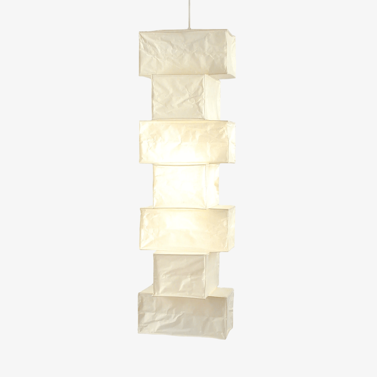 - Elevate your space with the iconic Akari 30P Pendant Light, a masterpiece by renowned designer Isamu Noguchi. This stunning pendant features a unique composition of rectangular blocks stacked elegantly on top of each other, creating a striking sense of layering and depth. Crafted from hand-made washi paper and bamboo ribbing, the lamp emits a soft, diffused glow that enhances any room with warmth and sophistication.