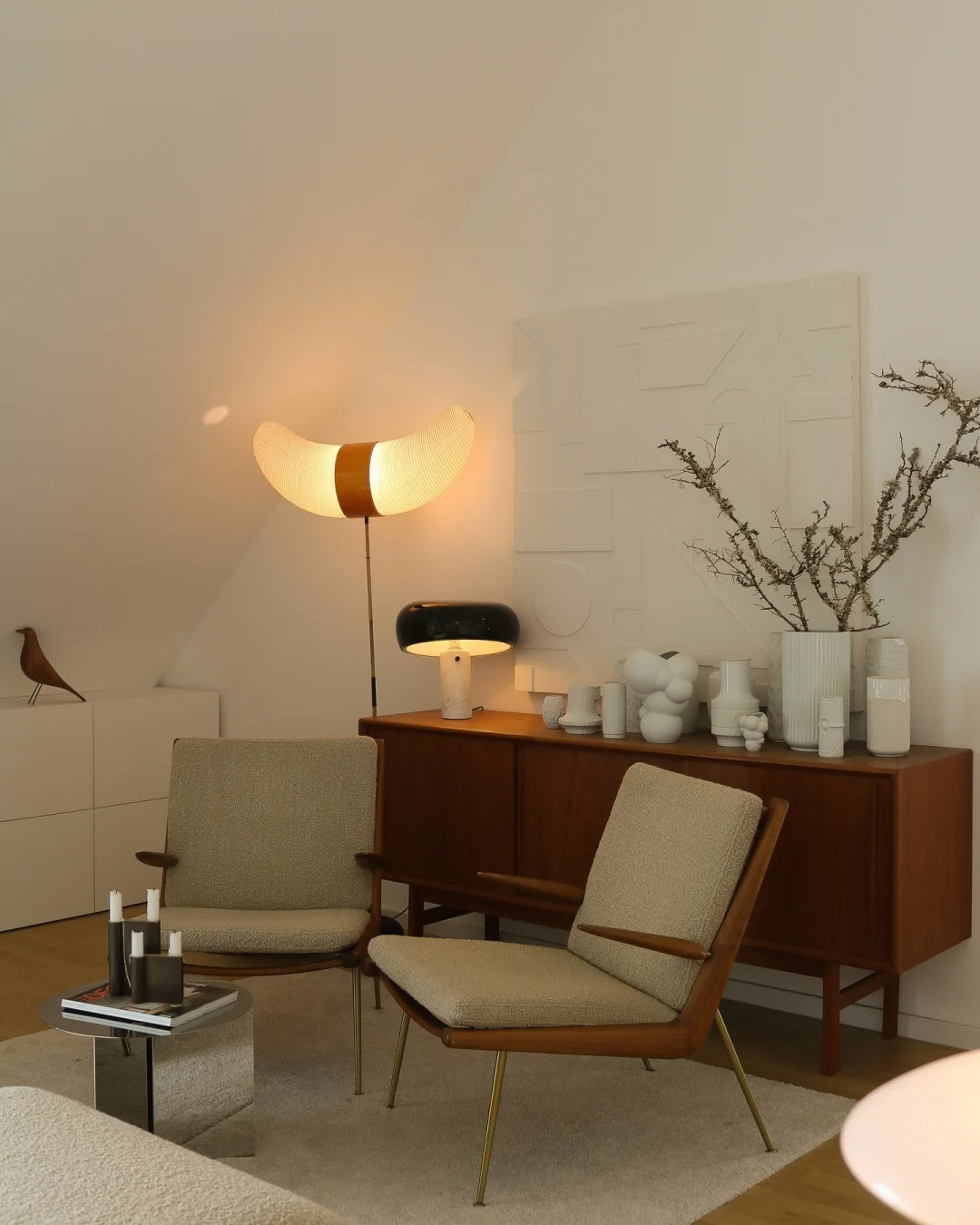 - Crafted from hand-assembled washi paper and bamboo ribs, the soft, diffused glow creates a warm and inviting ambiance—perfect for living rooms, studios, or any space that calls for organic elegance. The lightweight yet durable structure balances modern minimalism with sculptural artistry.