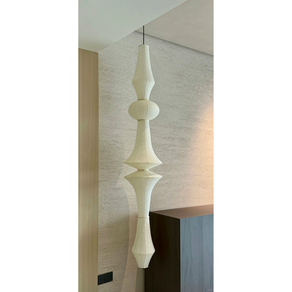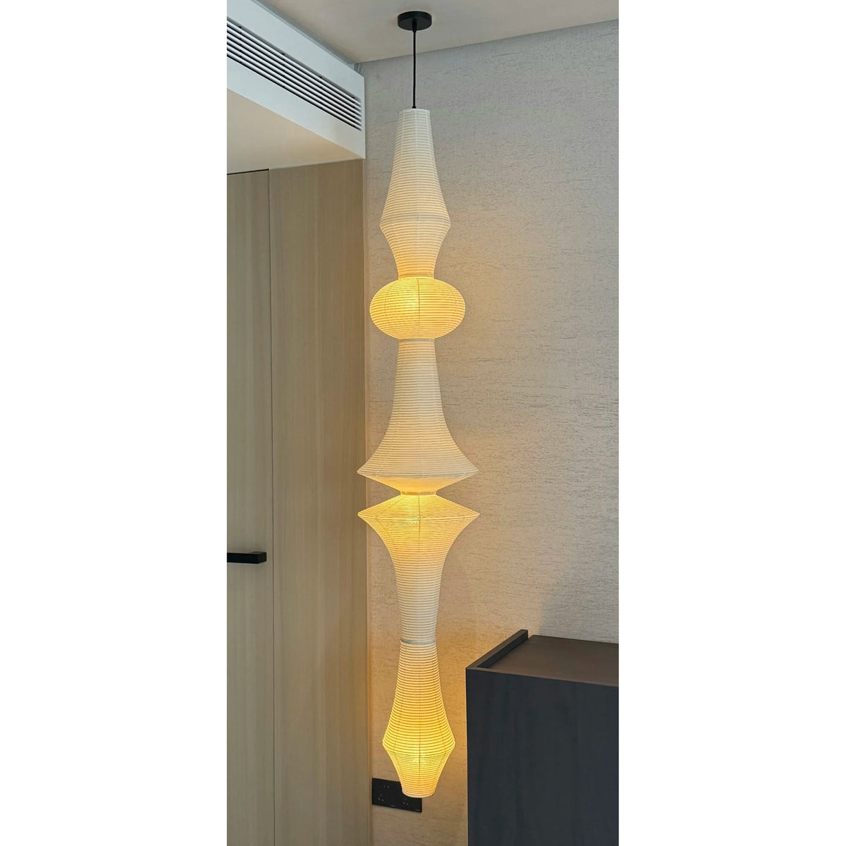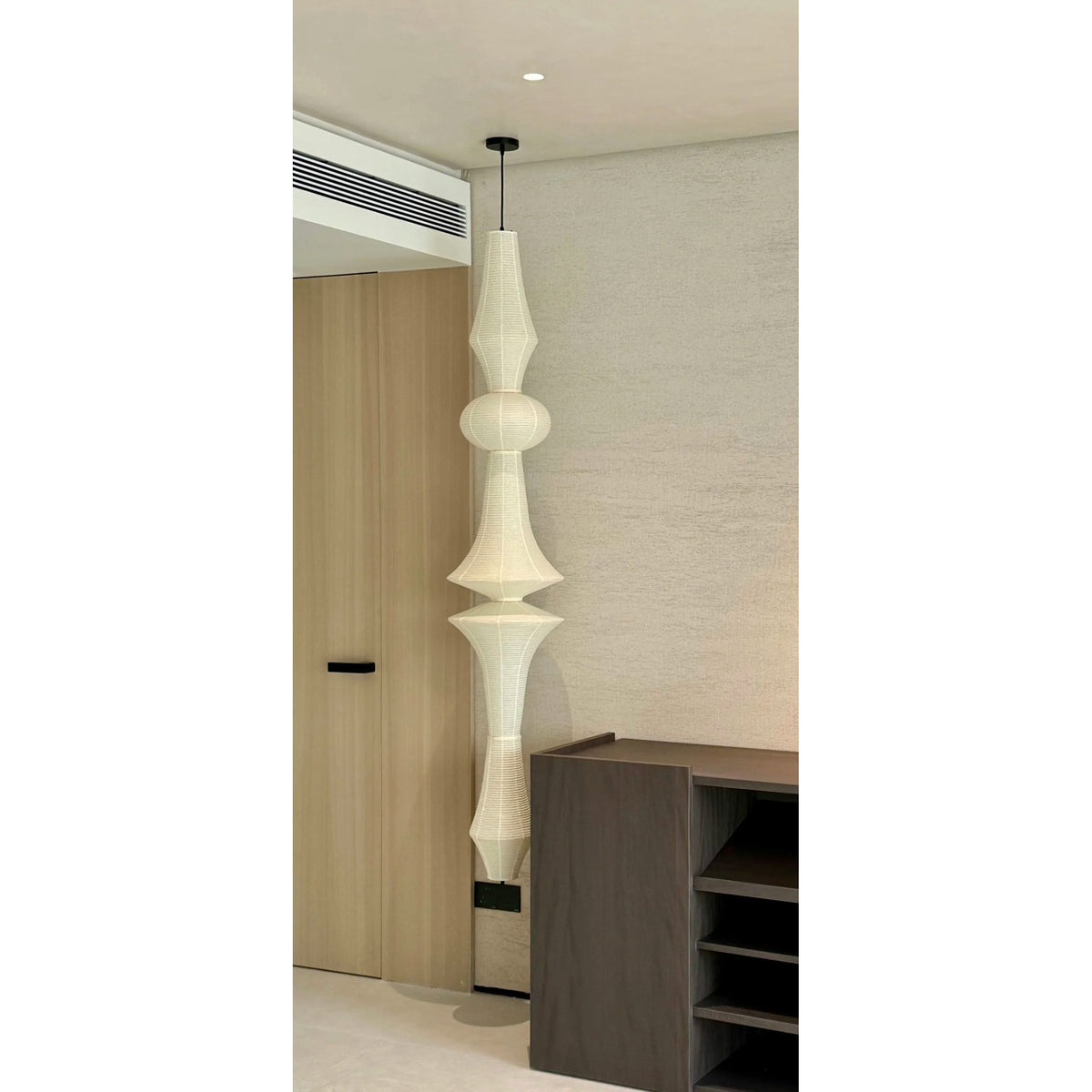 - Elevate your space with the iconic Akari E Pendant Light, designed by the legendary Isamu Noguchi. As the tallest model in the Akari Light Sculpture collection, this stunning pendant effortlessly illuminates grand interiors with its long suspension, making it perfect for soaring ceilings, lobbies, and statement-making spaces.