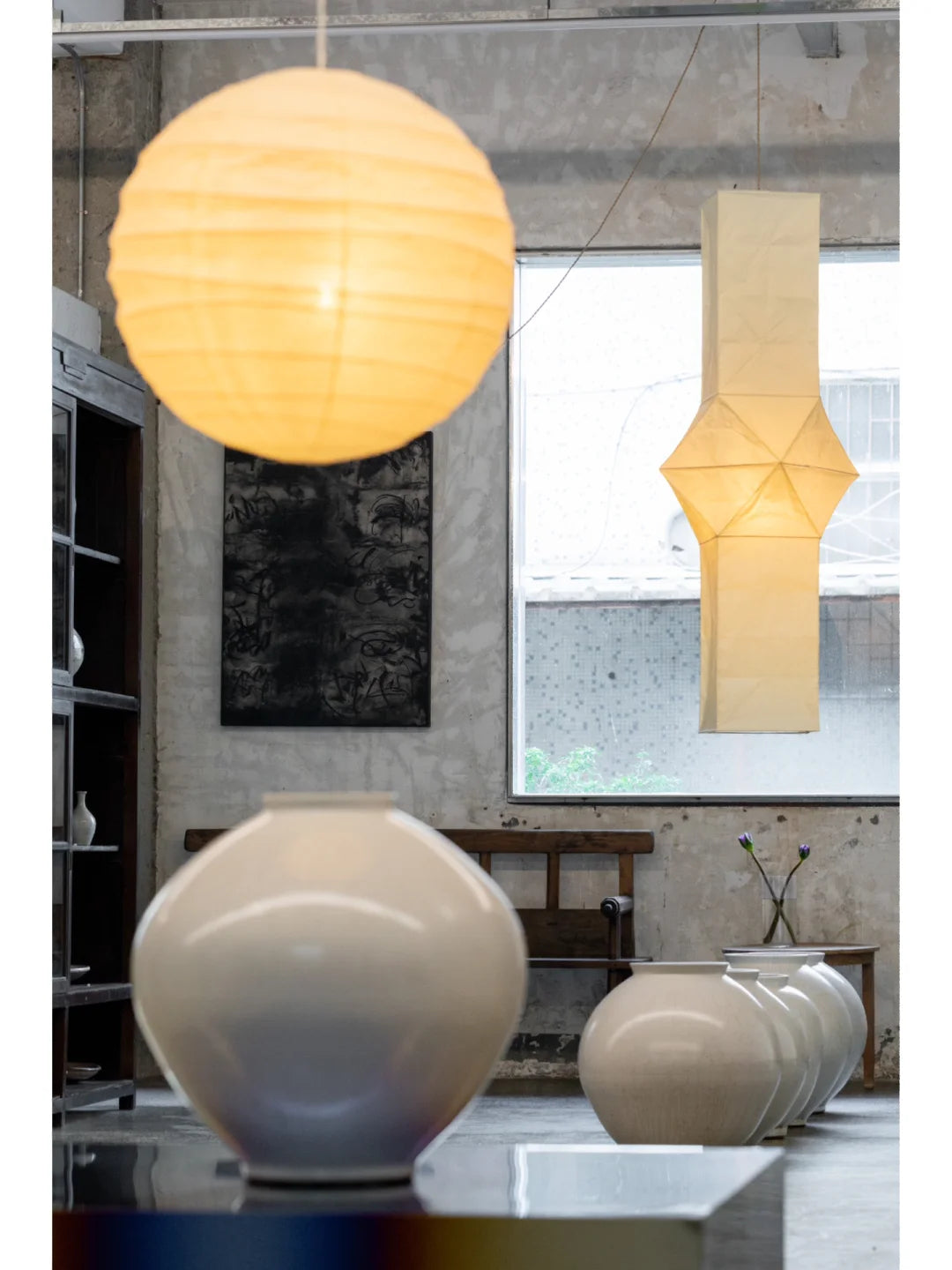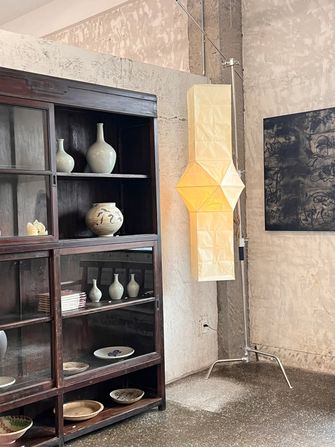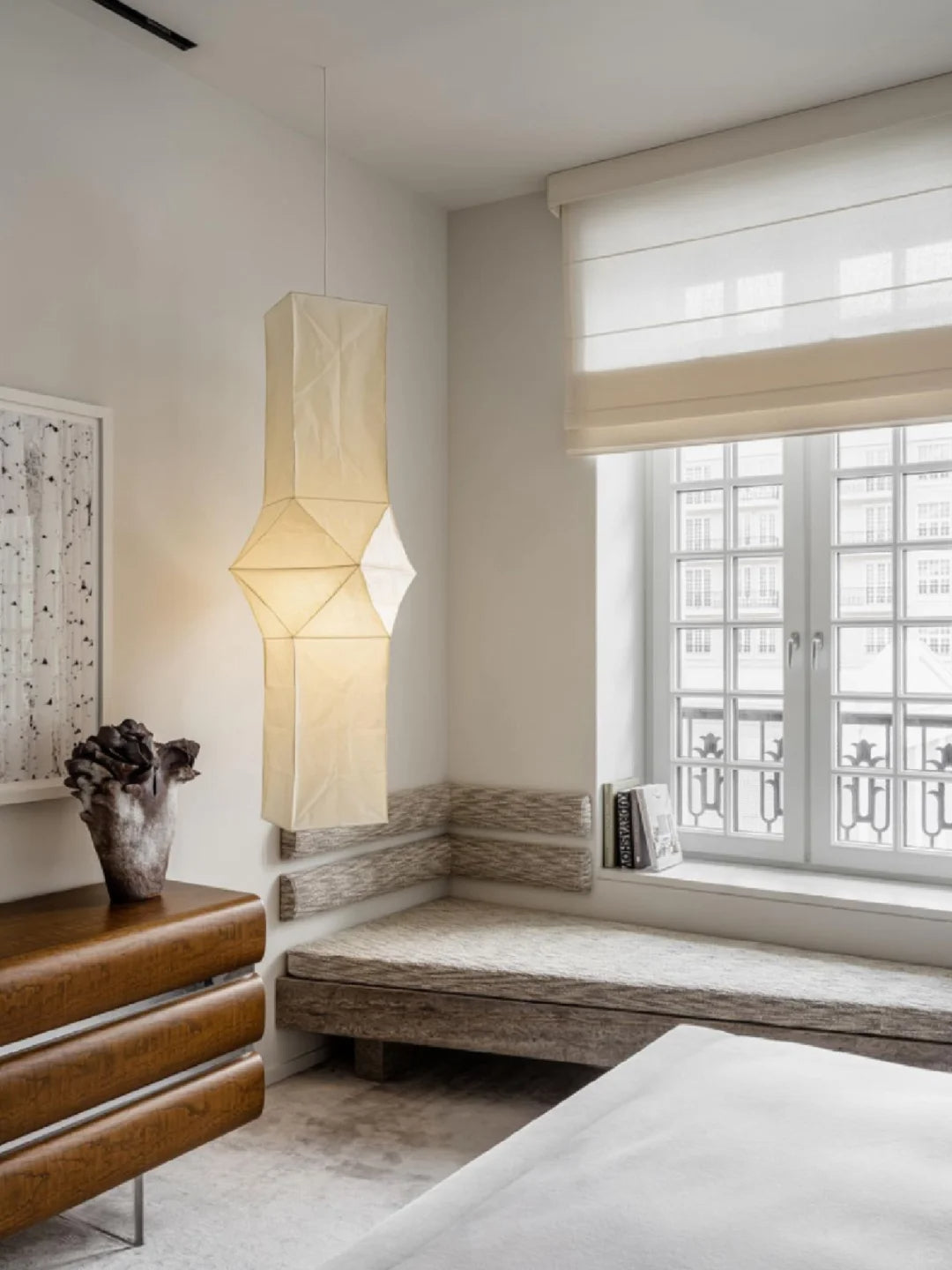 Handcrafted from traditional washi paper and bamboo ribbing, the Akari L5 casts a soft, diffused glow, creating a warm and inviting atmosphere. Its angular structure plays with light and shadow, adding dynamic visual interest to any room.