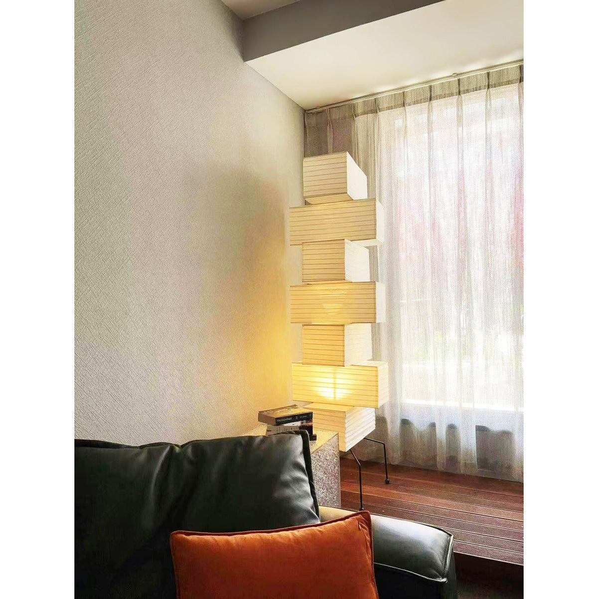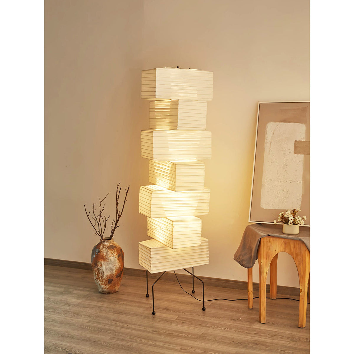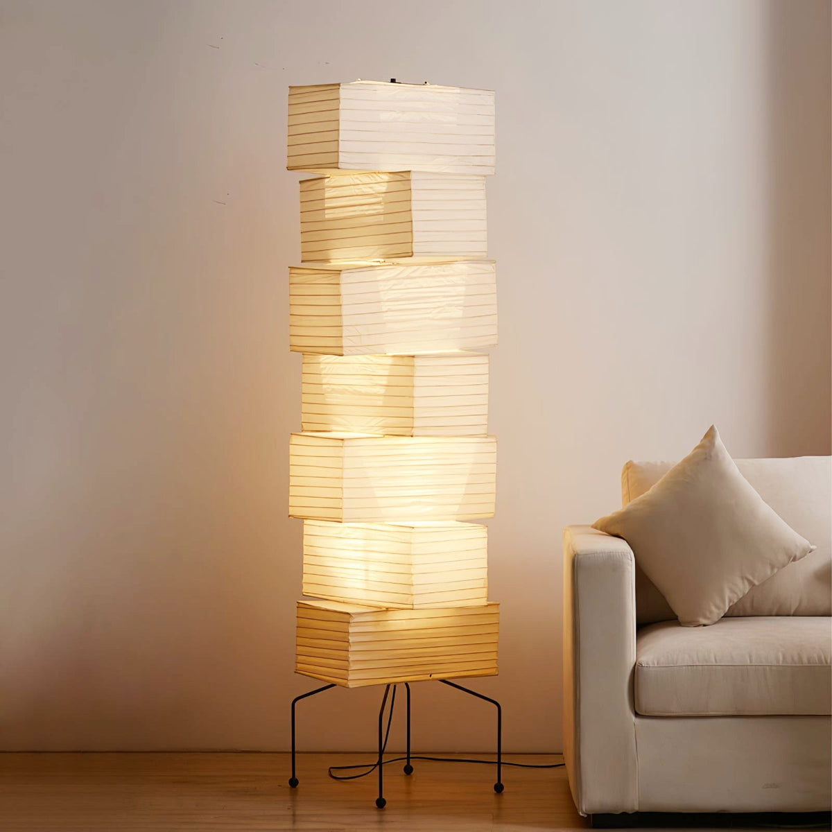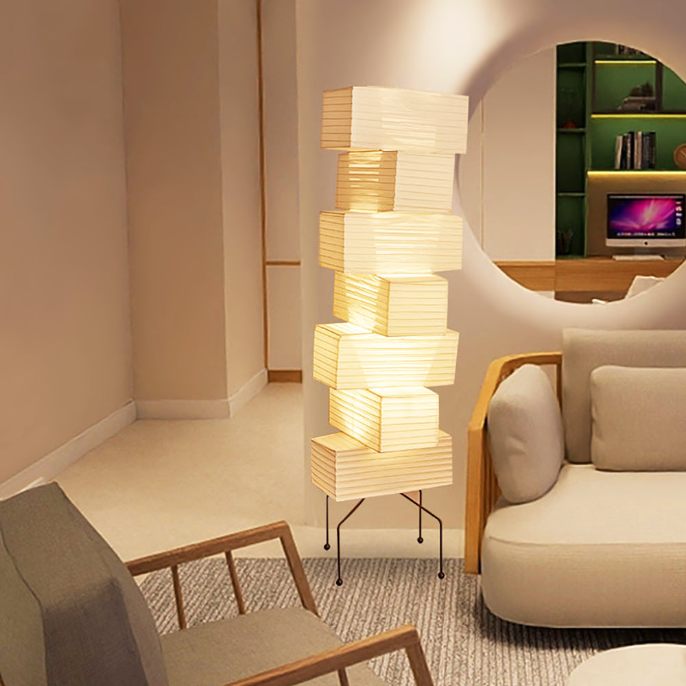 - The Akari UF4-L10 Floor Lamp is a stunning example of modern Japanese design. Crafted with meticulous attention to detail, this lamp features a series of stacked square forms that create a captivating layered look. The interplay of light and shadow through the delicate washi paper creates a warm and inviting ambiance in any space.