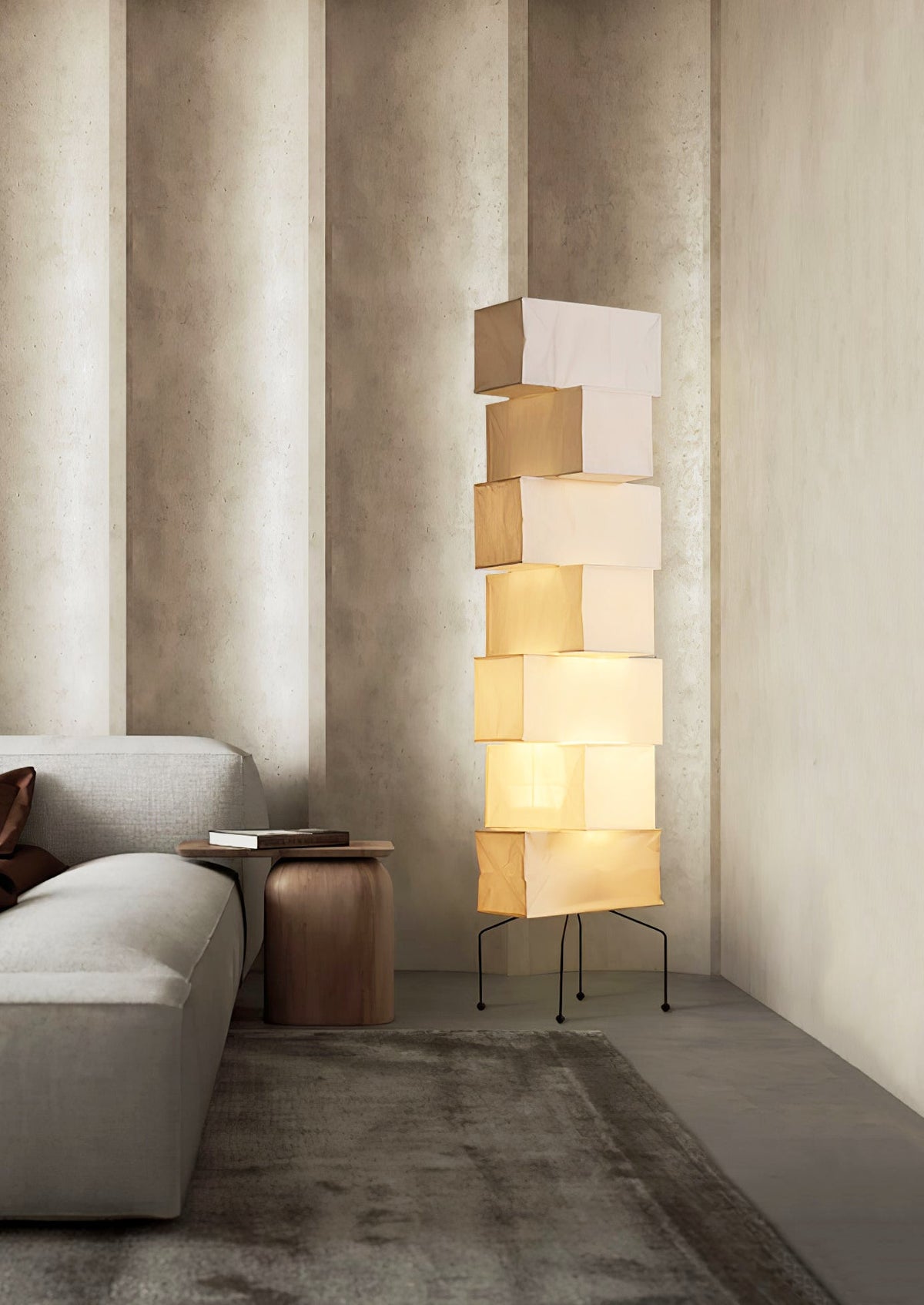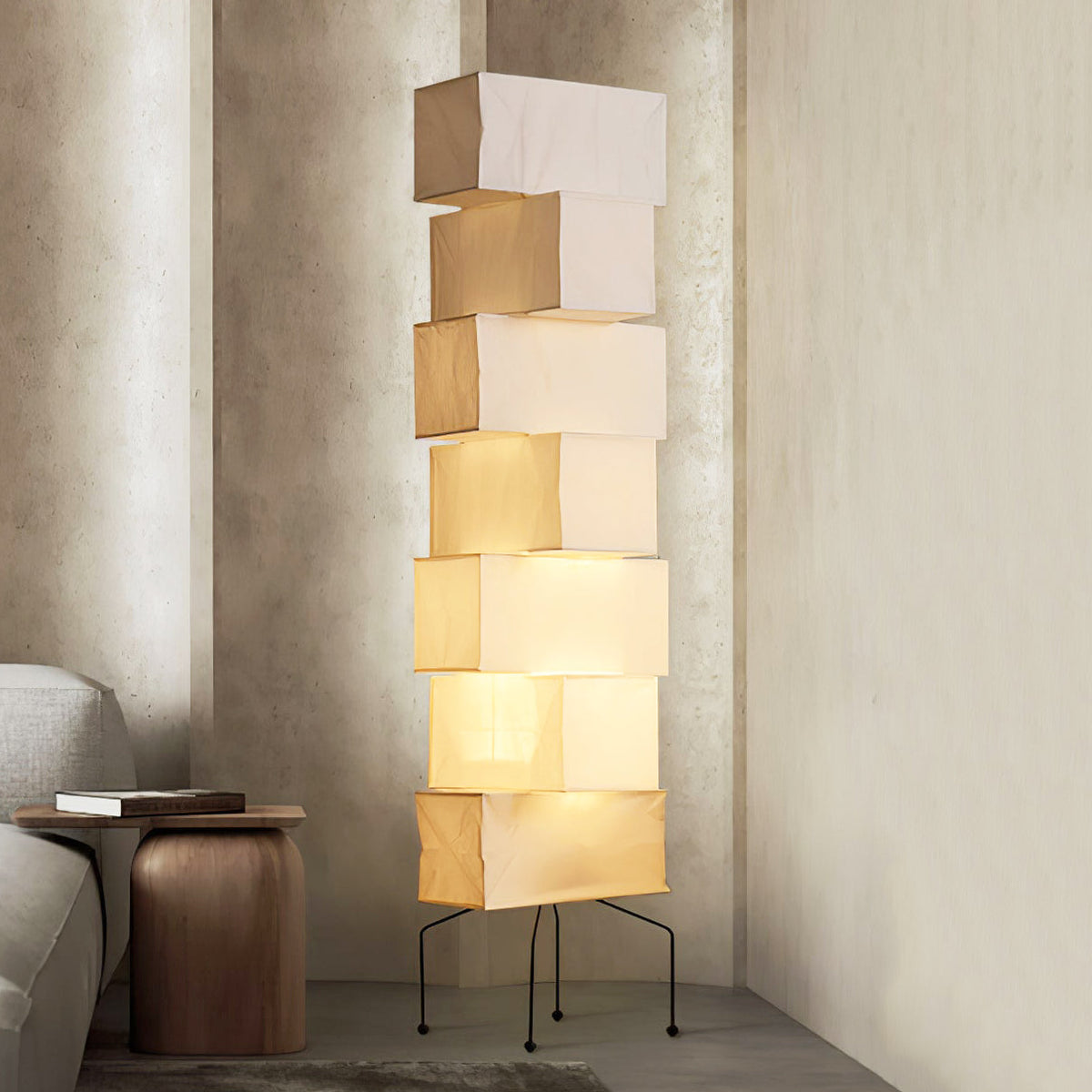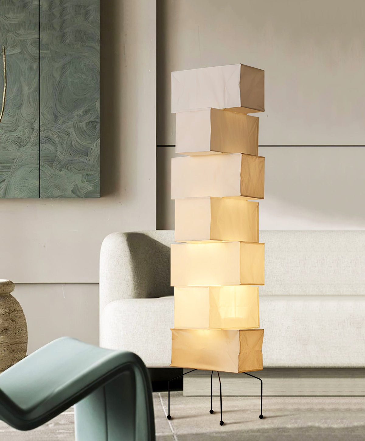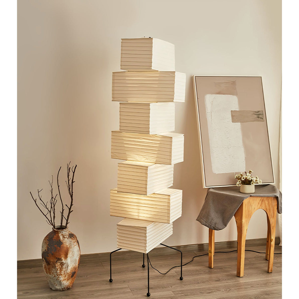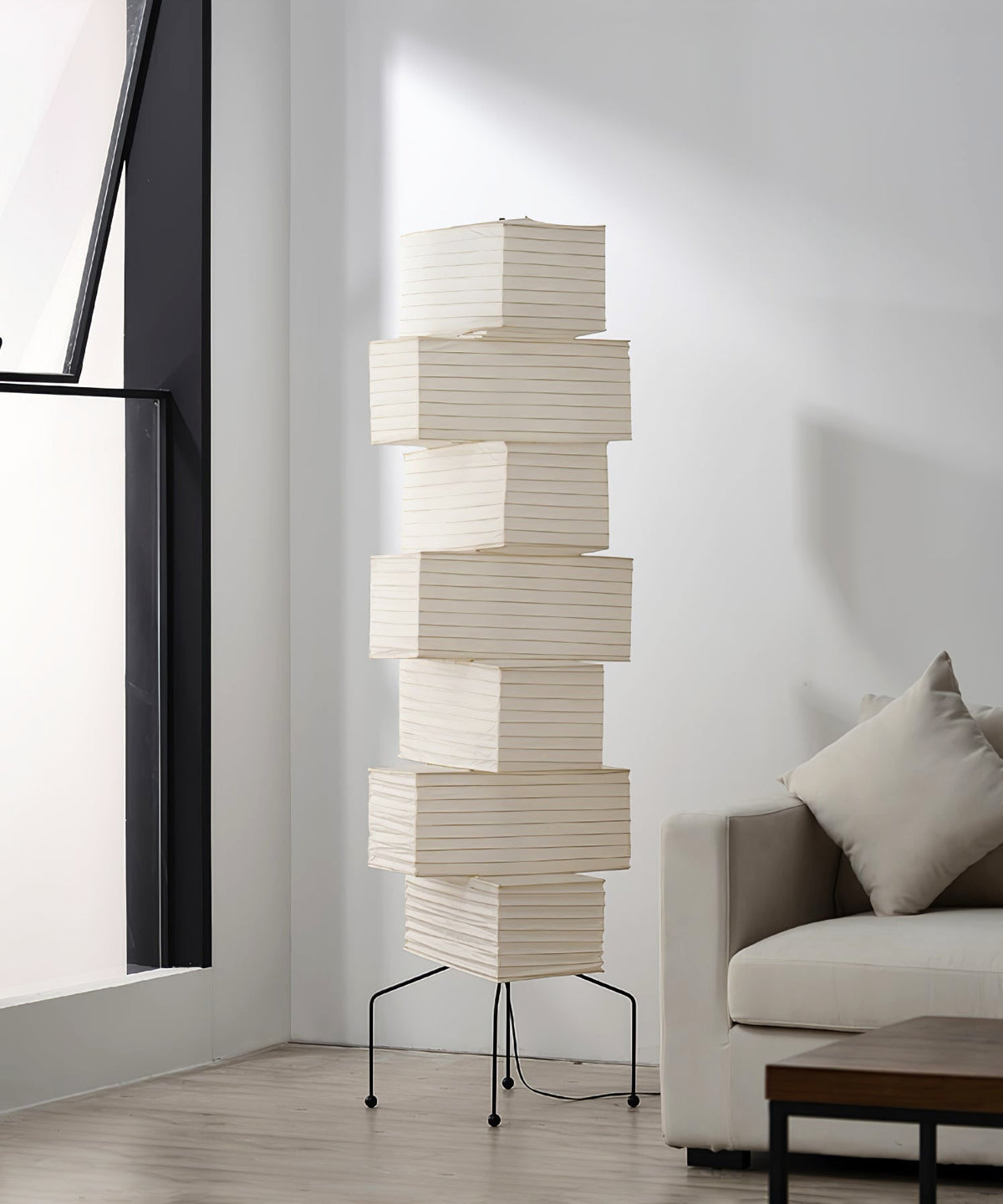 - The Akari UF4-L10 Floor Lamp is a stunning example of modern Japanese design. Crafted with meticulous attention to detail, this lamp features a series of stacked square forms that create a captivating layered look. The interplay of light and shadow through the delicate washi paper creates a warm and inviting ambiance in any space.