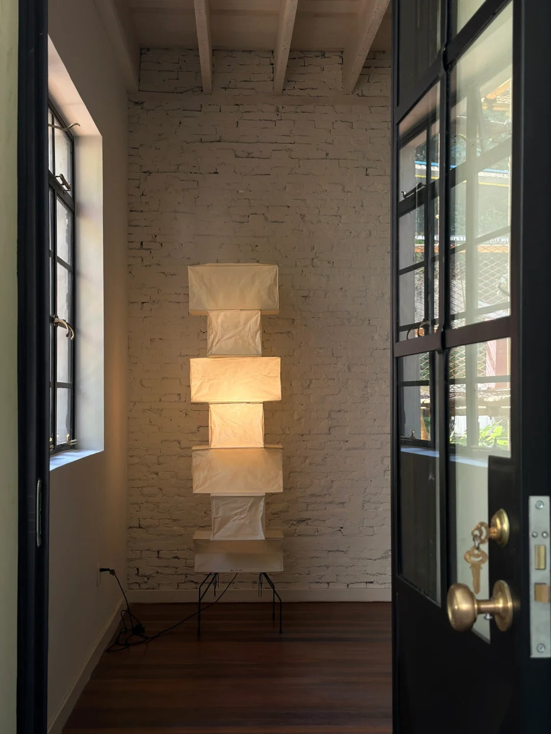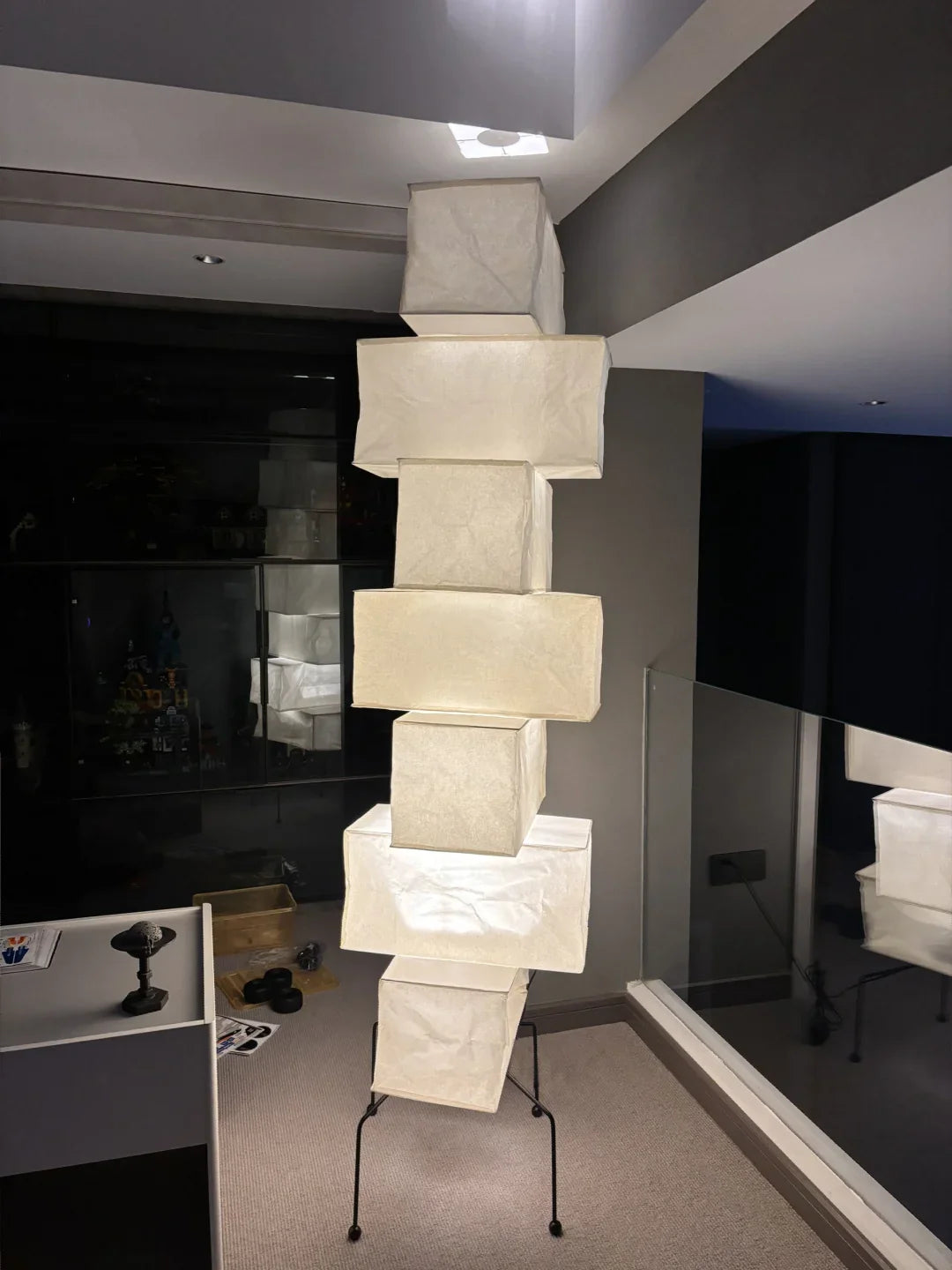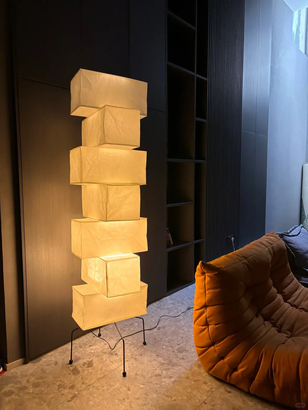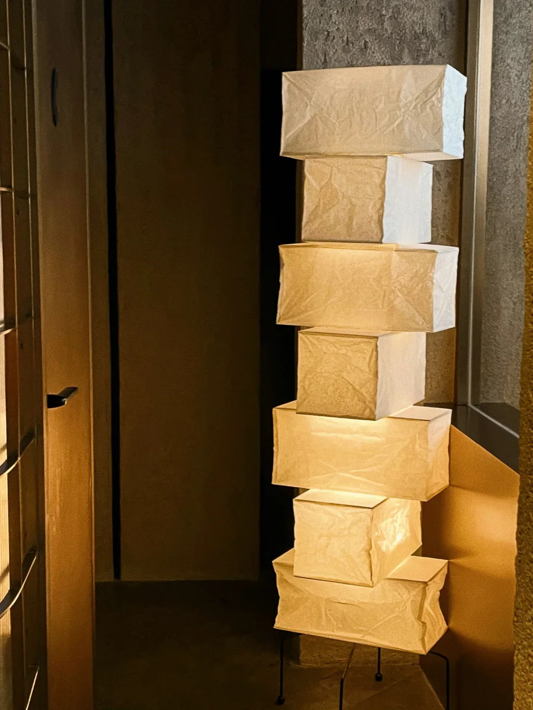 - The Akari UF4-L10 Floor Lamp is a stunning example of modern Japanese design. Crafted with meticulous attention to detail, this lamp features a series of stacked square forms that create a captivating layered look. The interplay of light and shadow through the delicate washi paper creates a warm and inviting ambiance in any space.