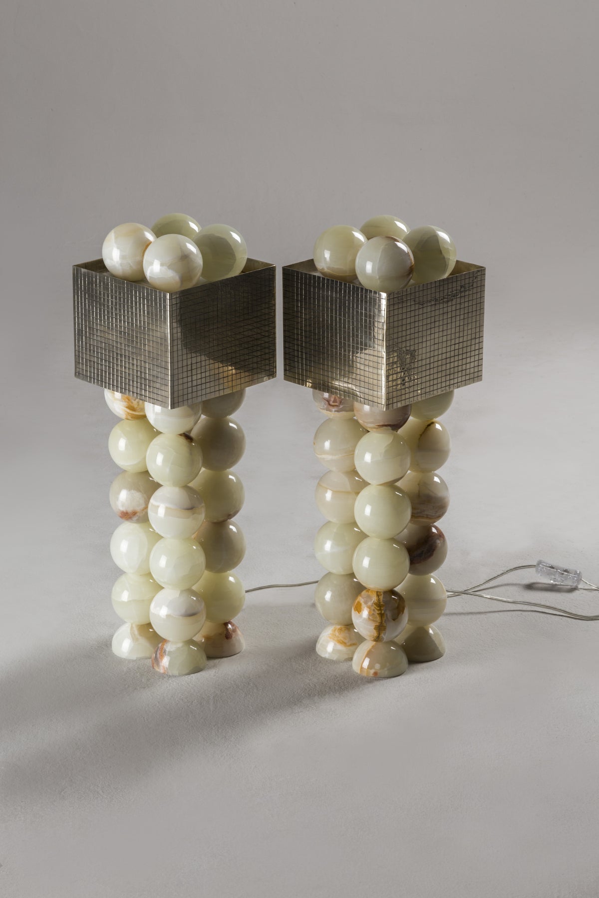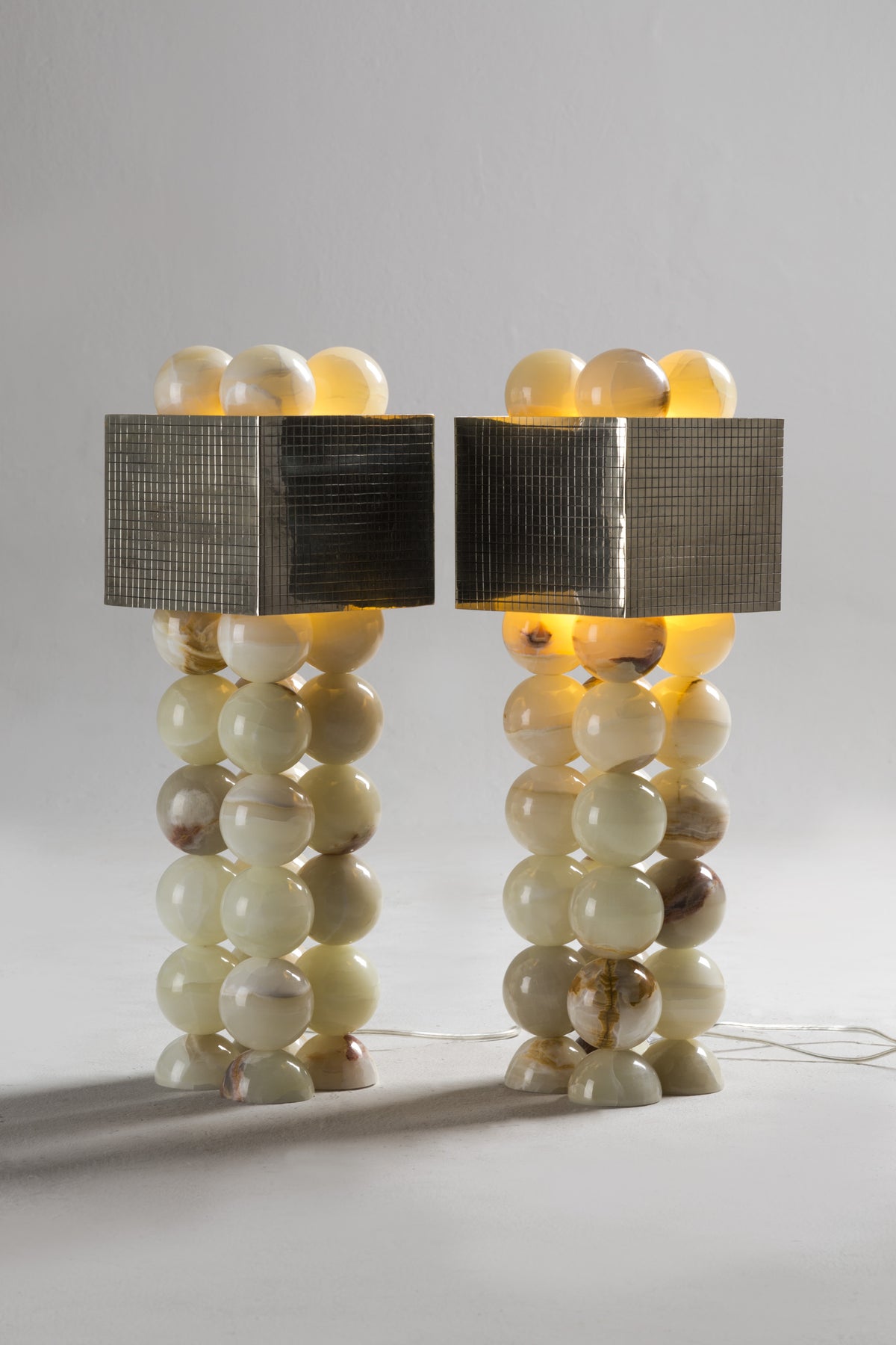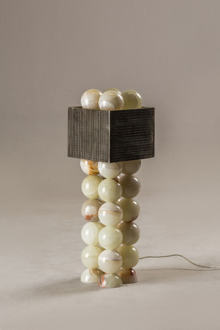 - This design is a geological journey made tangible. The lamp's striking structure consists of a sequence of lathe-modeled white onyx spheres, crafted from precious stone mined directly from the earth. When illuminated, the light penetrating the natural mineral layers showcases a dimension of beauty previously unknown.