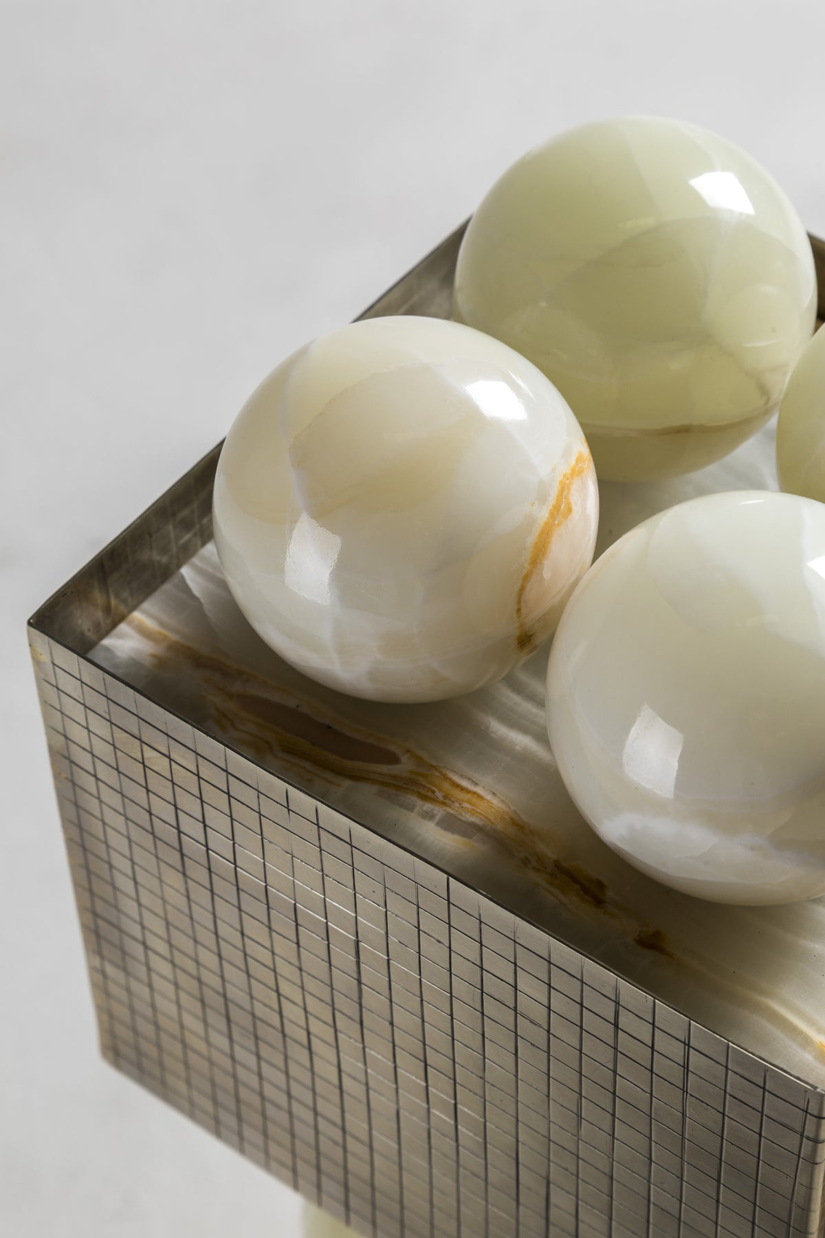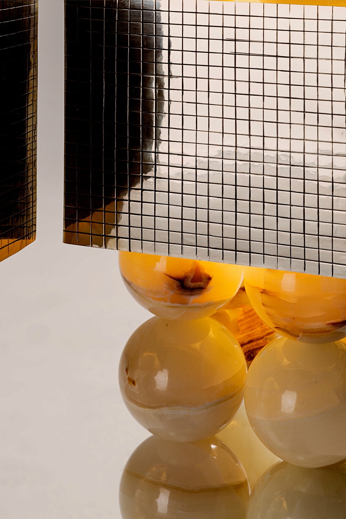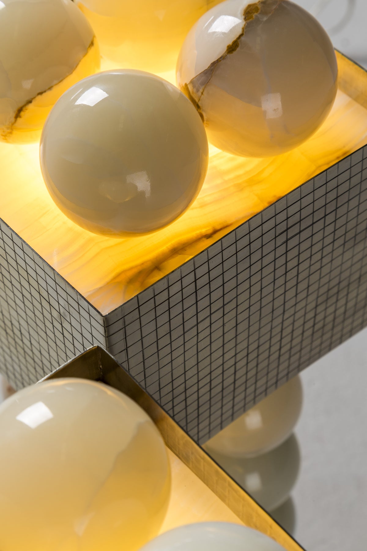 - This design is a geological journey made tangible. The lamp's striking structure consists of a sequence of lathe-modeled white onyx spheres, crafted from precious stone mined directly from the earth. When illuminated, the light penetrating the natural mineral layers showcases a dimension of beauty previously unknown.