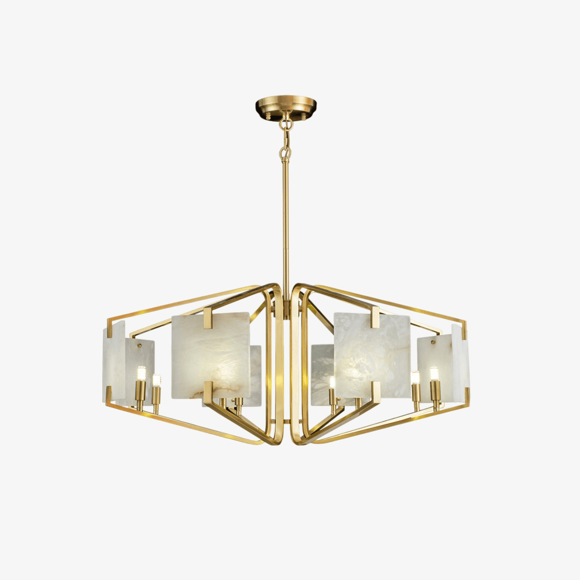 - Elevate your living space with the Audette Alabaster Chandelier, an exquisite lighting fixture that embodies the perfect fusion of classic charm and contemporary sophistication. Meticulously crafted, this stunning chandelier features a robust brass lamp body that exudes a timeless appeal, while the sumptuous alabaster lampshades diffuse a warm, inviting glow that enhances any interior.