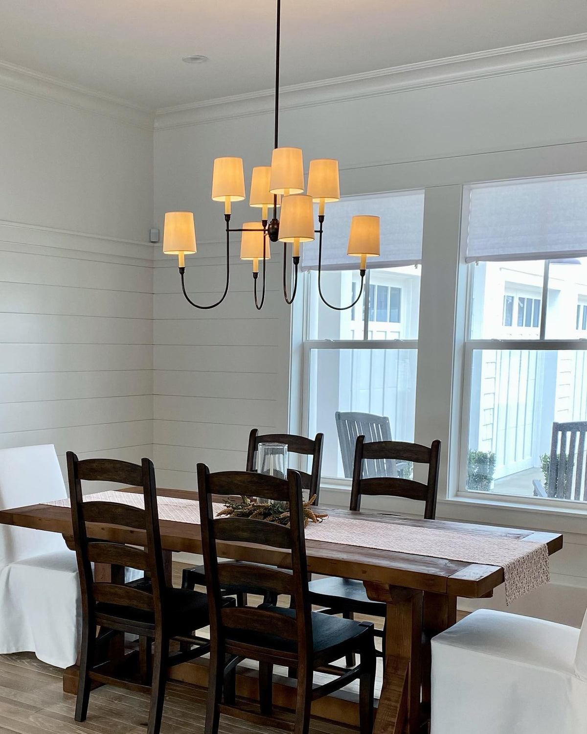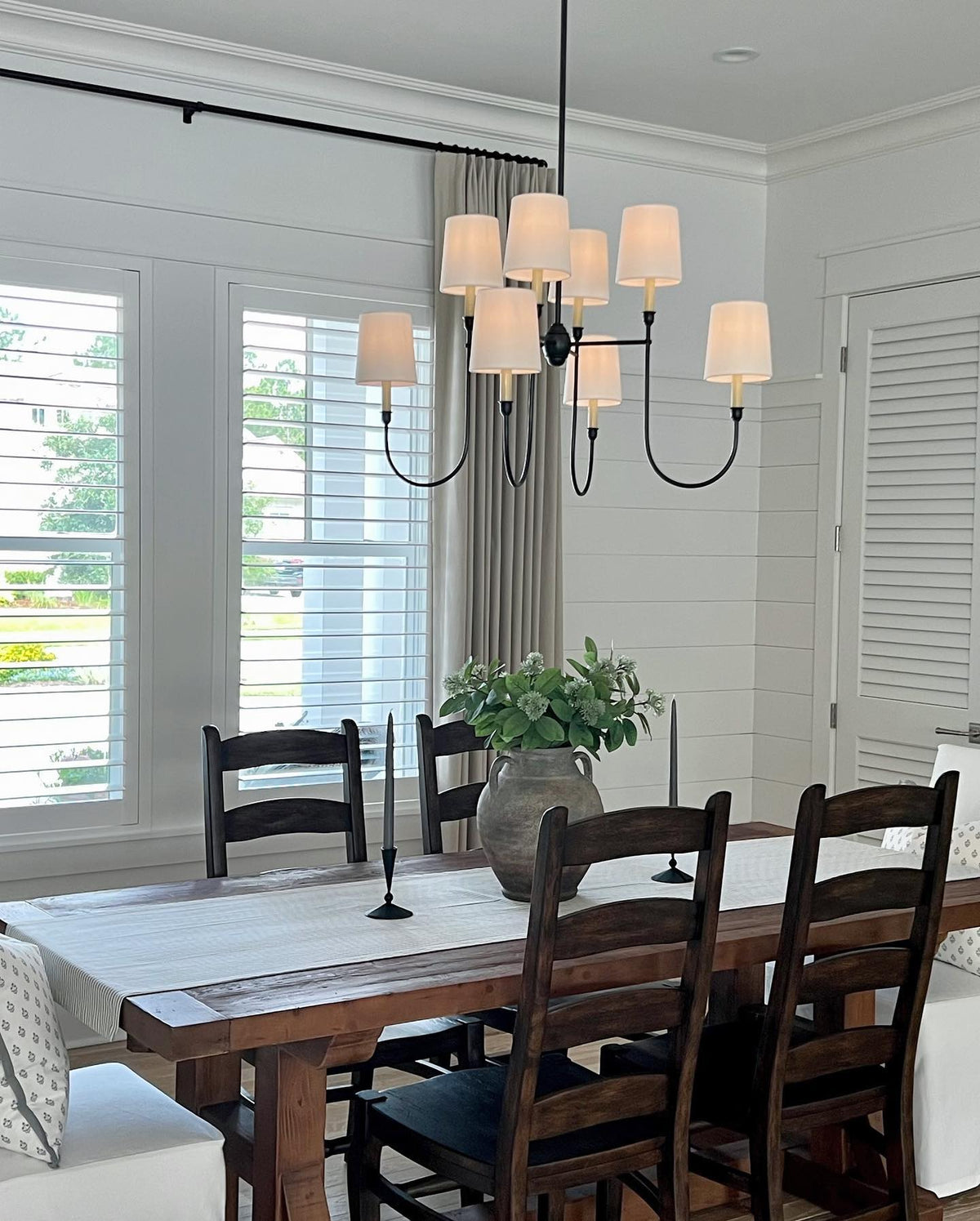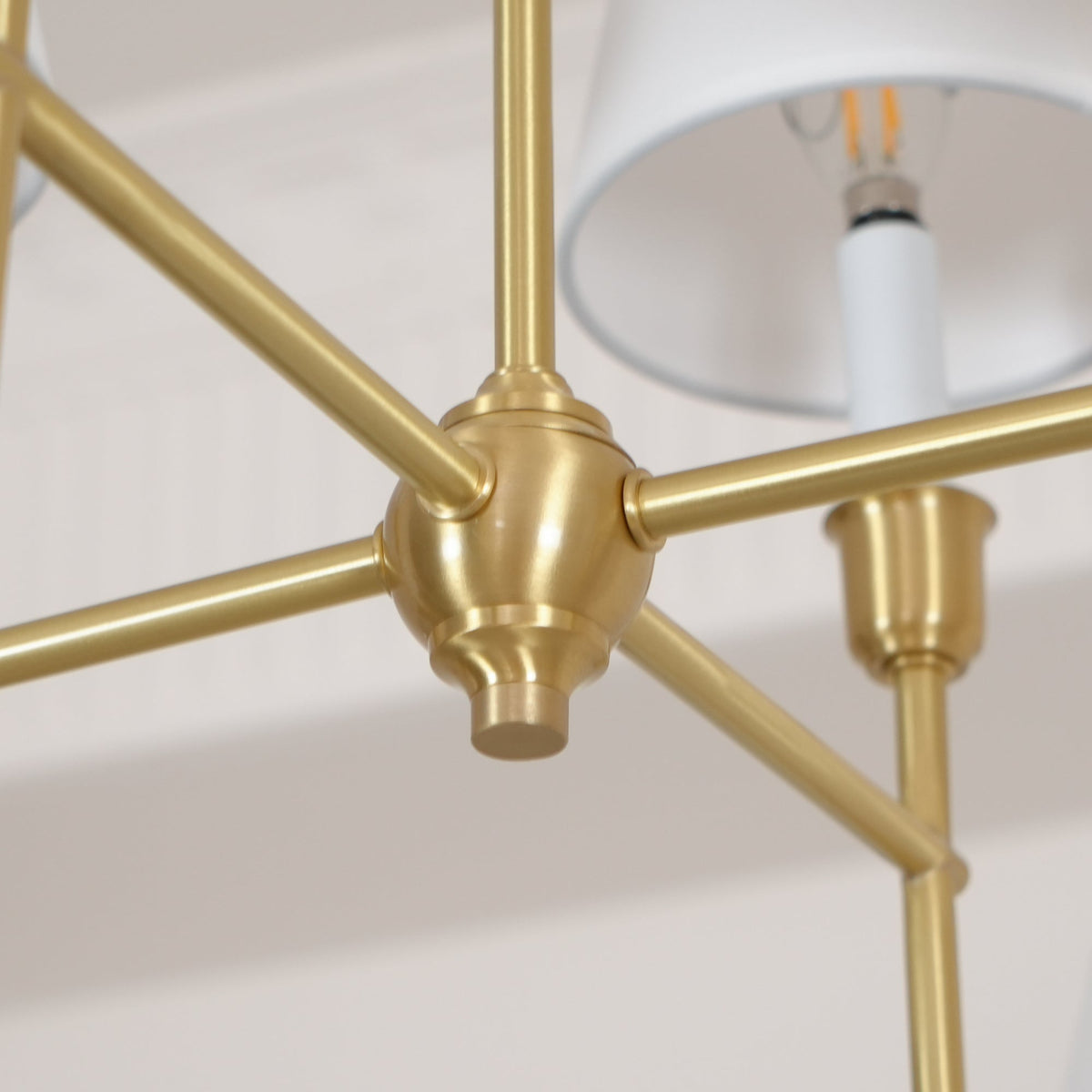 - Add a touch of sophistication to your home with the Baumgardt Chandelier. This stunning piece features tapered shades and candlesticks gracefully supported by slim curved arms, creating a timeless and elegant design. The soft linen shades diffuse the light, providing a warm and inviting ambiance in your foyer, dining room, or living room. With its understated luxury, the Baumgardt Chandelier is a versatile piece that complements a variety of interior styles.