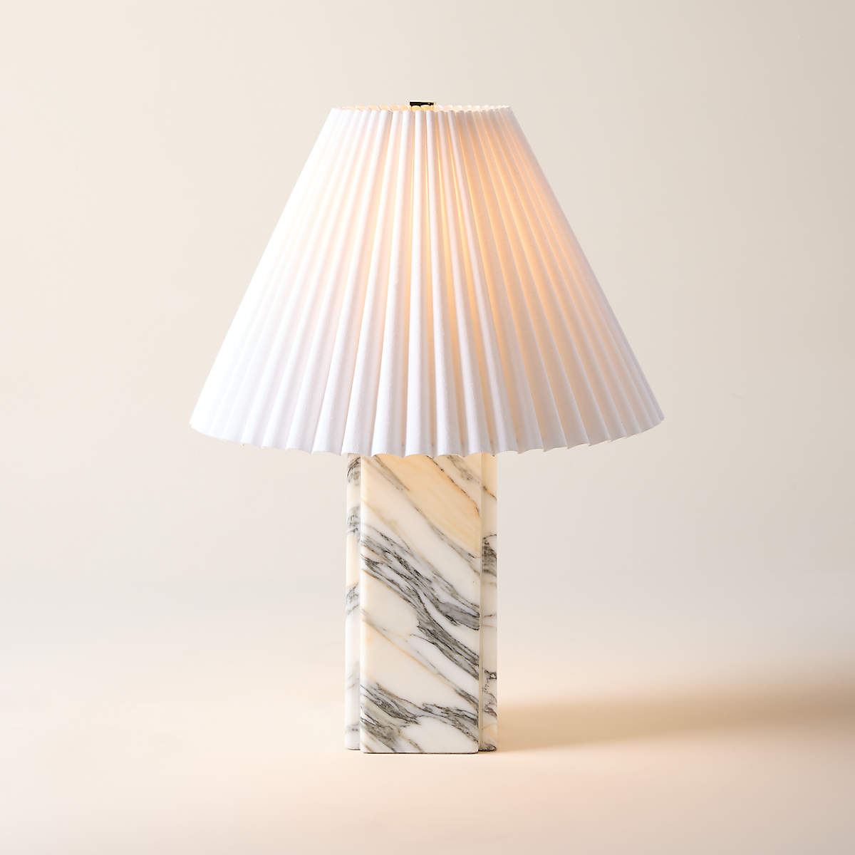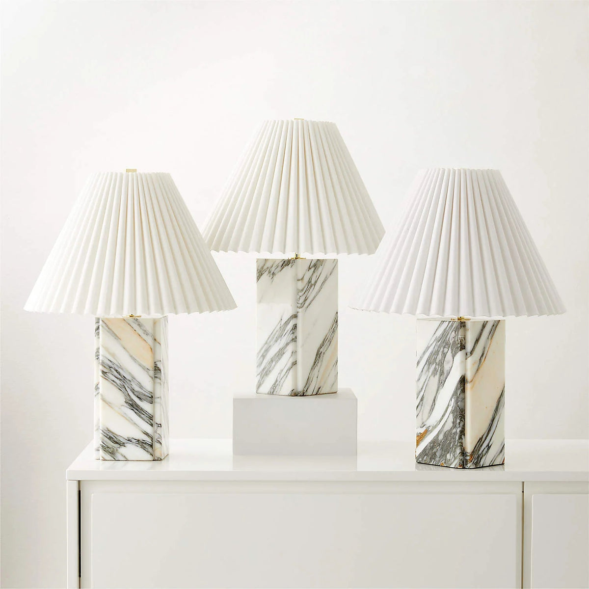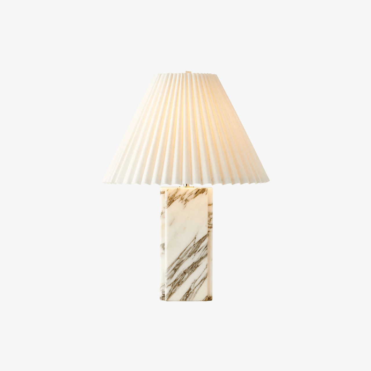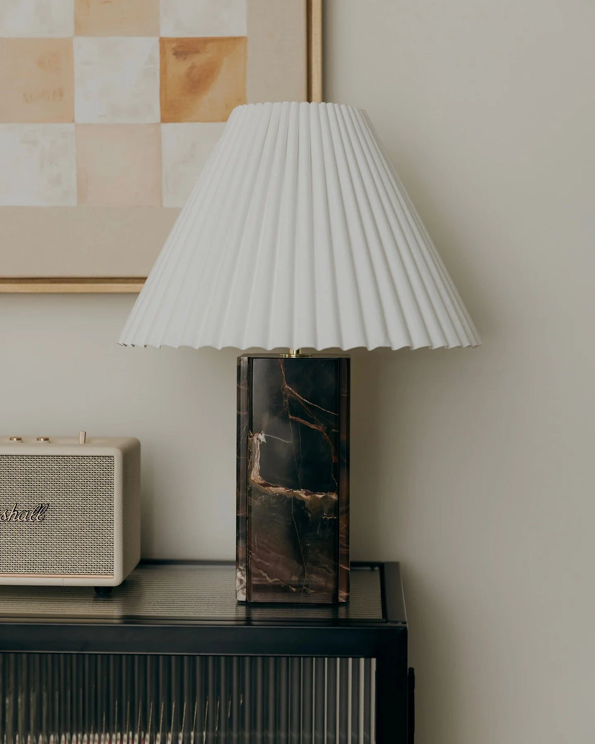 - Topped with an elegant white linen shade, delicately pleated for a refined finish, this lamp exudes timeless sophistication. The interplay of rich marble tones and soft fabric creates a harmonious balance of texture and light, making it a standout piece for any refined interior.
