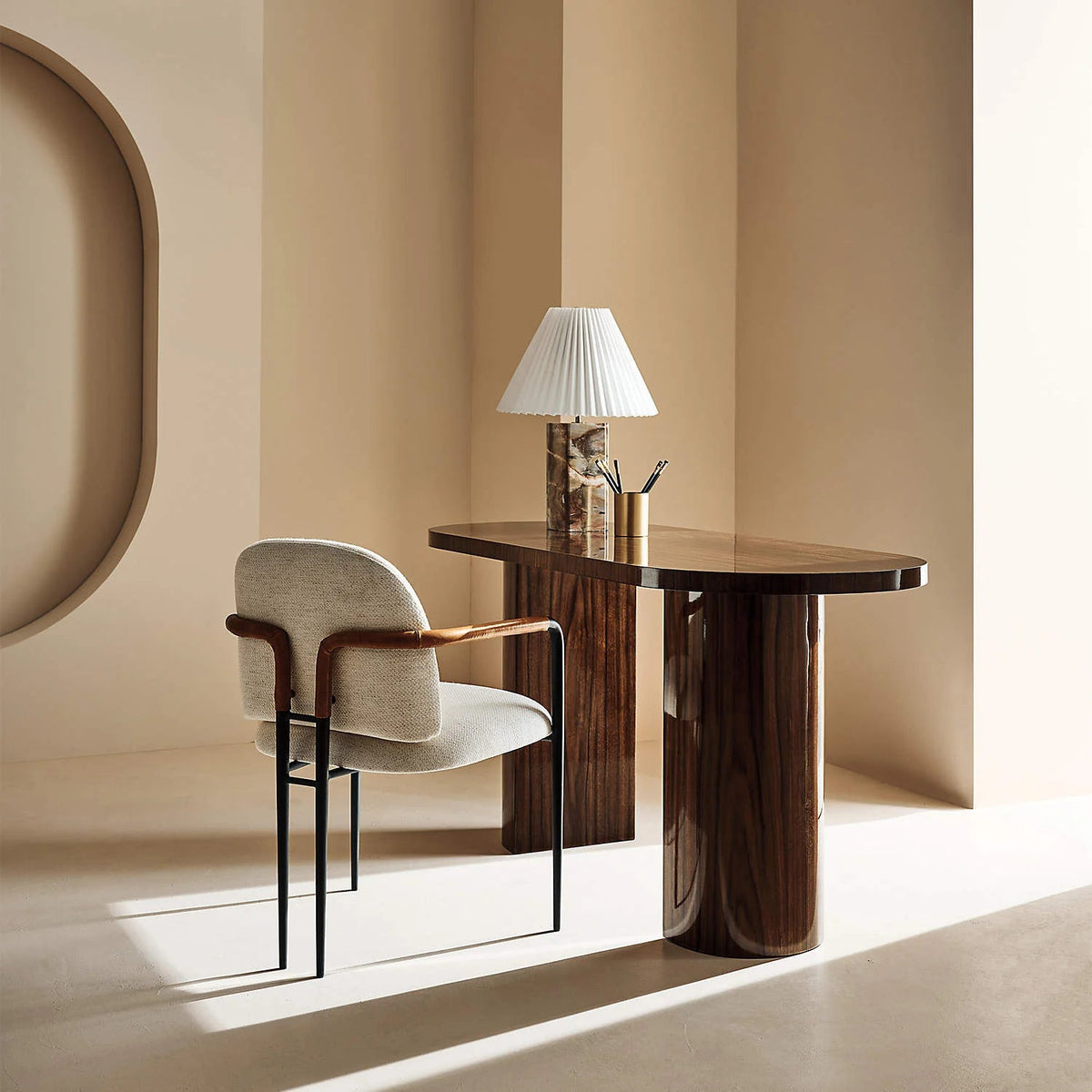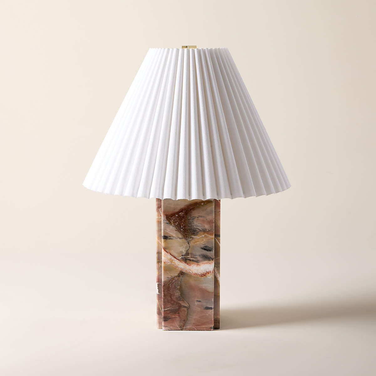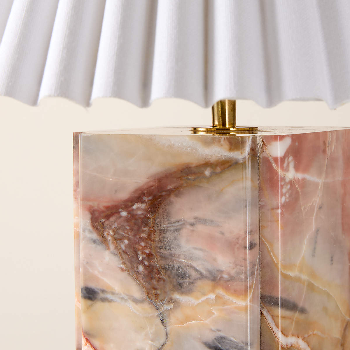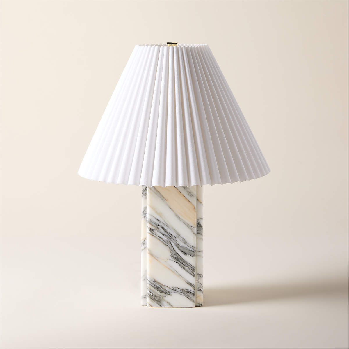 - Topped with an elegant white linen shade, delicately pleated for a refined finish, this lamp exudes timeless sophistication. The interplay of rich marble tones and soft fabric creates a harmonious balance of texture and light, making it a standout piece for any refined interior.