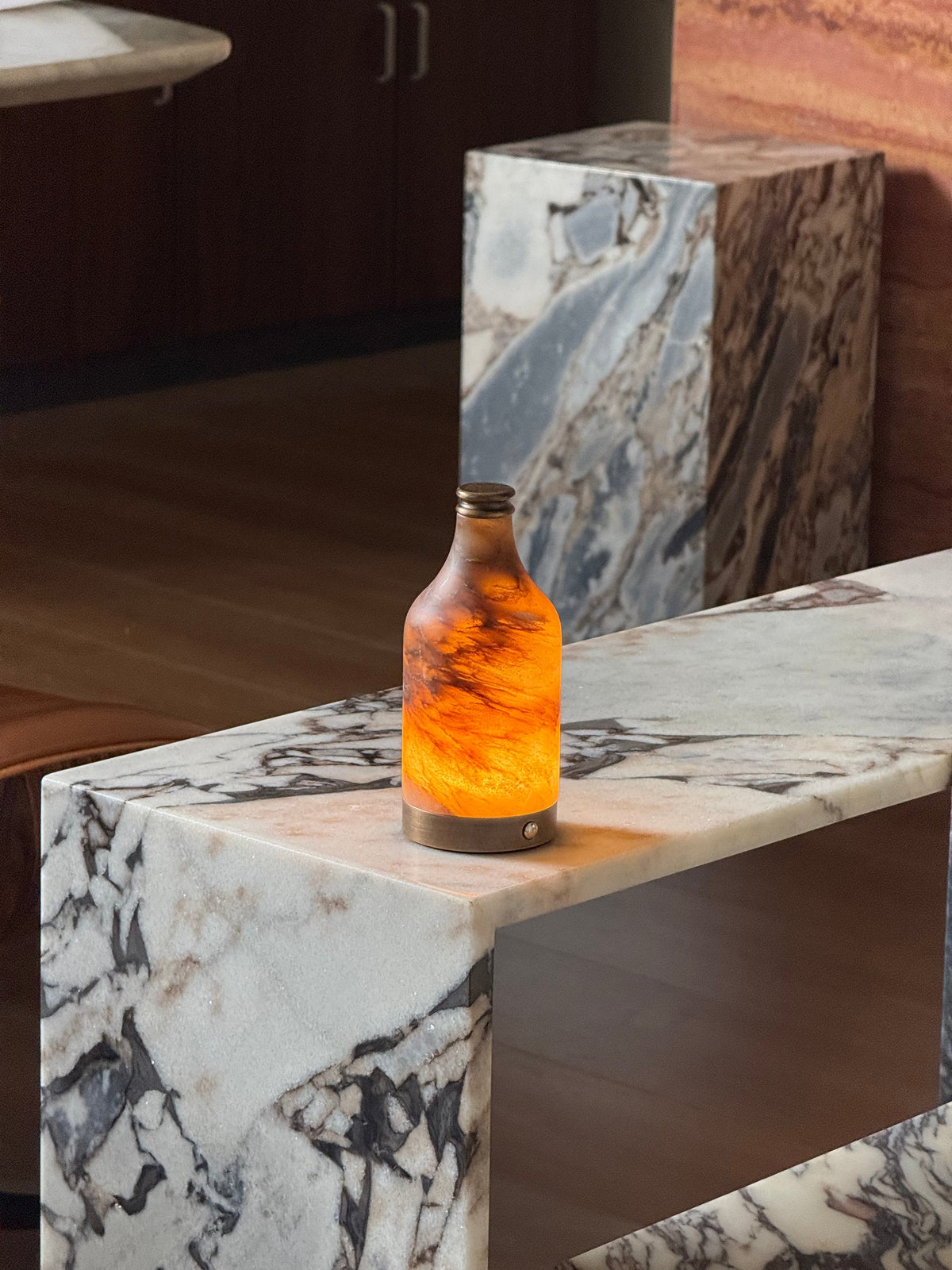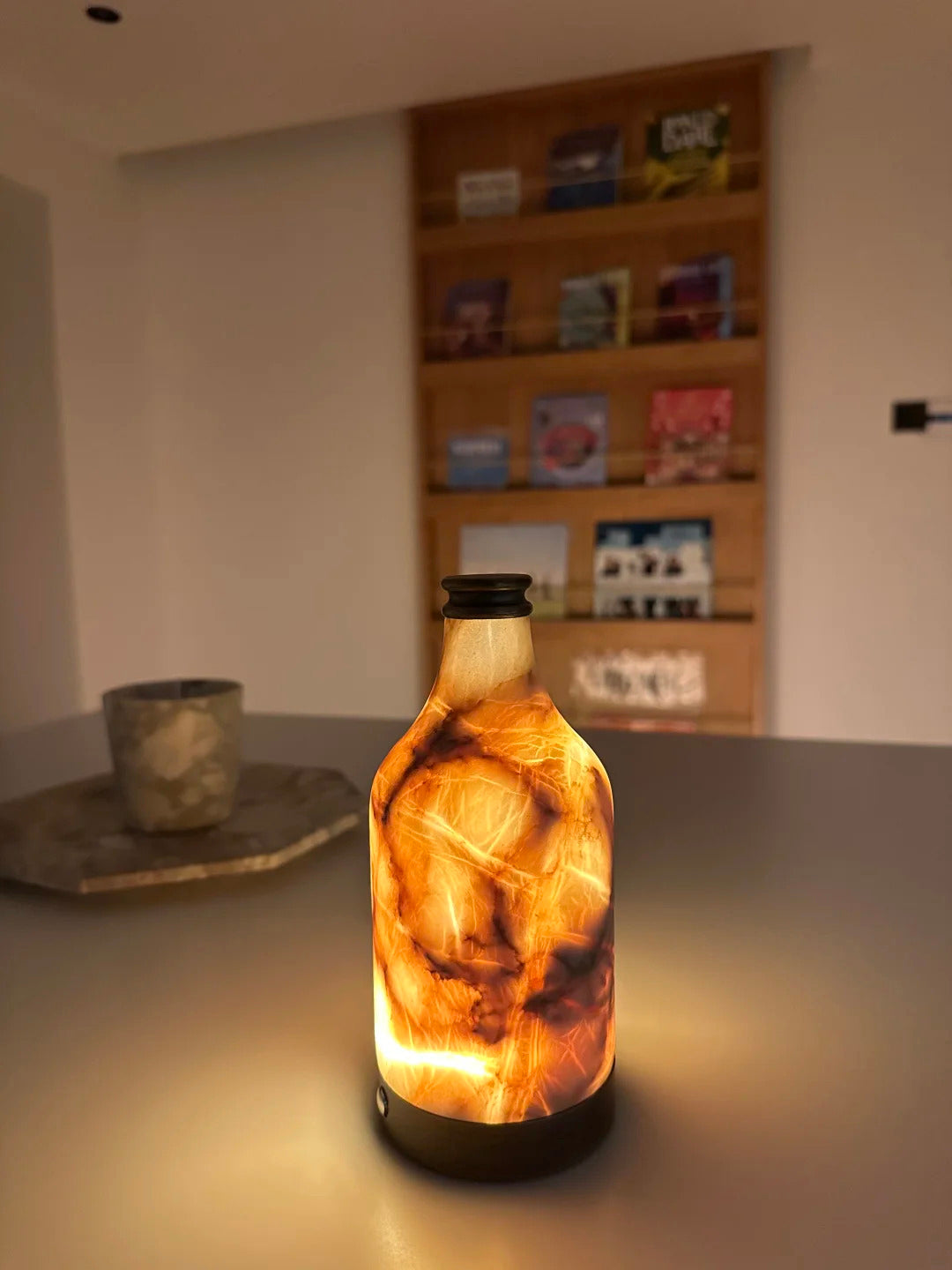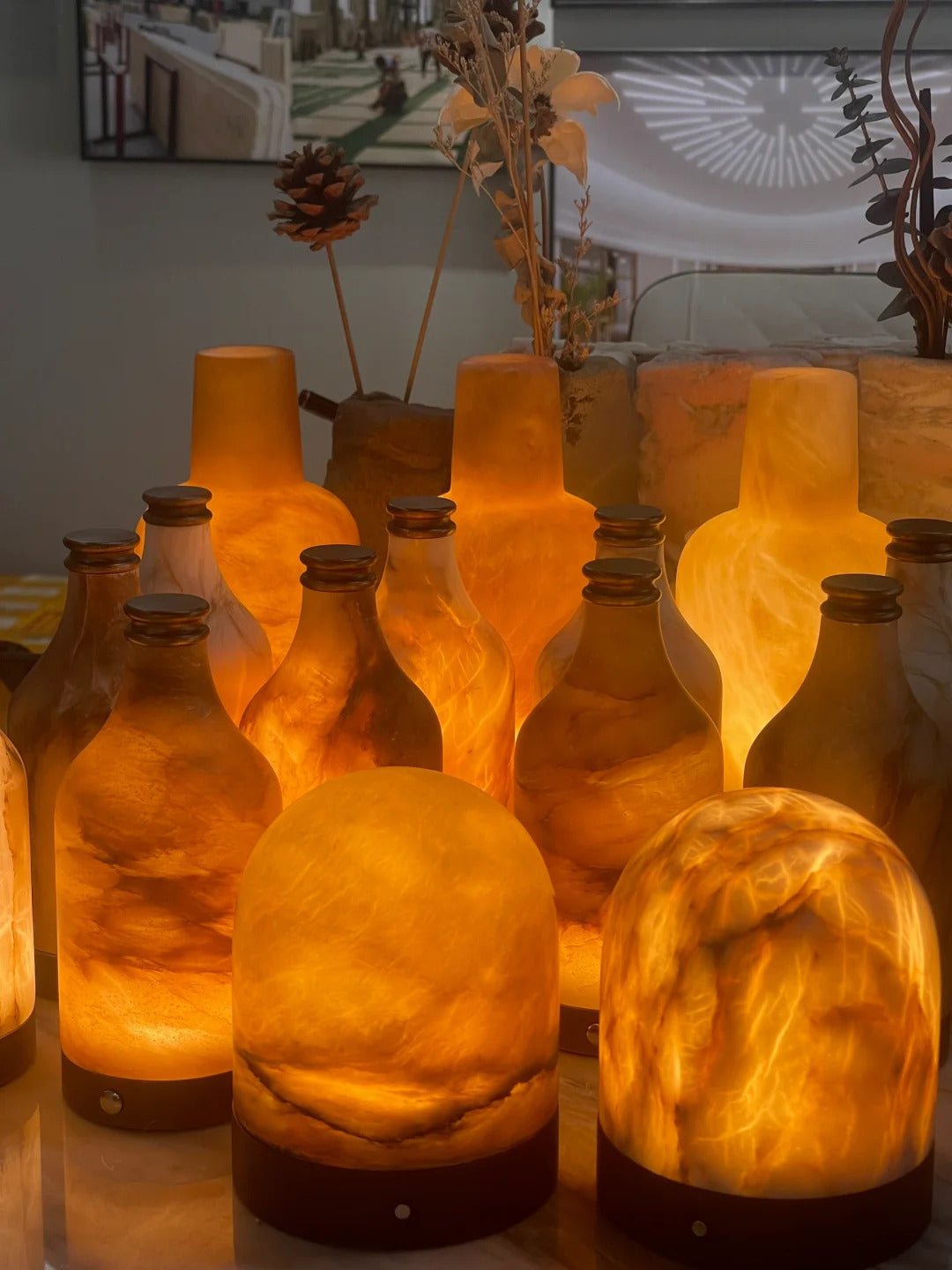 - Illuminate your space with the Bottle Alabaster Table Lamp, a stunning blend of natural beauty and contemporary design. Crafted from Spanish tobacco alabaster, each lamp boasts a unique, smudged texture that adds organic elegance to any room. The warm, softly diffused light shines through the delicate stone, creating a cozy and inviting atmosphere.