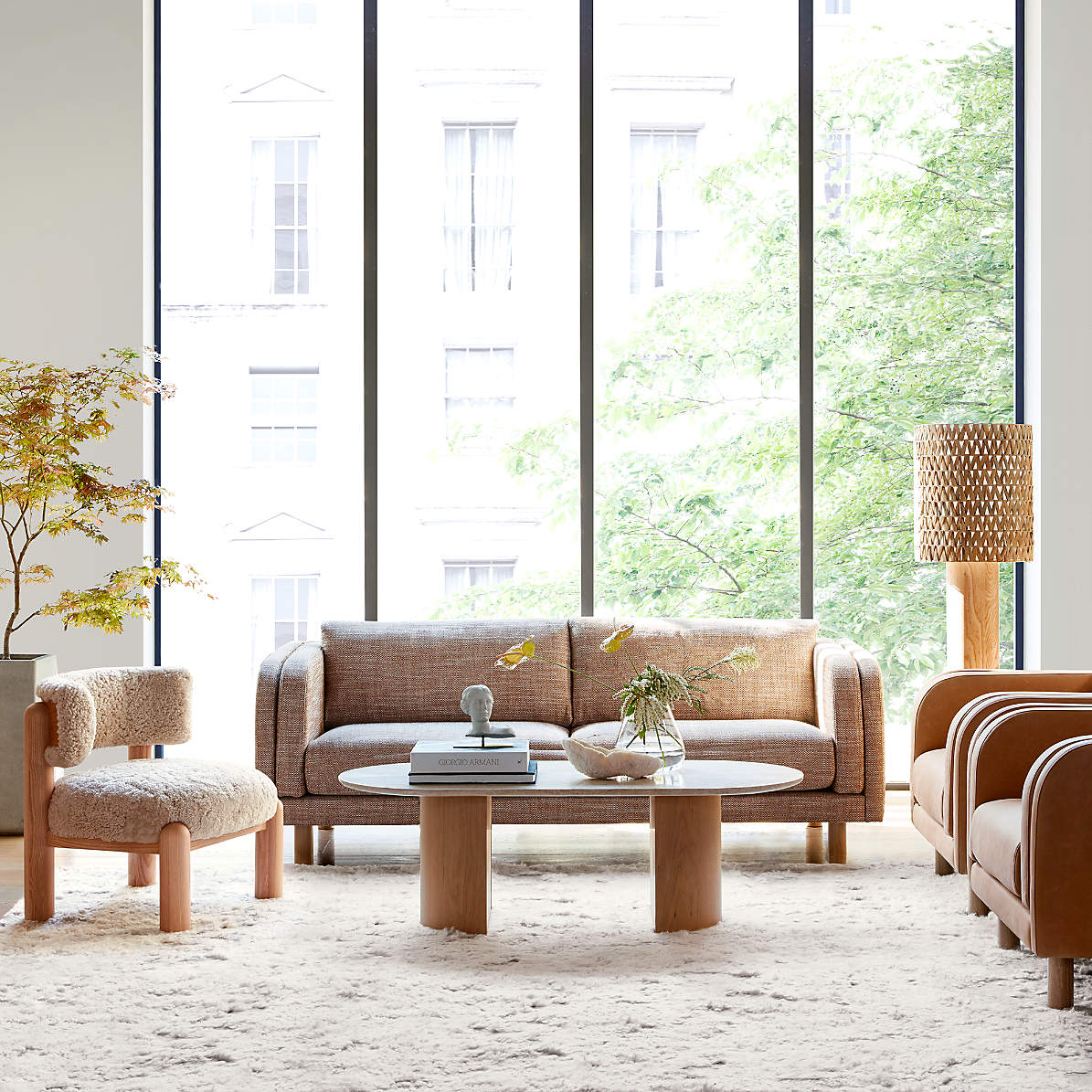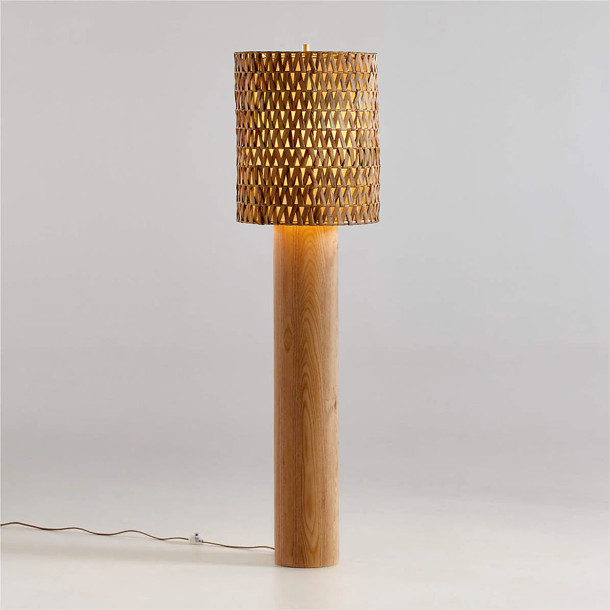 - Elevate your space with the Brodie Wood Floor Lamp, a stunning blend of bold proportions and natural materials. This eye-catching lamp features a tall wooden pillar that gracefully supports a drum shade crafted from natural rattan, lined with linen to softly diffuse light and create a warm, inviting ambiance. The shade's graphic chevron weave adds a touch of modern elegance, while its organic texture beautifully complements the lively grain of the ash wood base. Illuminate your home with this harmonious fusion of nature and artistry.