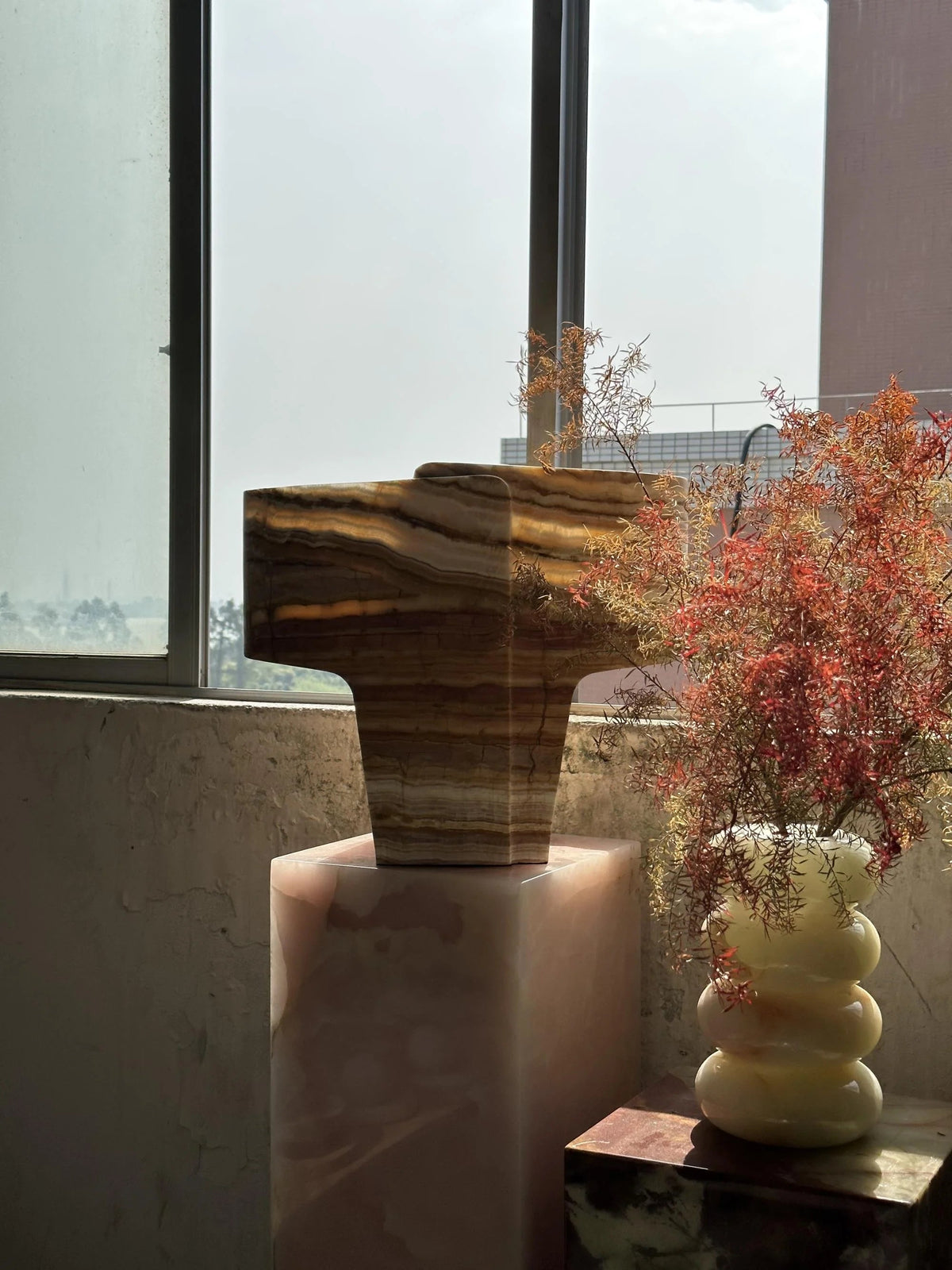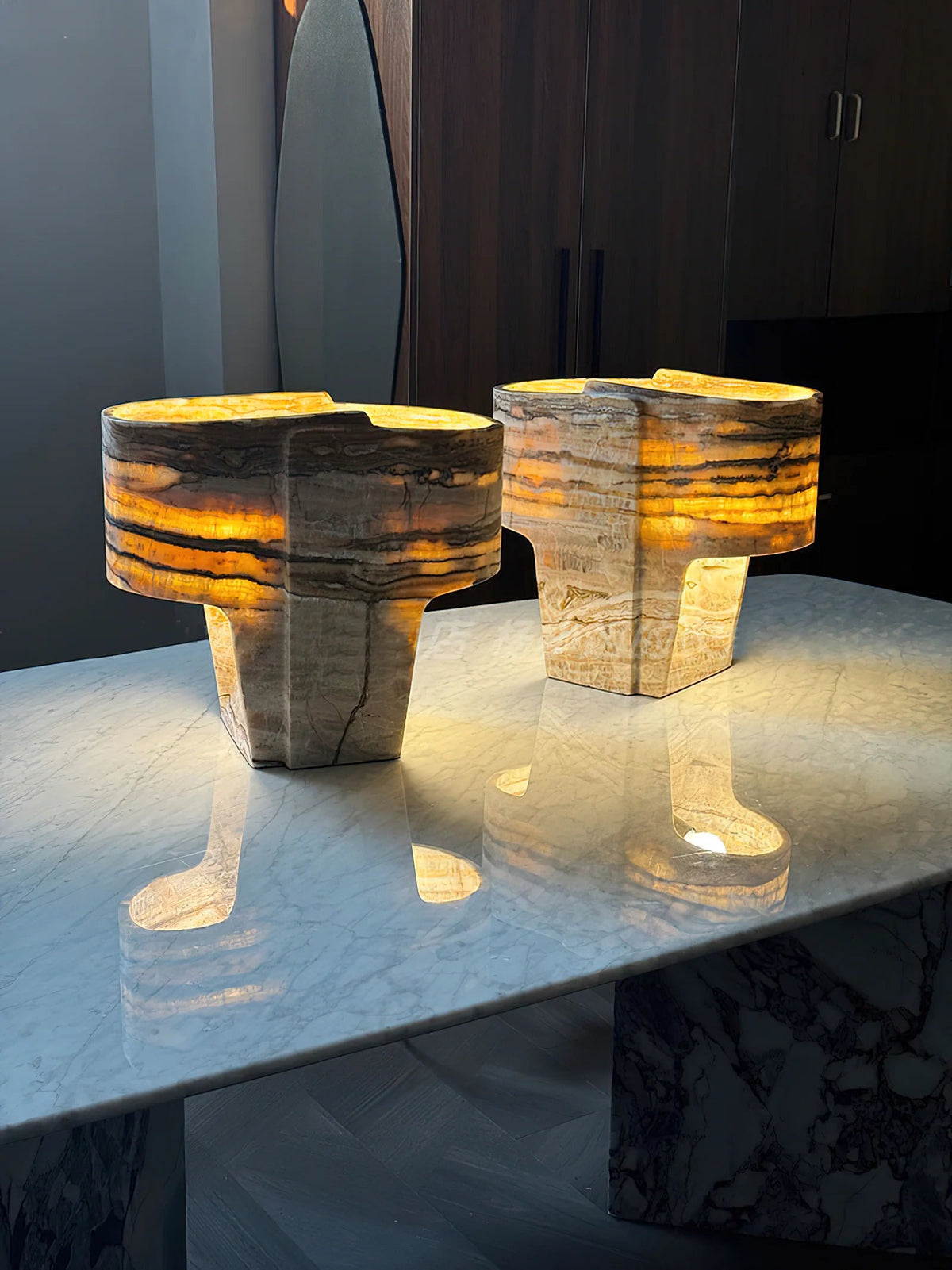 - Illuminate your space with the timeless elegance of the Brown Fantasy Onyx Table Lamp. Crafted from natural onyx stone, this exquisite lamp showcases a stunning tan background, accentuated by intricate diagonal veining in a harmonious blend of ivory, cream, hazelnut, and rich brown tones that transition to nearly black. Each piece is unique, highlighting the natural beauty and organic patterns of the stone.