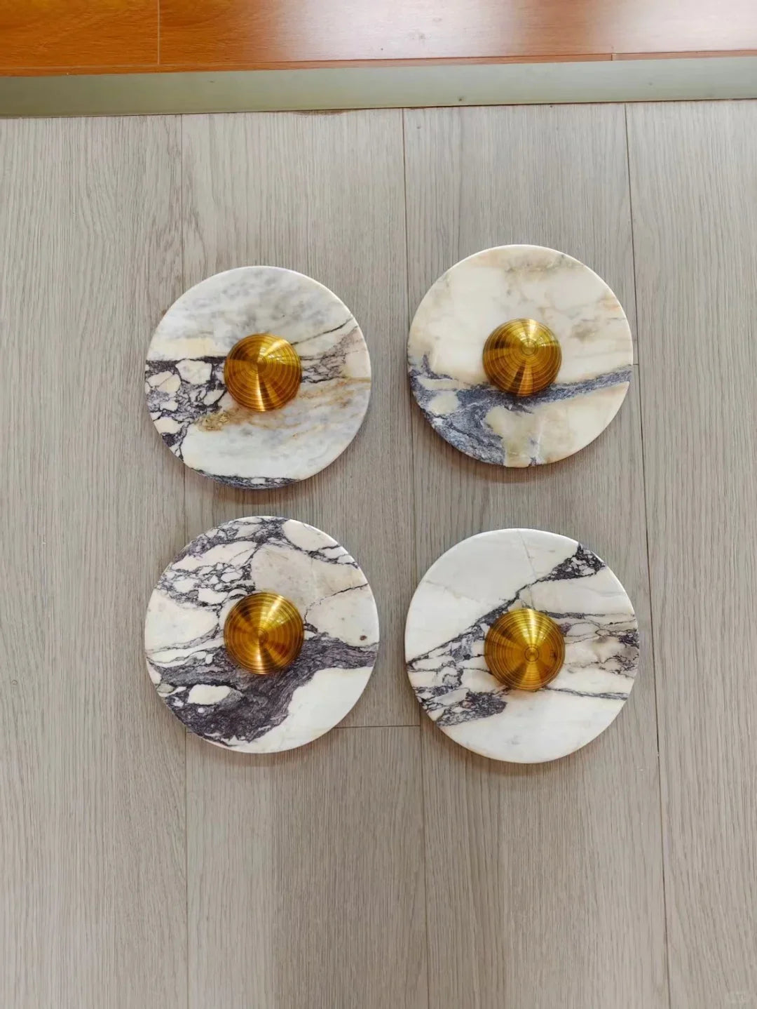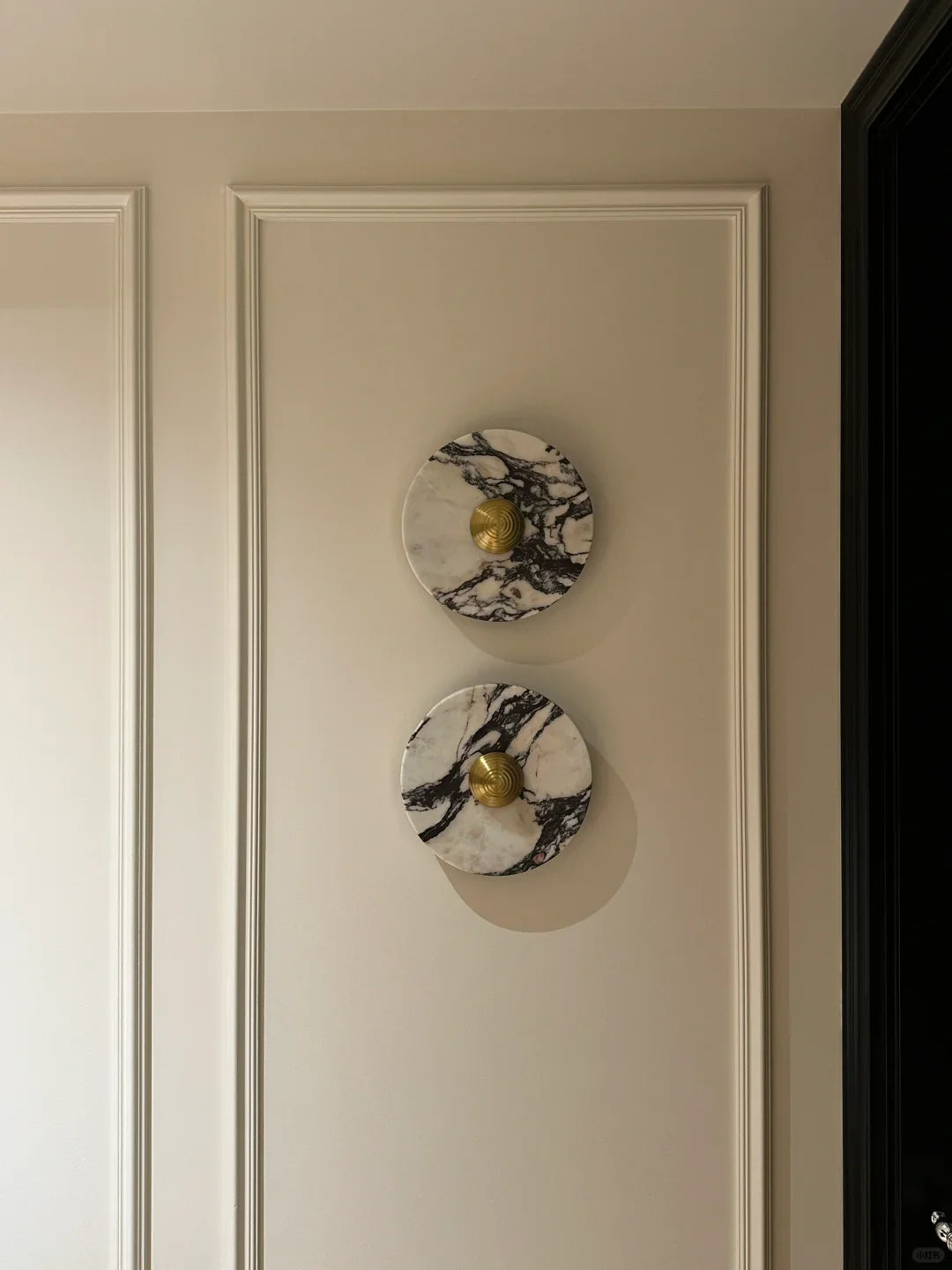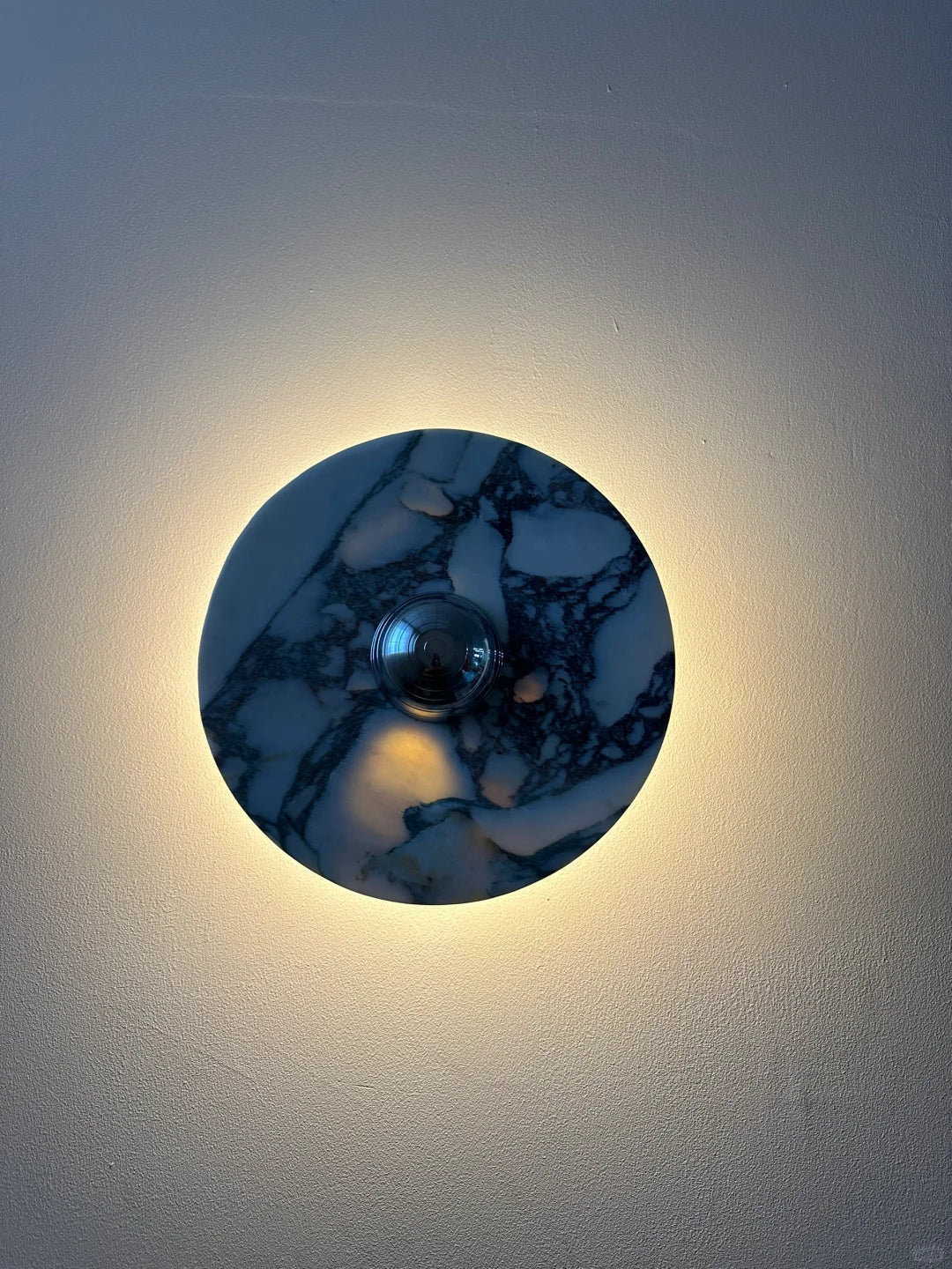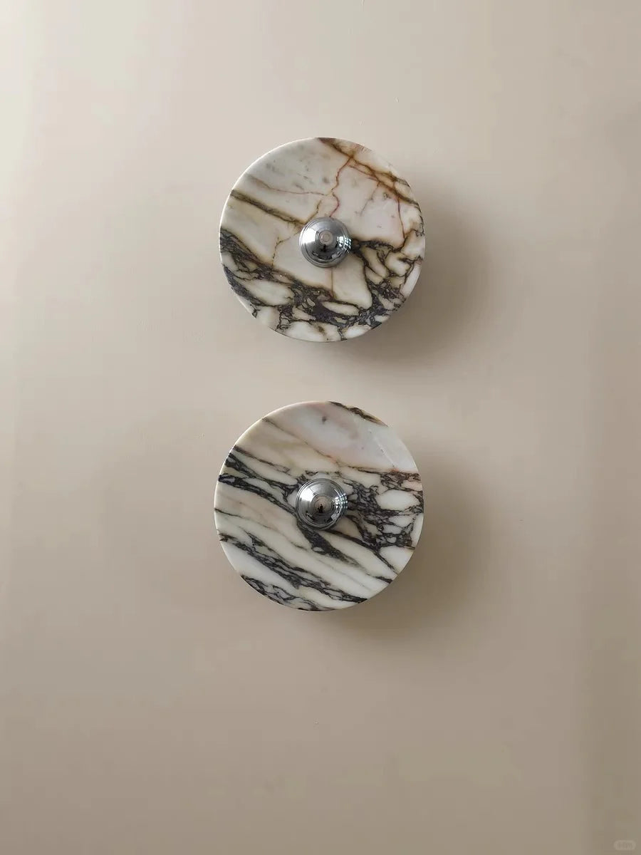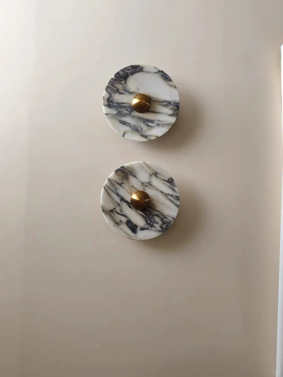 - Illuminate your space with the exquisite Calacatta Oro Round Sconce, a stunning fusion of luxury and craftsmanship. Each sconce features a diffuser crafted from premium Calacatta Oro marble, sourced from one of Italy’s oldest and most revered quarries. The marble showcases a pristine white background adorned with rich golden-beige veining, creating a striking natural pattern that adds sophistication to any room.