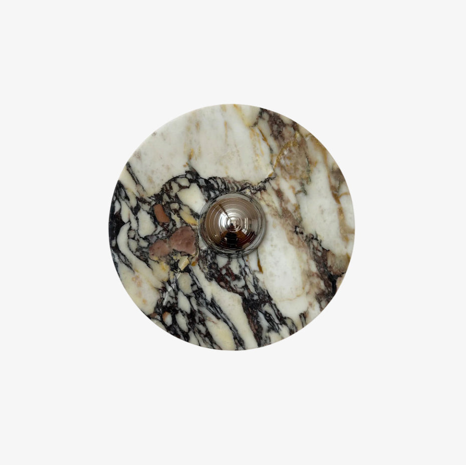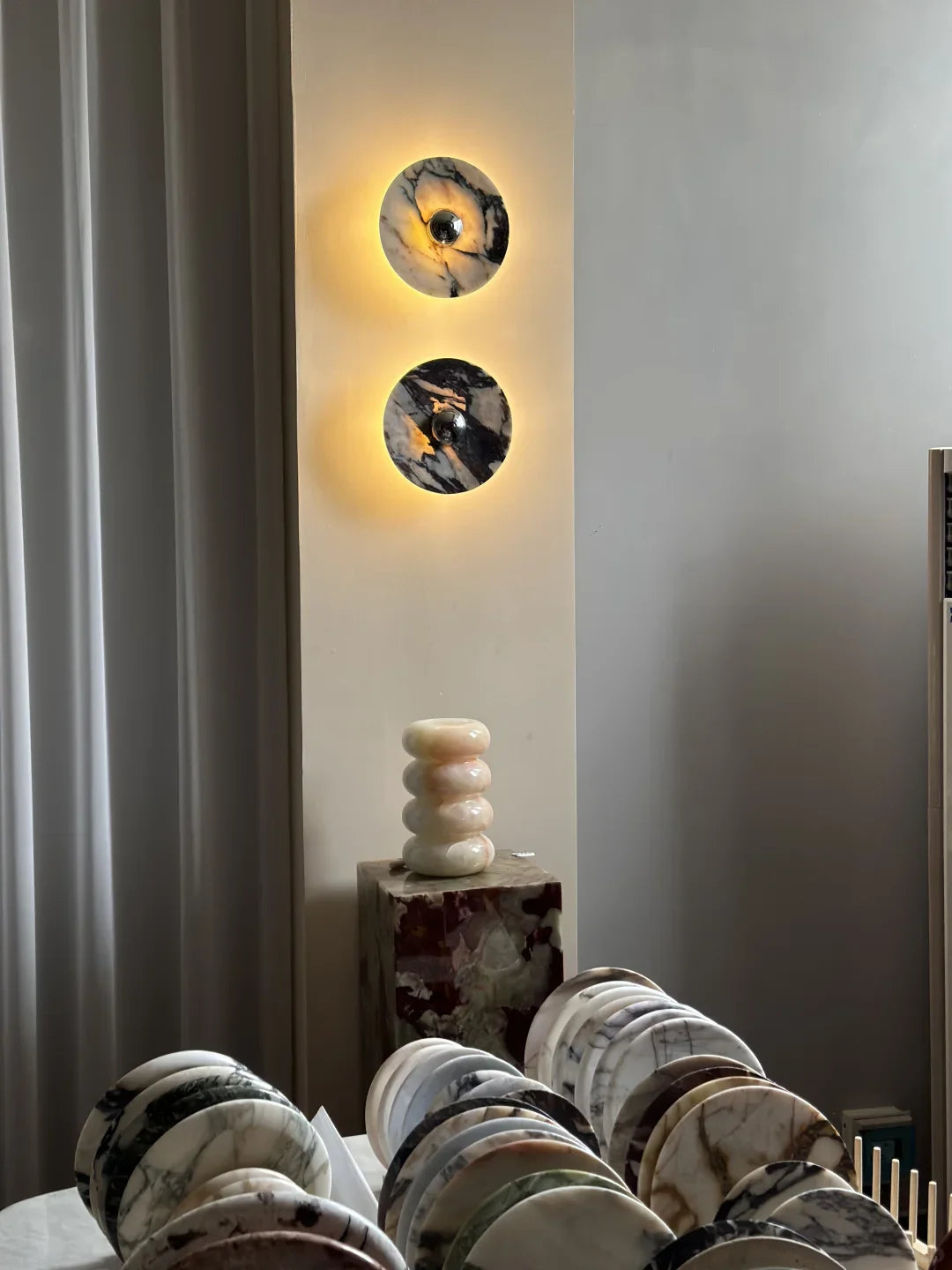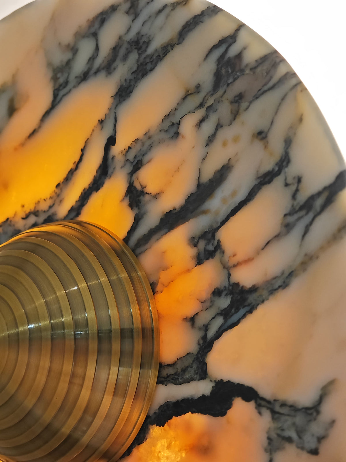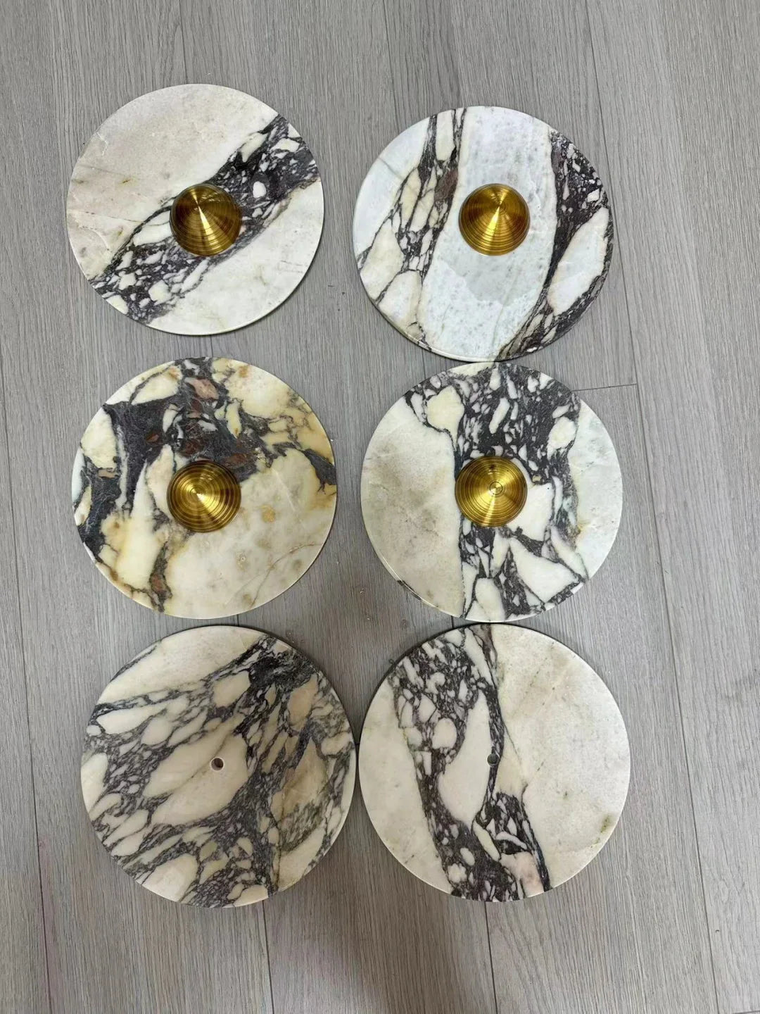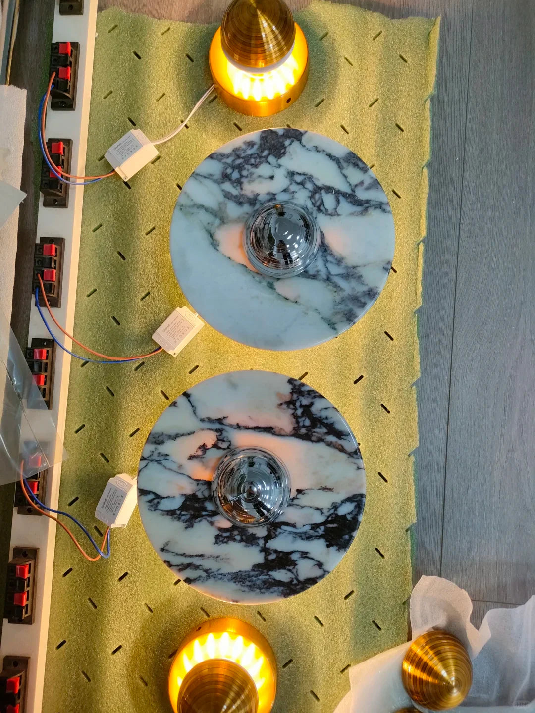 - Illuminate your space with the exquisite Calacatta Oro Round Sconce, a stunning fusion of luxury and craftsmanship. Each sconce features a diffuser crafted from premium Calacatta Oro marble, sourced from one of Italy’s oldest and most revered quarries. The marble showcases a pristine white background adorned with rich golden-beige veining, creating a striking natural pattern that adds sophistication to any room.