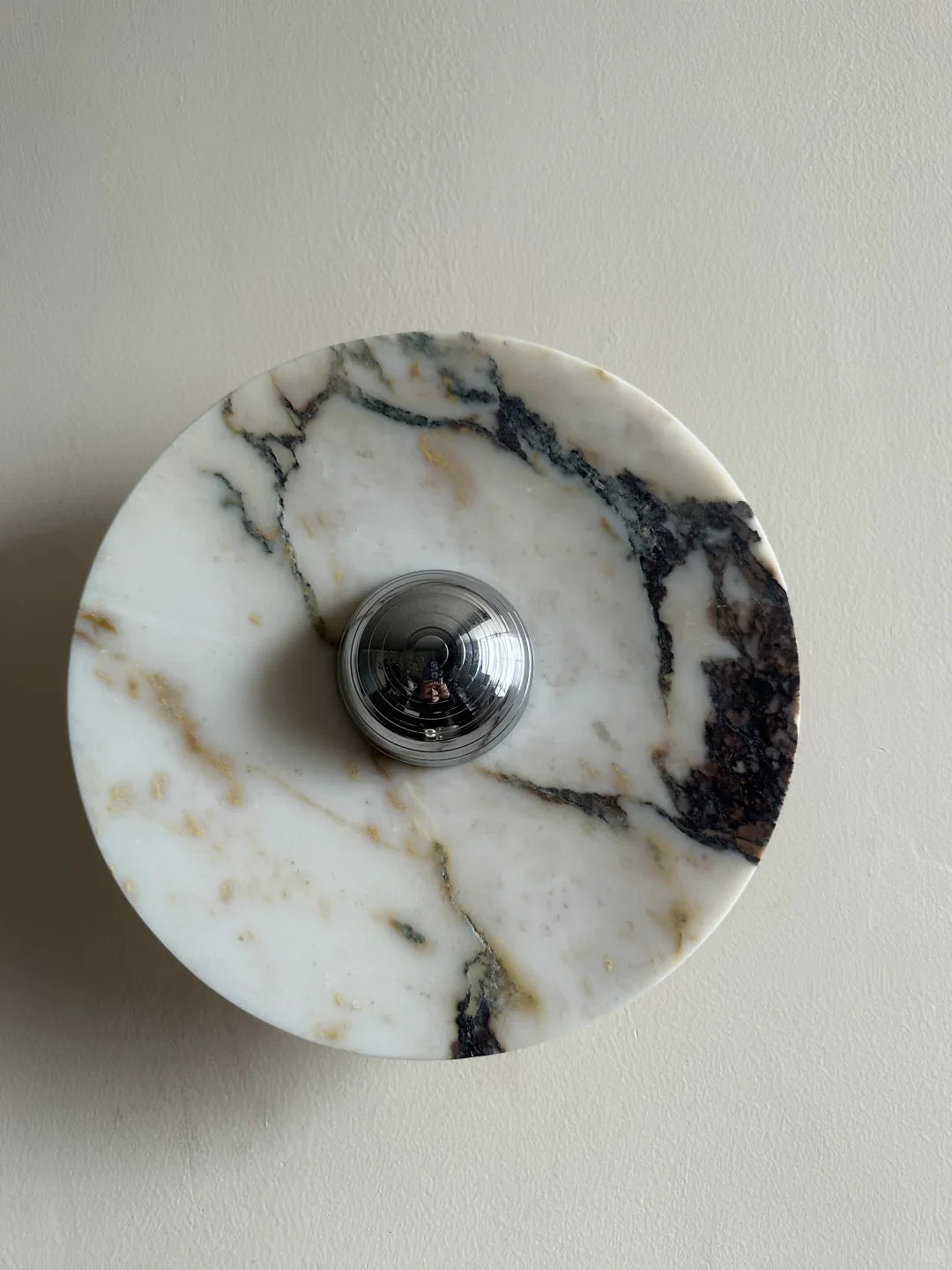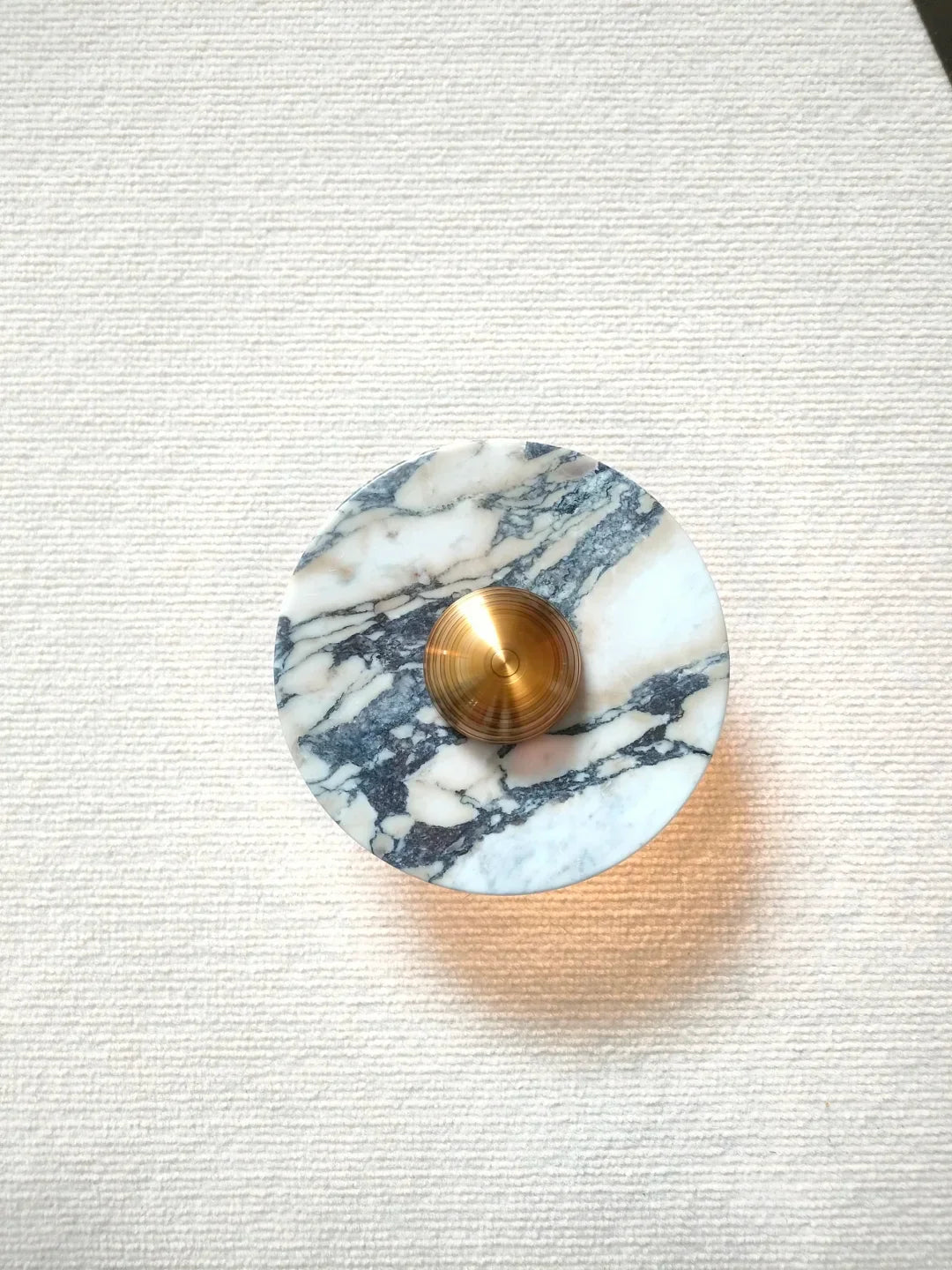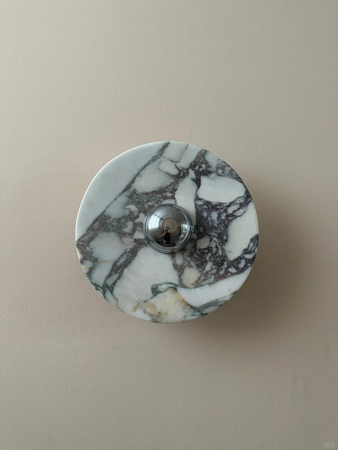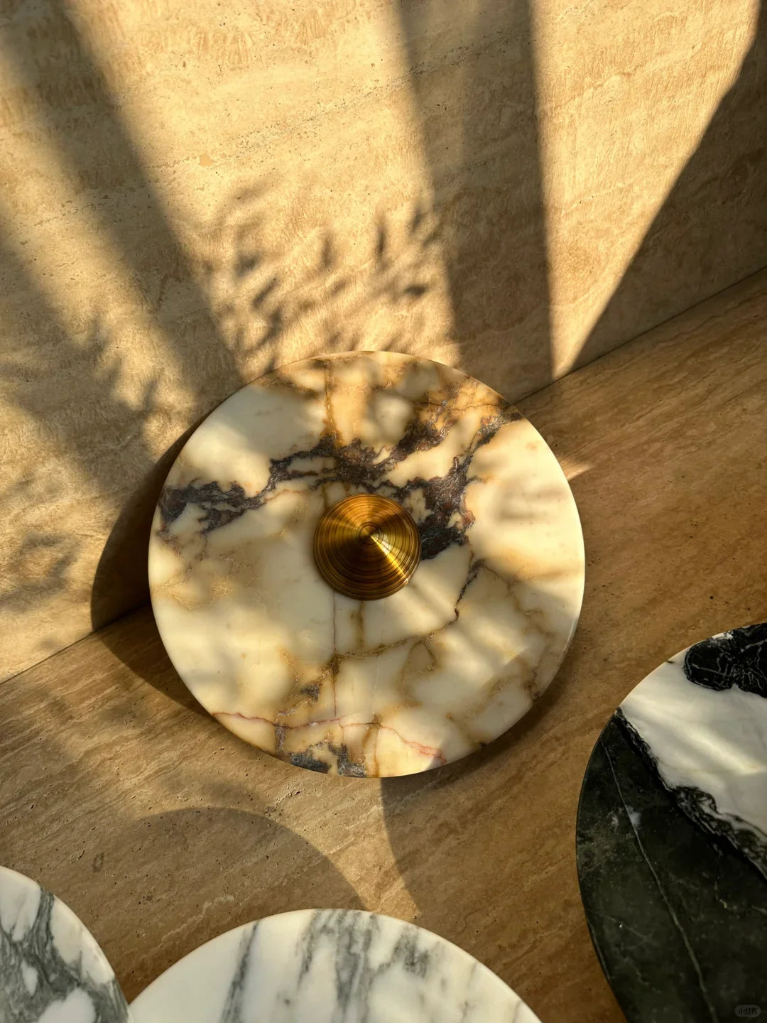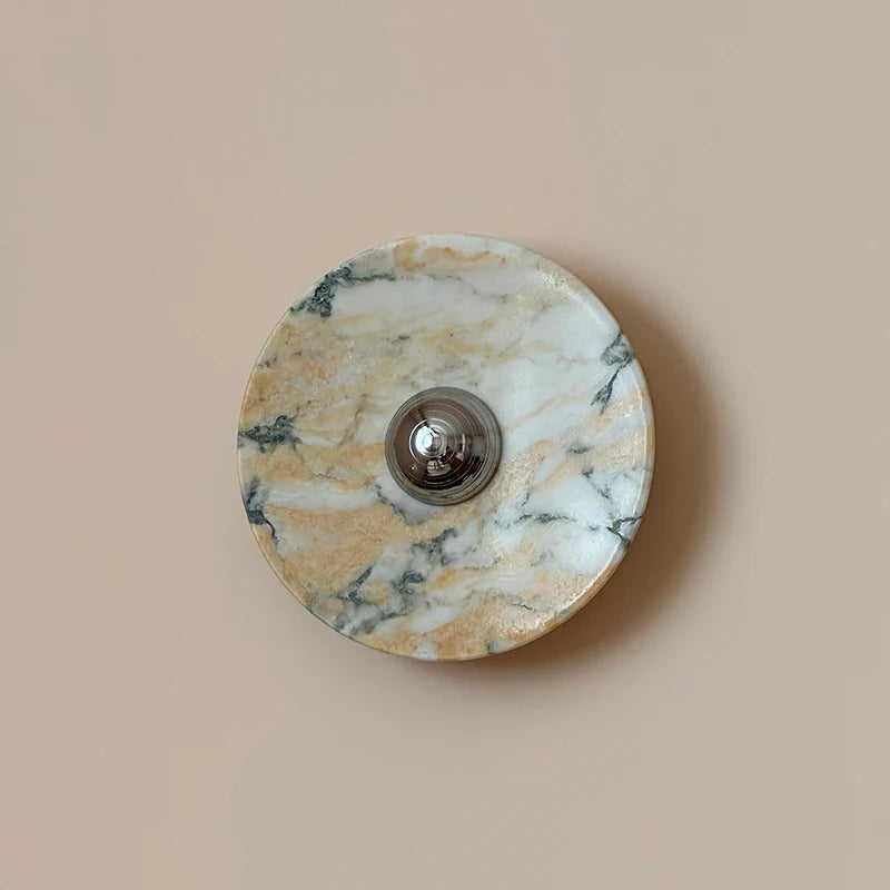 - Illuminate your space with the exquisite Calacatta Oro Round Sconce, a stunning fusion of luxury and craftsmanship. Each sconce features a diffuser crafted from premium Calacatta Oro marble, sourced from one of Italy’s oldest and most revered quarries. The marble showcases a pristine white background adorned with rich golden-beige veining, creating a striking natural pattern that adds sophistication to any room.