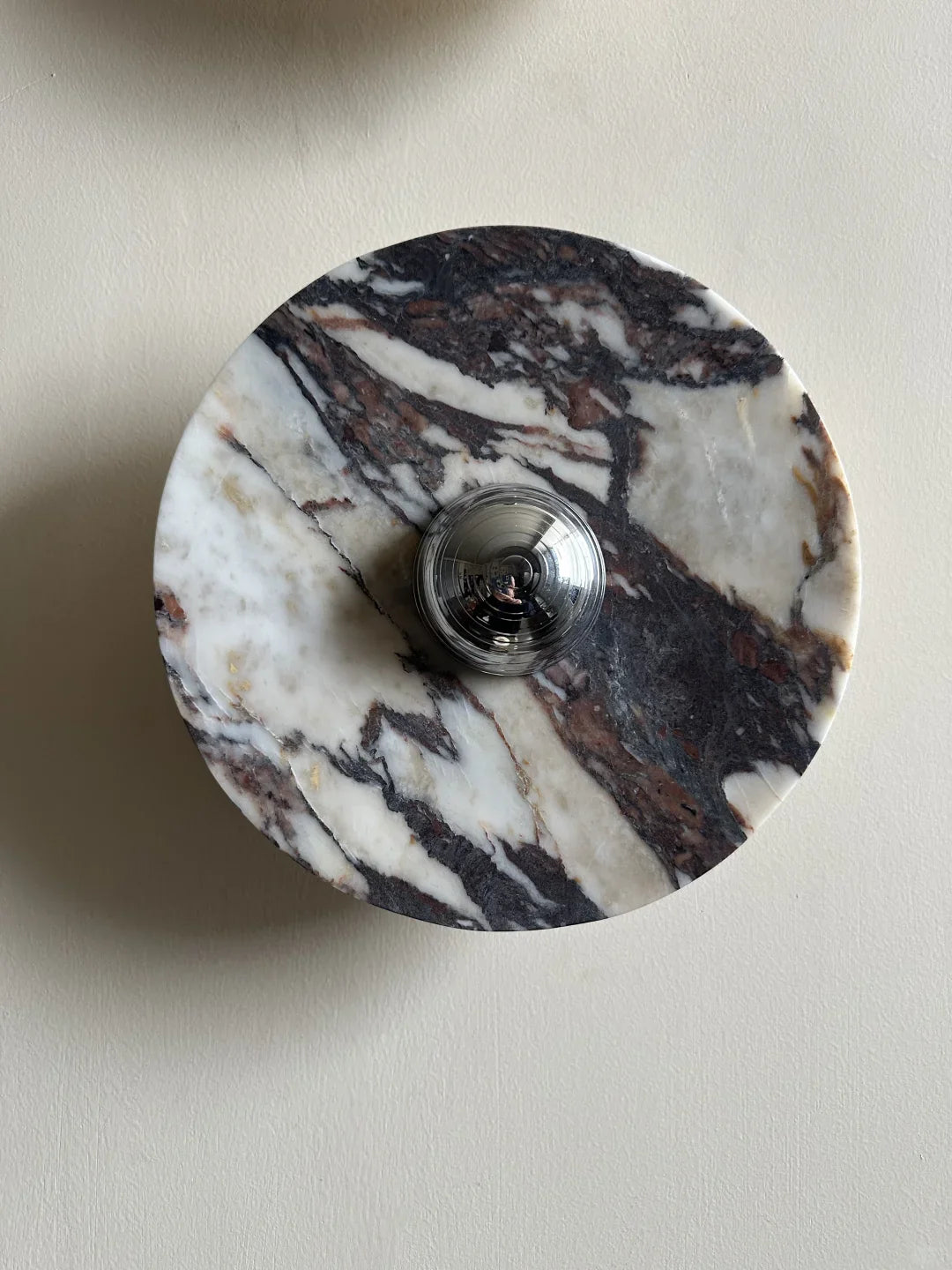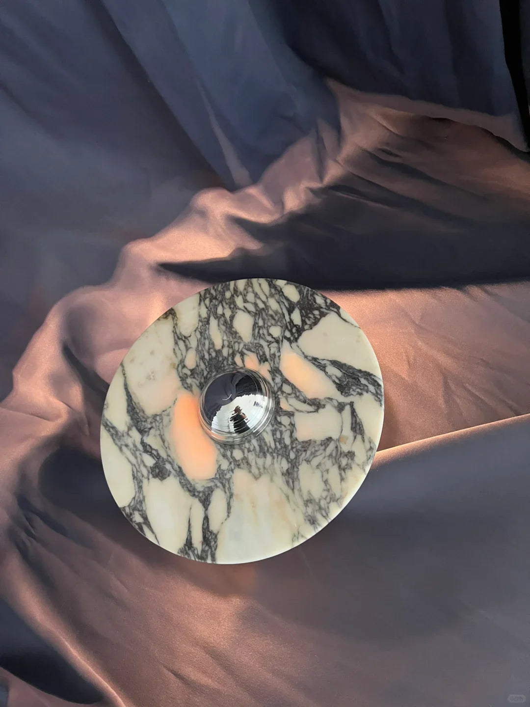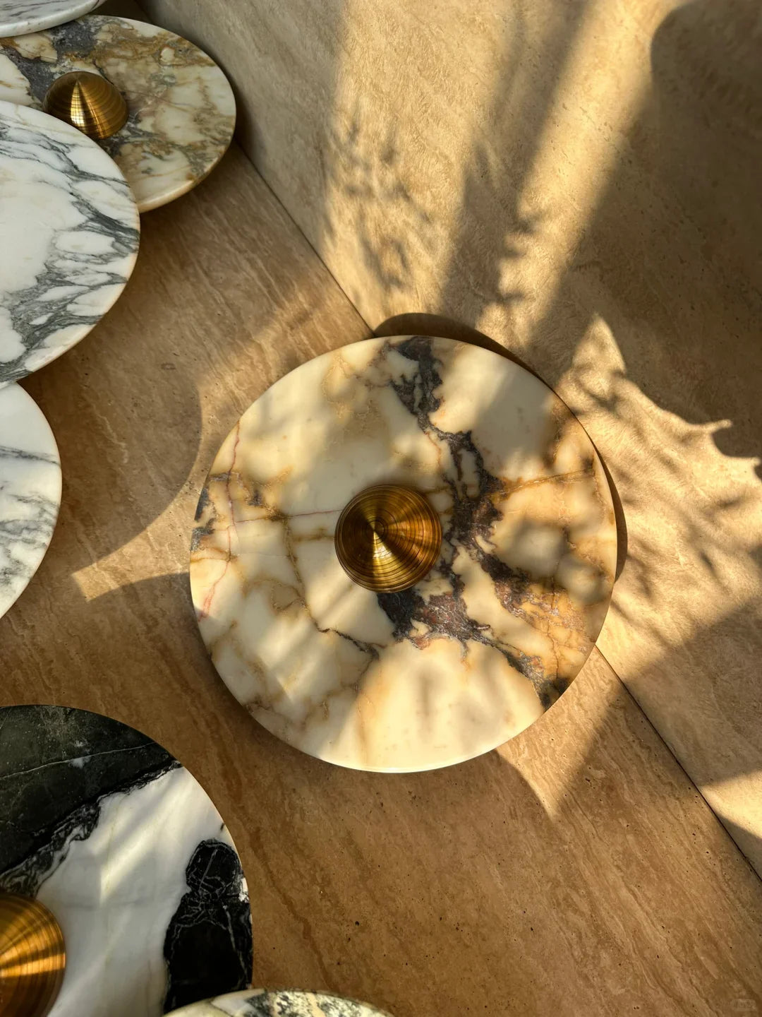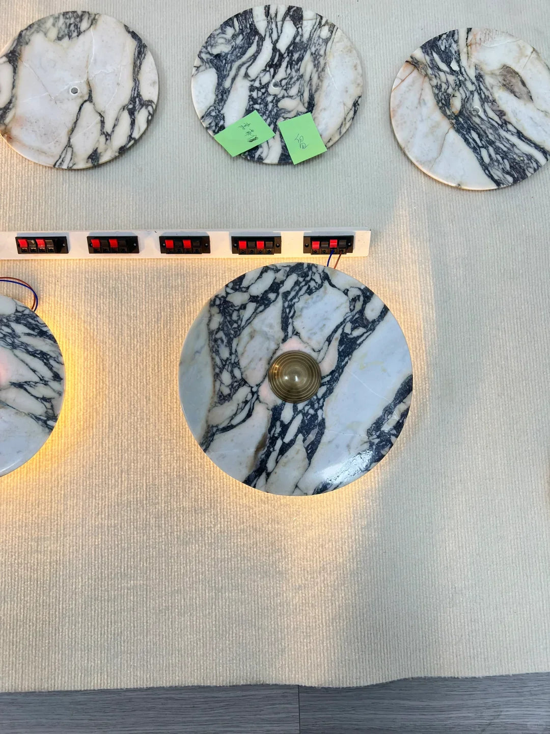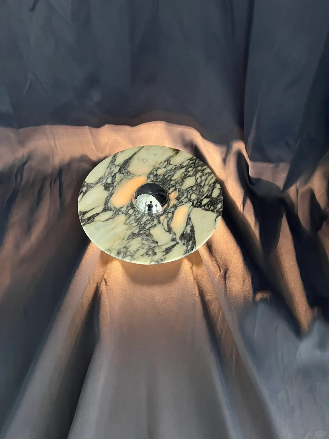 - Illuminate your space with the exquisite Calacatta Oro Round Sconce, a stunning fusion of luxury and craftsmanship. Each sconce features a diffuser crafted from premium Calacatta Oro marble, sourced from one of Italy’s oldest and most revered quarries. The marble showcases a pristine white background adorned with rich golden-beige veining, creating a striking natural pattern that adds sophistication to any room.