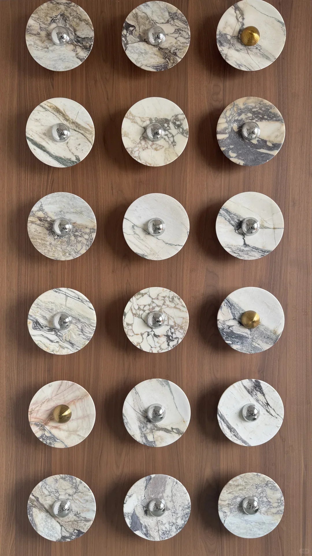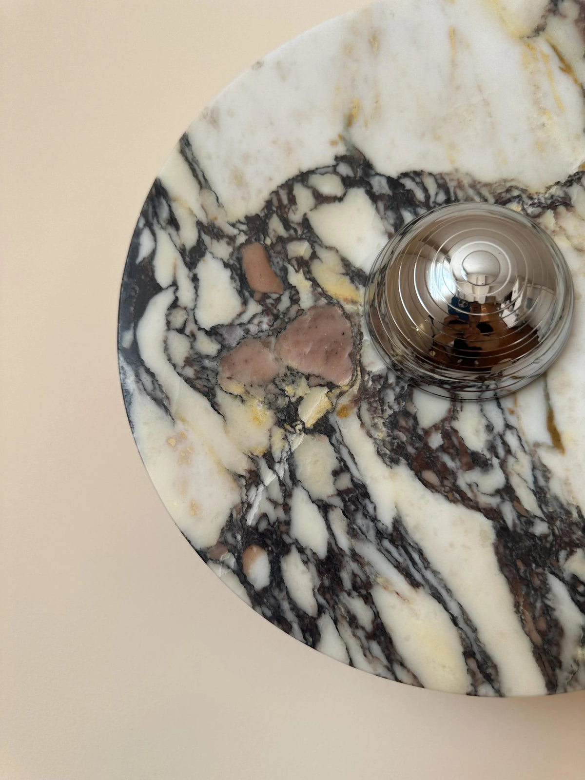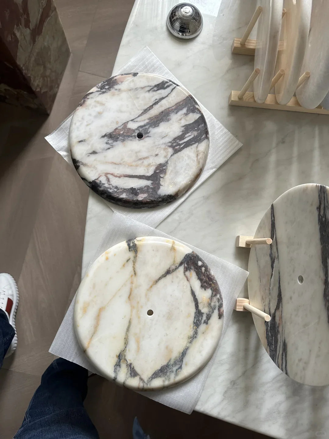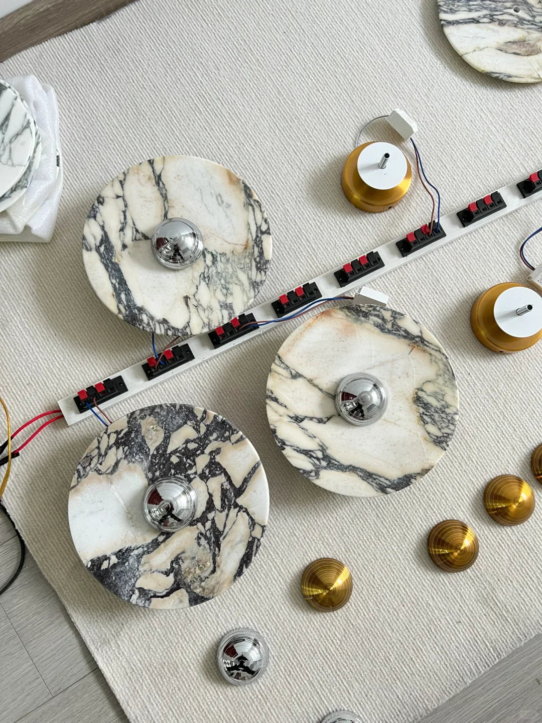 - Illuminate your space with the exquisite Calacatta Oro Round Sconce, a stunning fusion of luxury and craftsmanship. Each sconce features a diffuser crafted from premium Calacatta Oro marble, sourced from one of Italy’s oldest and most revered quarries. The marble showcases a pristine white background adorned with rich golden-beige veining, creating a striking natural pattern that adds sophistication to any room.