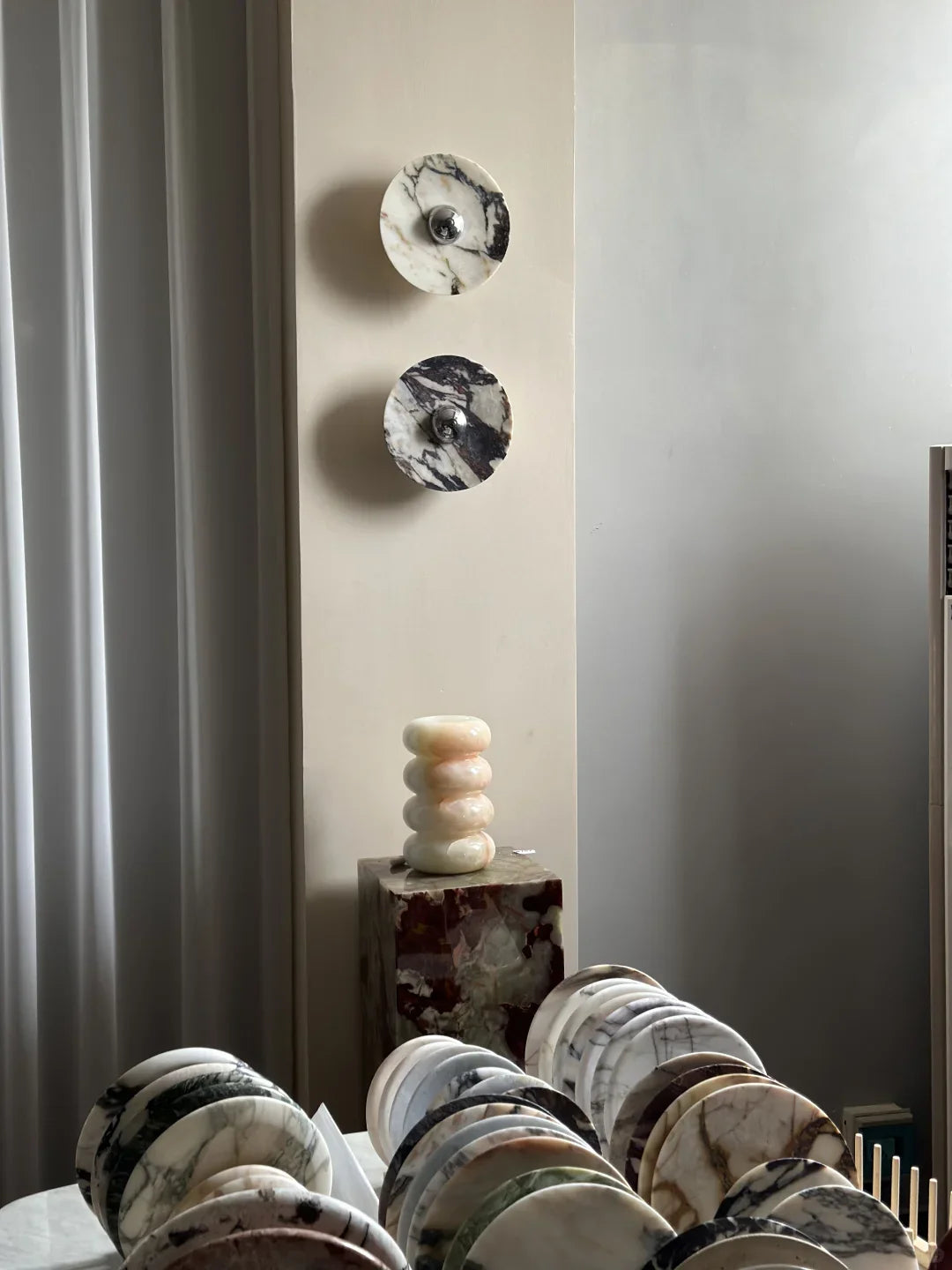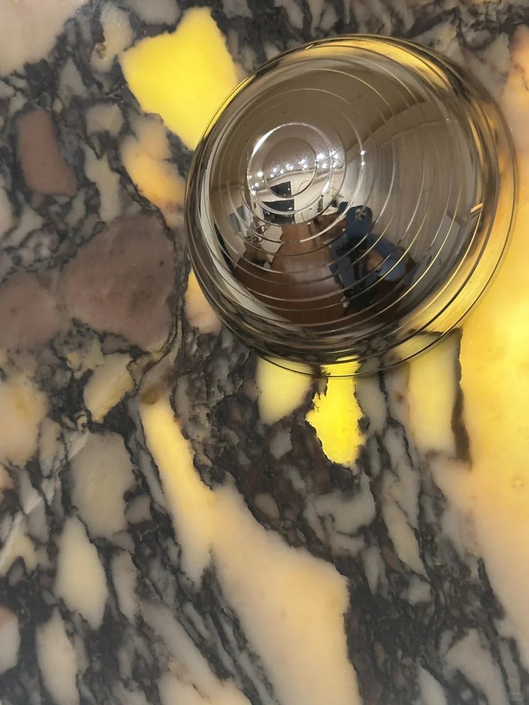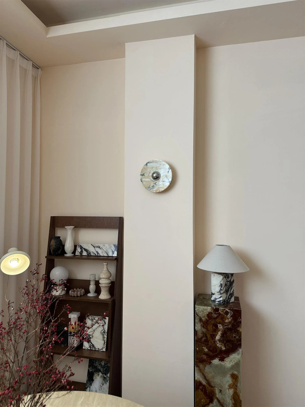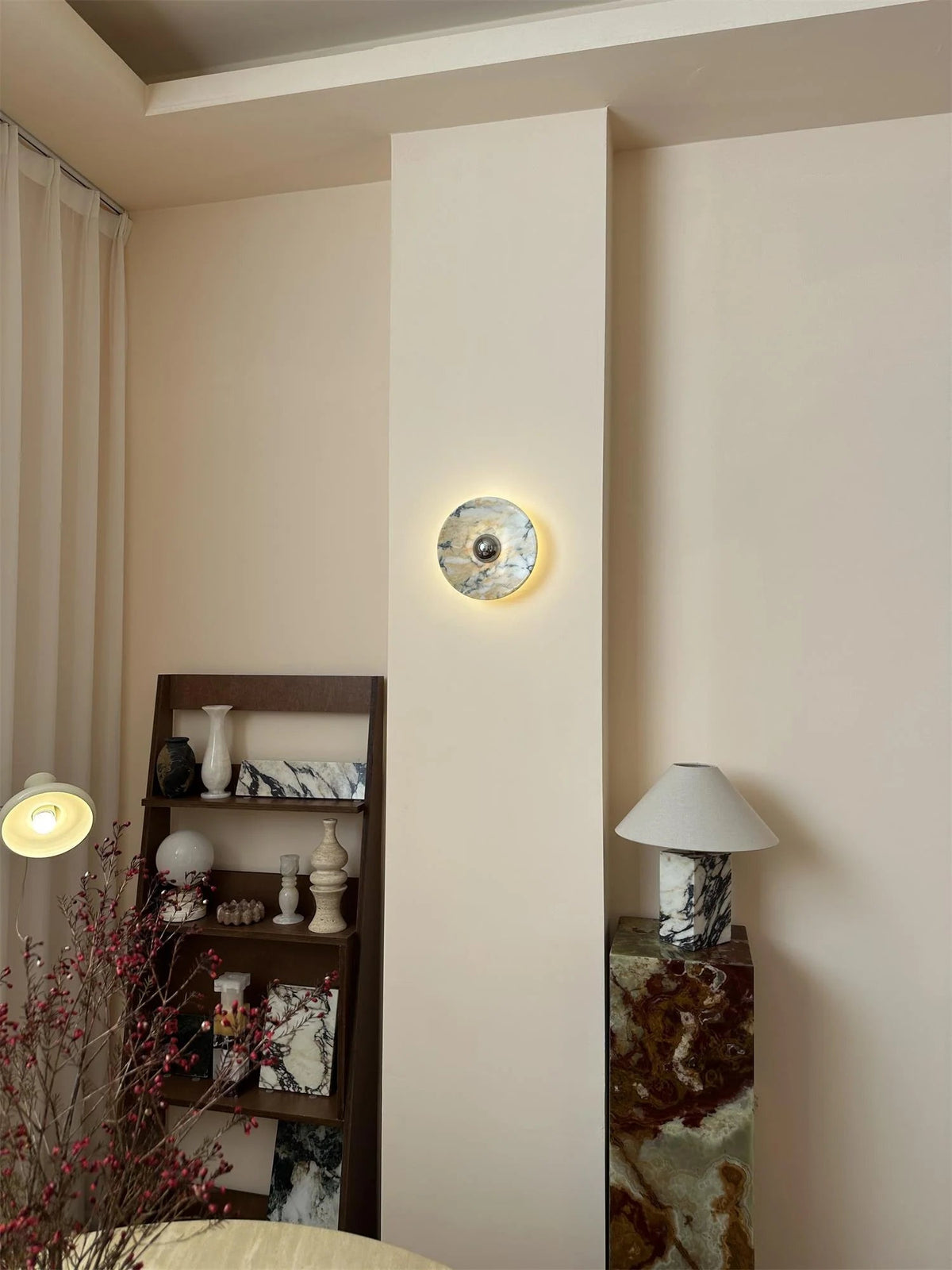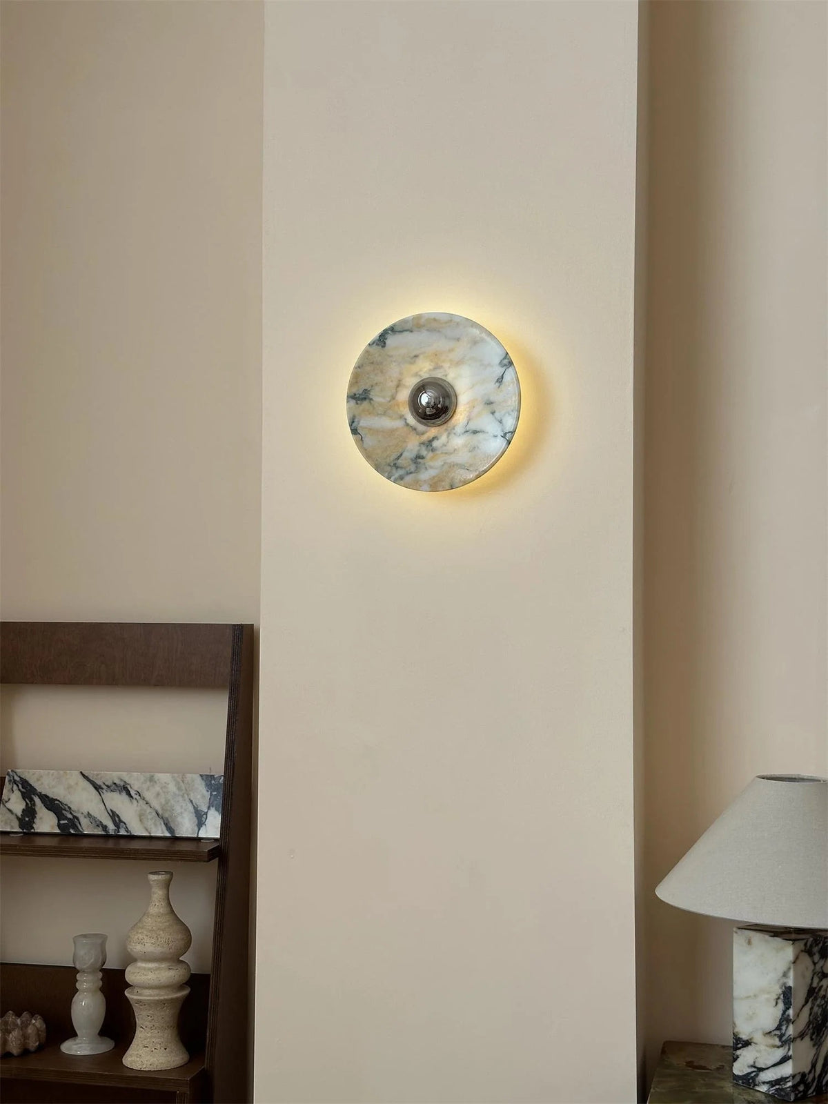 - Hand-finished to perfection, this sconce blends Old World artistry with modern design, making it a perfect accent for refined interiors—whether in a chic foyer, a glamorous bathroom, or an opulent living space. The durable marble backplate pairs seamlessly with a polished round silhouette, offering both beauty and longevity.