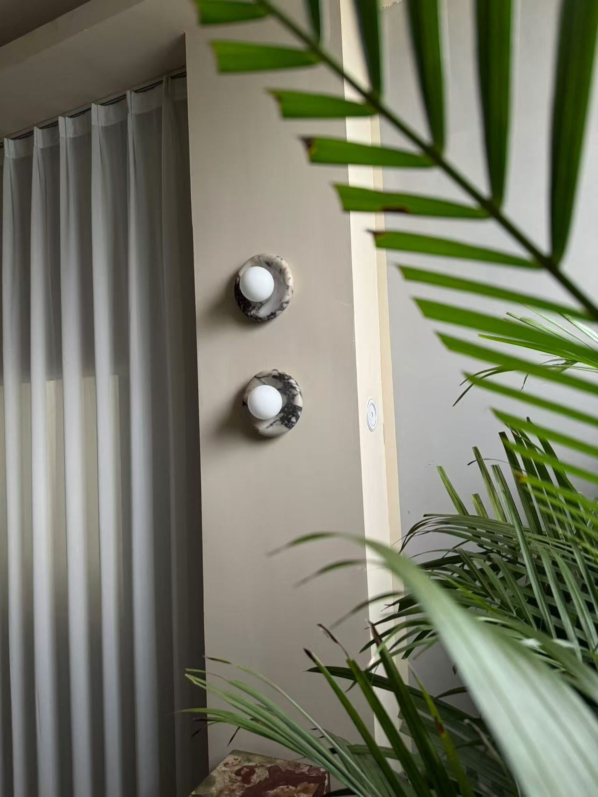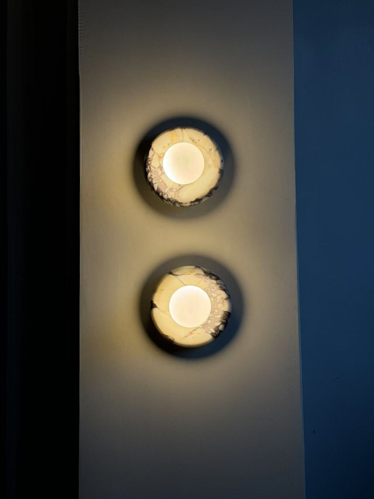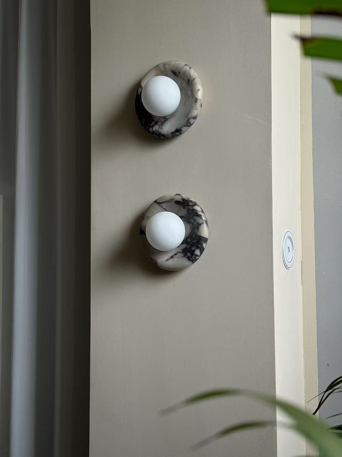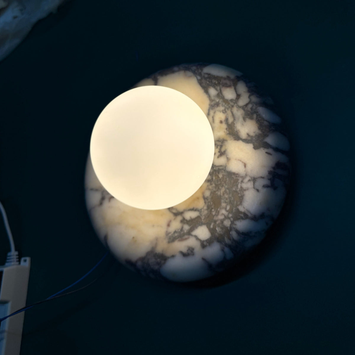 - The creamy white clasts of the marble float gracefully against a rich, red wine background, creating a dramatic and sophisticated contrast. Bold veining in deep shades of purple (viola), burgundy, and wine tones adds a unique and artistic flair, making each sconce a one-of-a-kind masterpiece.