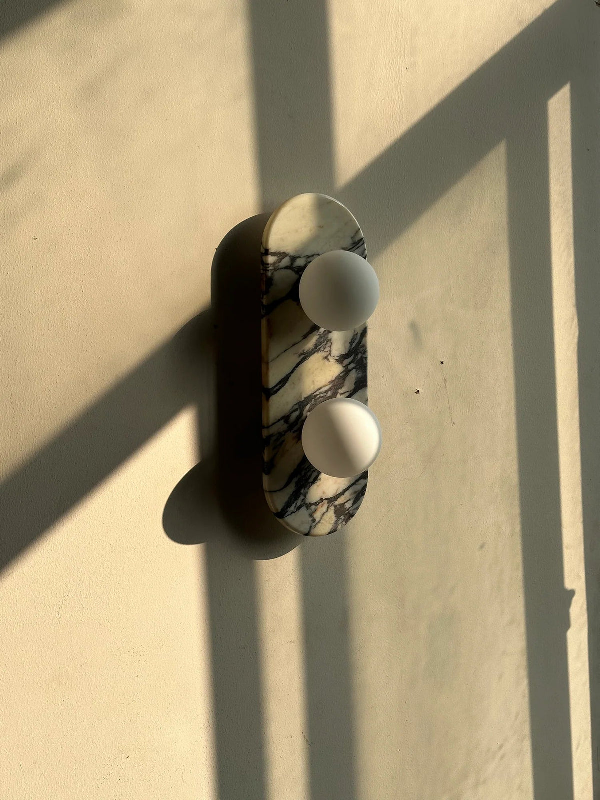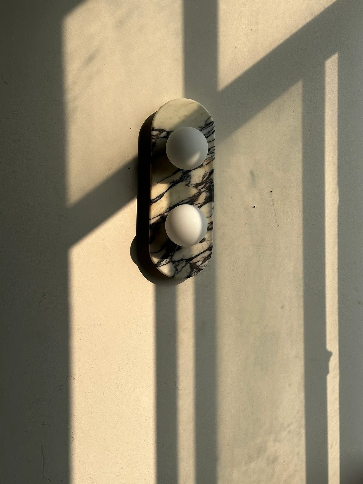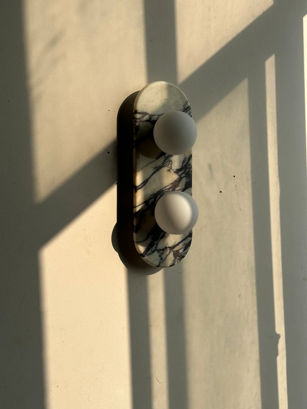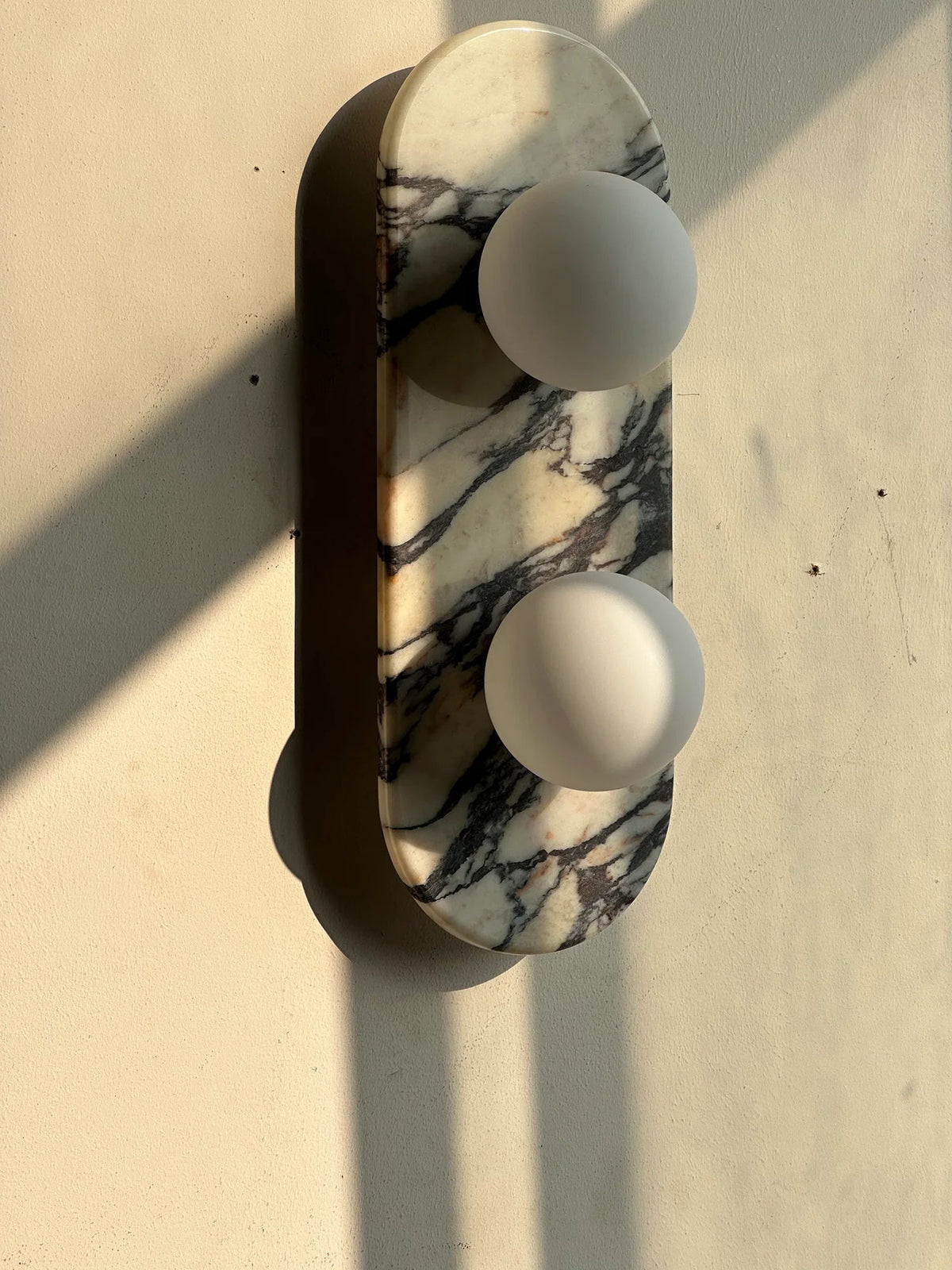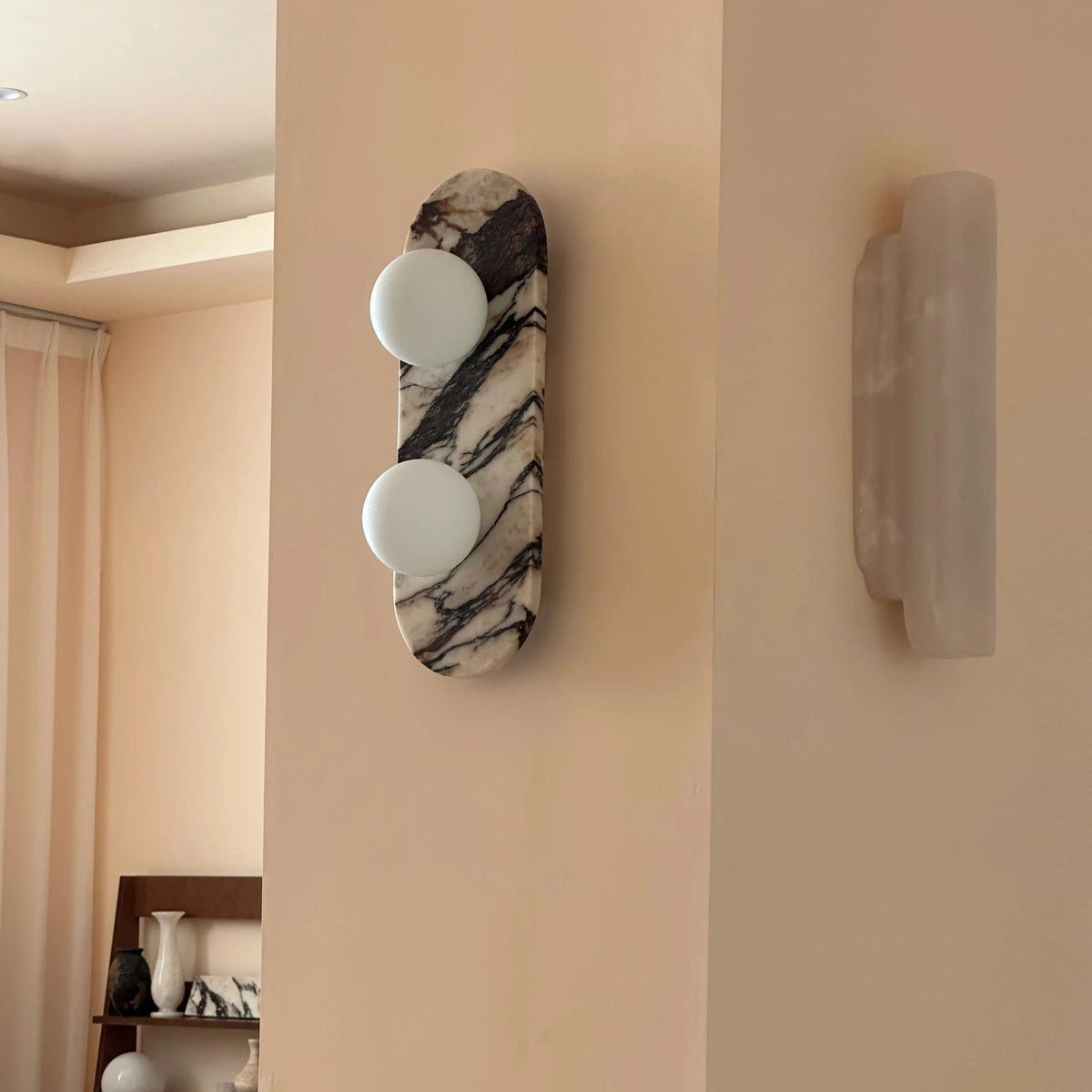 - The design features two soft-diffusing opaline glass shades, seamlessly set into the marble for a harmonious balance of warmth and sophistication. Perfect for ambient lighting in entryways, hallways, or living spaces, this sconce adds a touch of high-end Italian craftsmanship to any interior.