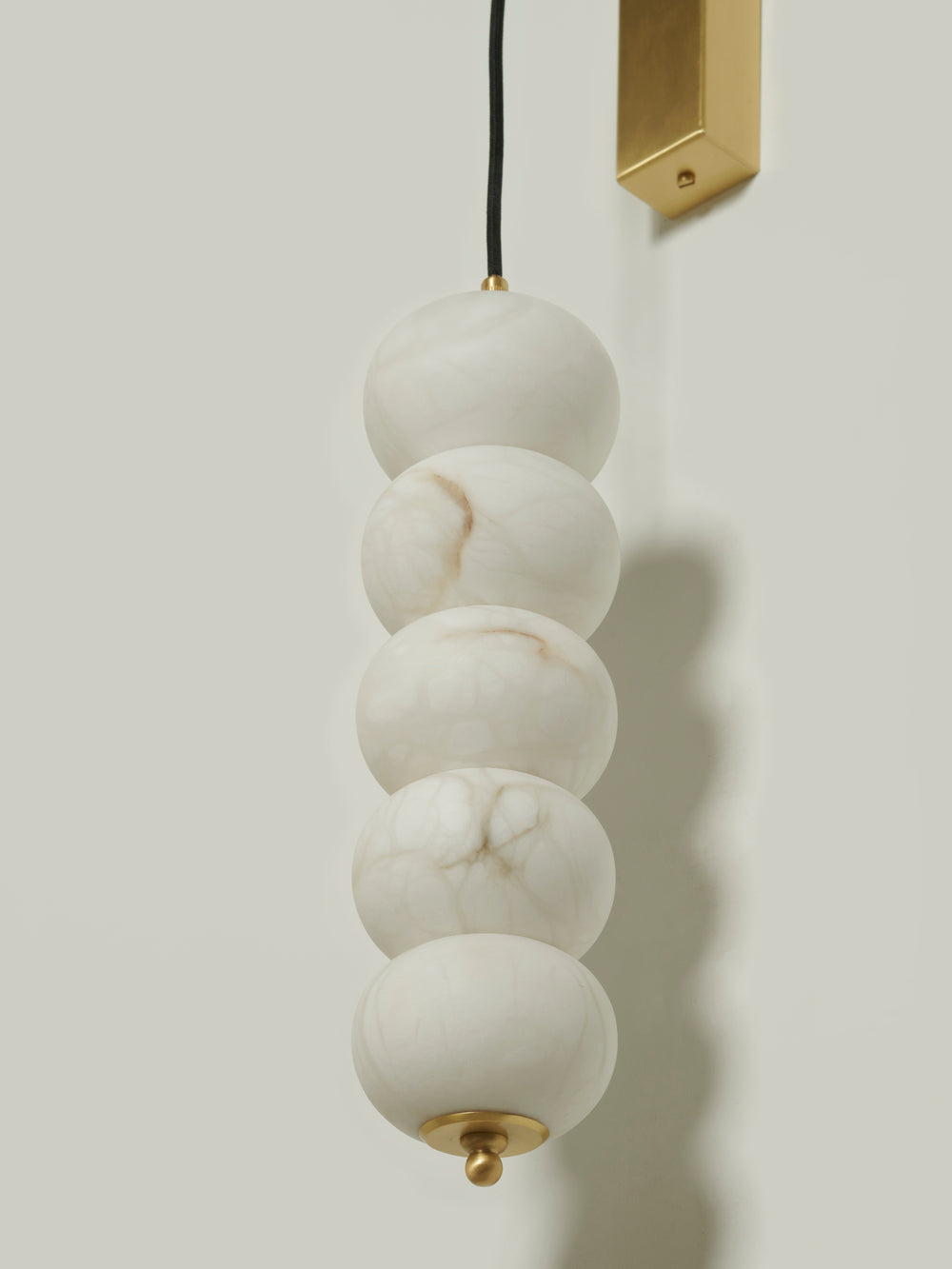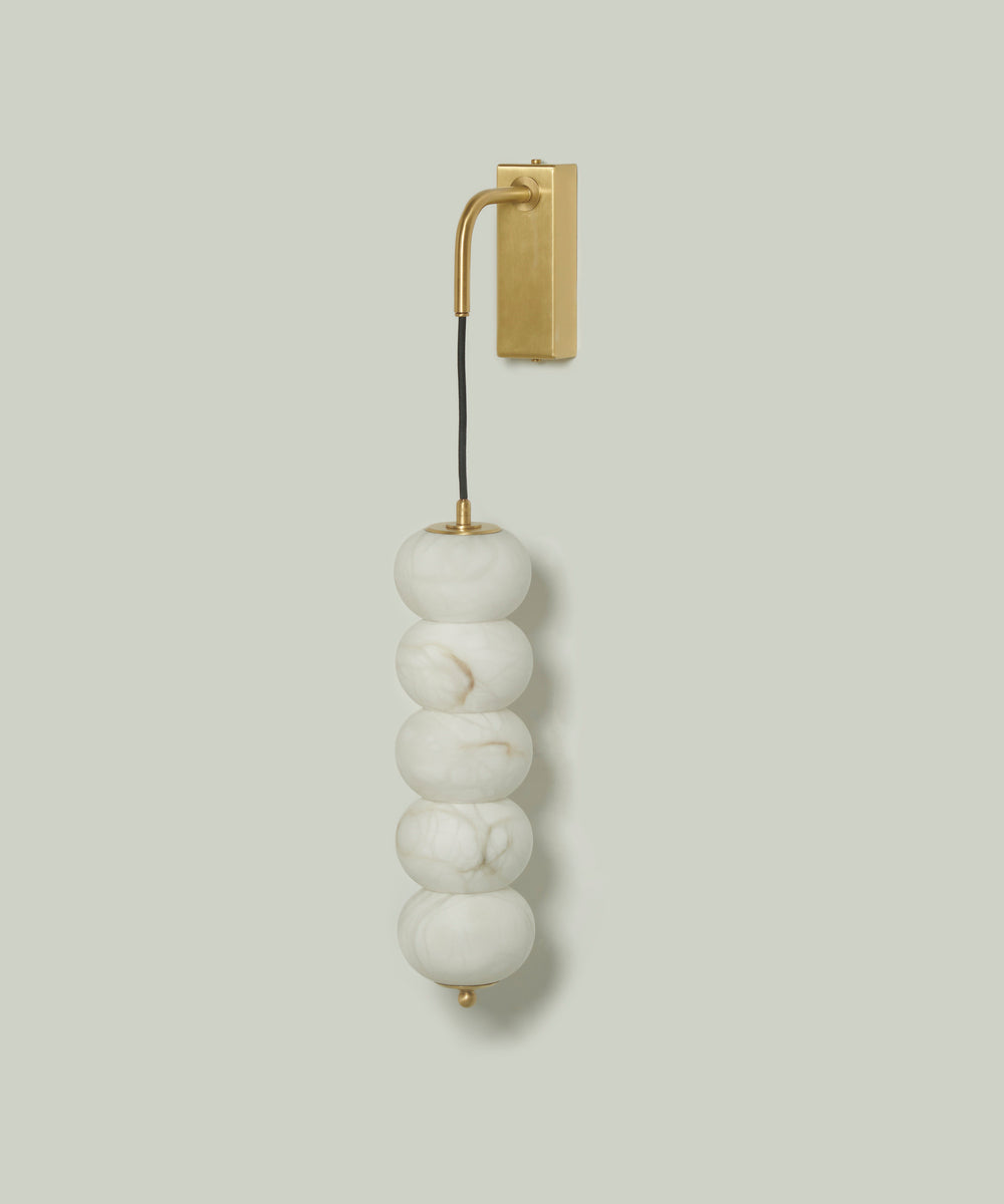 - Supporting this organic sculpture is a wall-mounted base defined by its essential, clean lines, crafted from satin brass. The choice of satin brass provides a warm, refined gleam that complements the soft, creamy hues of the alabaster without overpowering it. This deliberate contrast between the minimalist, structured metal and the soft, complex texture of the stone is a core tenet of its design. Furthermore, the visible cord and subtle brass details are not merely functional elements; they are intentional design statements. They introduce a discreet yet distinctive touch of industrial modernity, framing the composition and ensuring the sconce feels both timeless and perfectly contemporary.