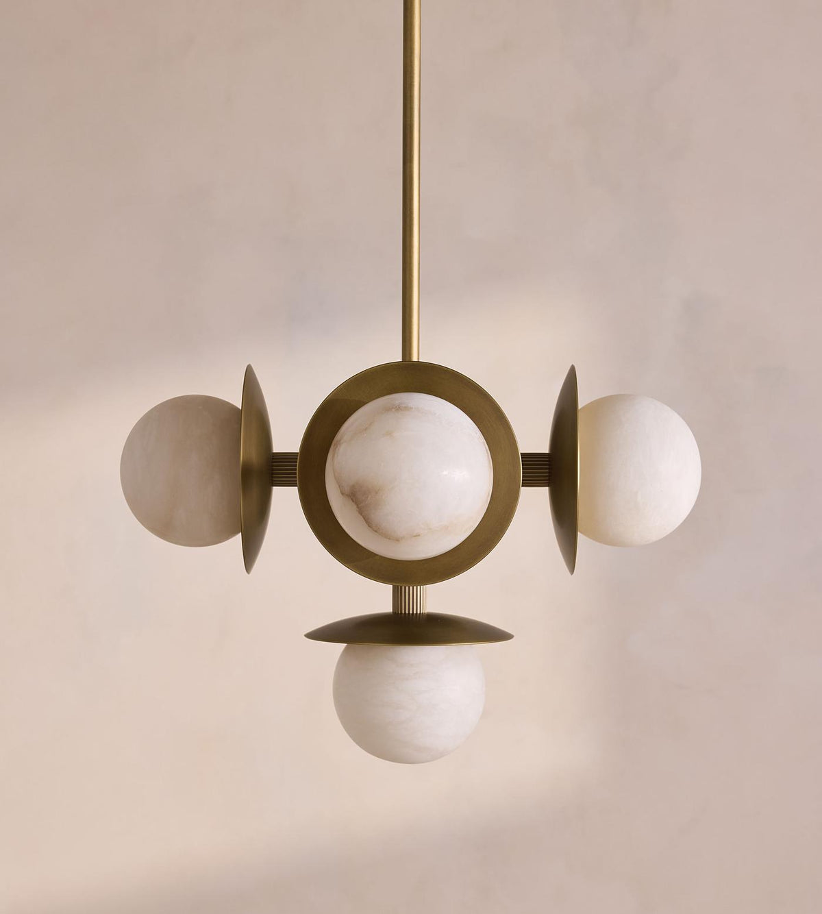 - Crafted with precision, its slim, geometric frame is fashioned from real, solid brass, ensuring a lasting luxury finish that develops a rich patina over time. Suspended within are five hand-carved alabaster stone globes, each a unique natural piece with subtle veining. When illuminated, these exquisite globes emit a soft, warm, and diffused glow that banishes harsh shadows and creates an instantly serene and inviting atmosphere.