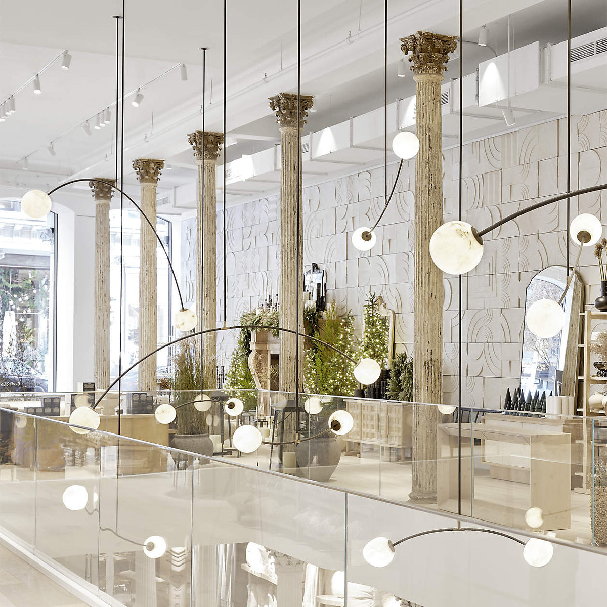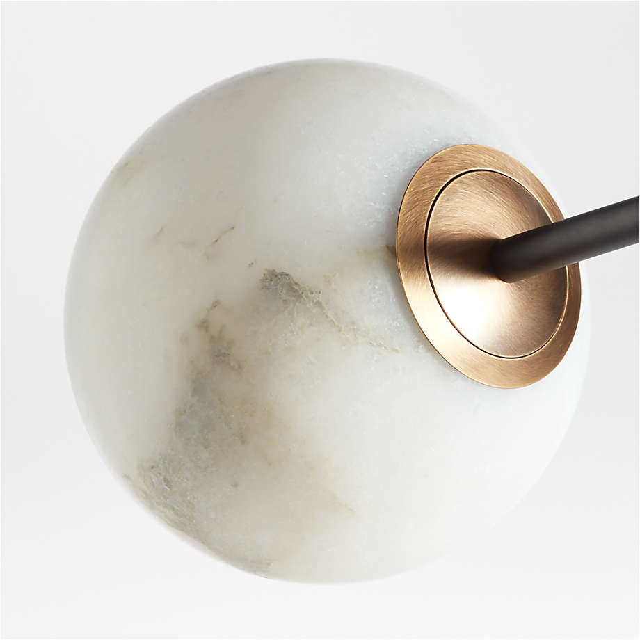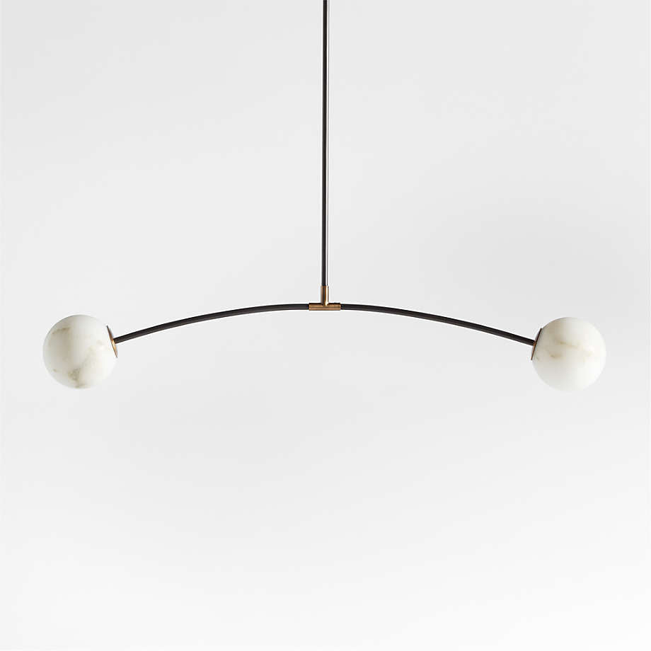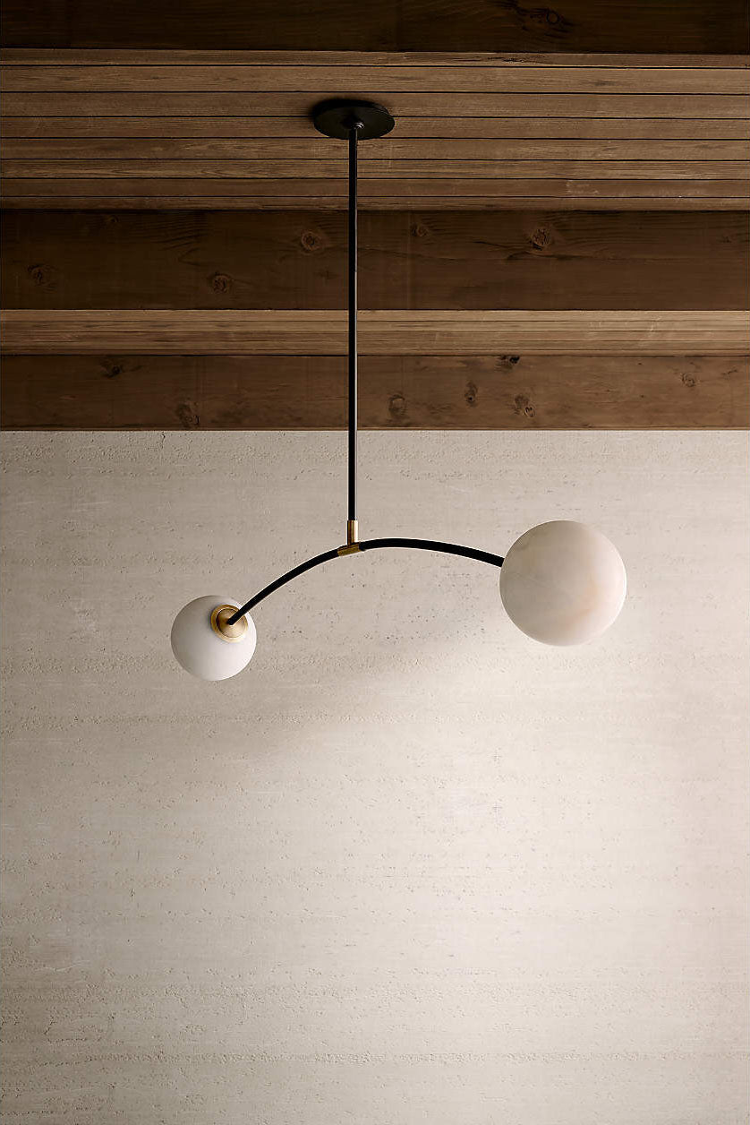- Supporting these luminous orbs is a slender and strong arc of blackened steel. Its crisp, matte finish provides a striking contrast that highlights the soft, milky texture of the alabaster, much like a drawn line emphasizing a beautiful form in a sketch. This architectural element gives the fixture a contemporary edge, ensuring it feels both timeless and of-the-moment.