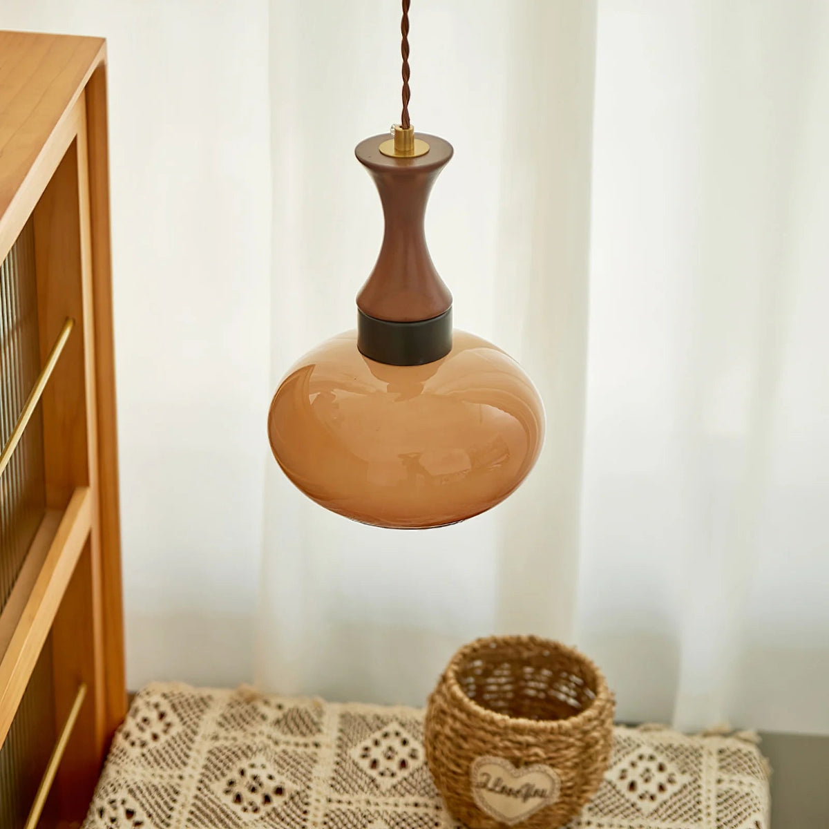 - The Chara Pendant Light combines artisanal craftsmanship and timeless design. Its hand-blown, bowl-shaped caramel glass shade exudes warmth—even when the light is off—casting a soft, inviting glow when illuminated. The natural wooden connector adds an extra layer of organic warmth, blending seamlessly with modern and rustic interiors.